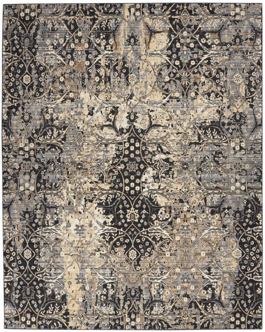 Distressed color patterns overlay an ornate all-over Persian rug design in this dramatic vintage rug from the Majestic Collection by Nourison. Abrash charcoal grey, black, and ivory spread over luxurious wool and nylon fibers for a plush, luxurious feel that brings traditional grace to any living space.