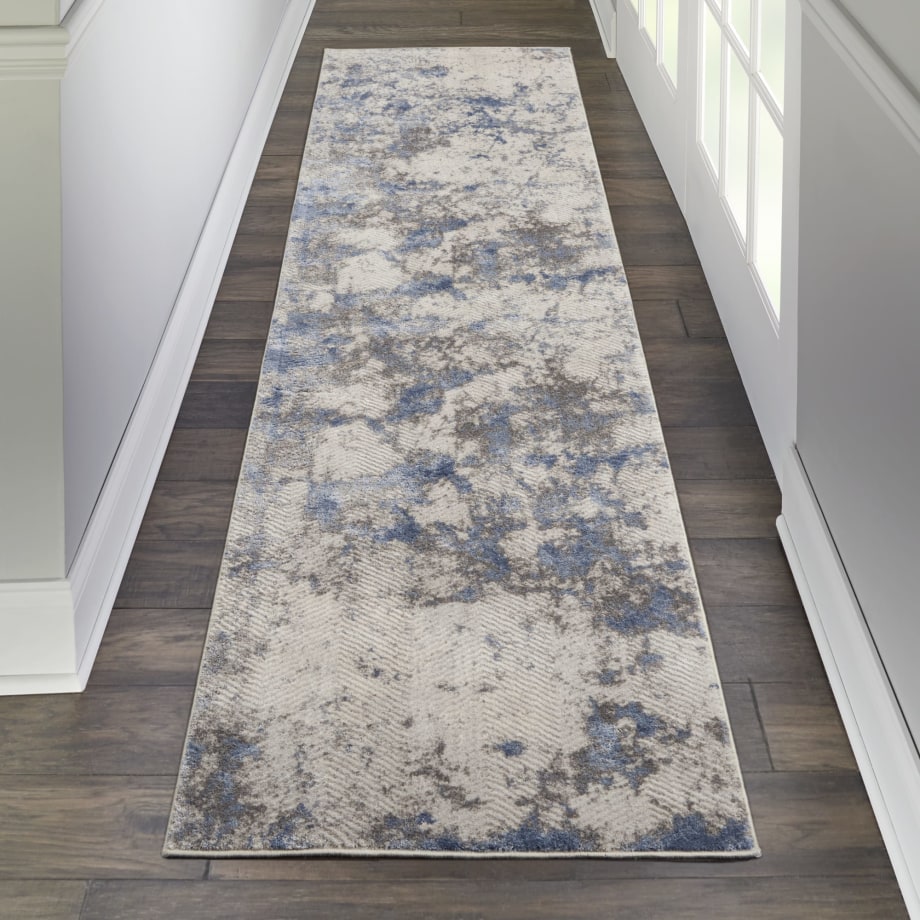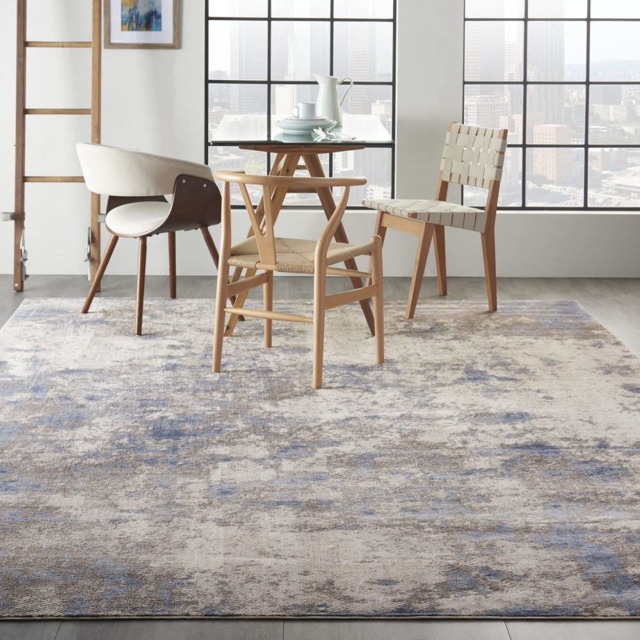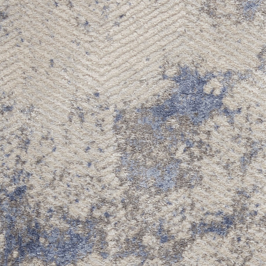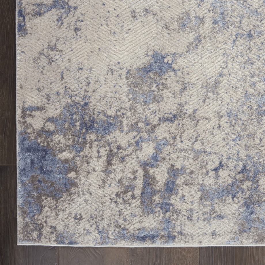 Marvelous mottled color washes across this alluring Silky Textures area rug like sunlight on a sylvan pond. Designed in shimmering tones of blue, ivory and grey, it is a fabulously versatile decorating piece that makes a subtle statement of contemporary elegance.