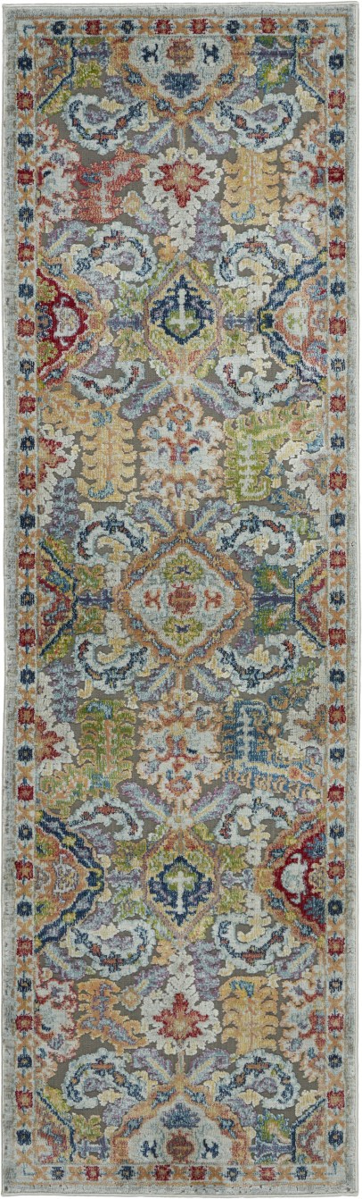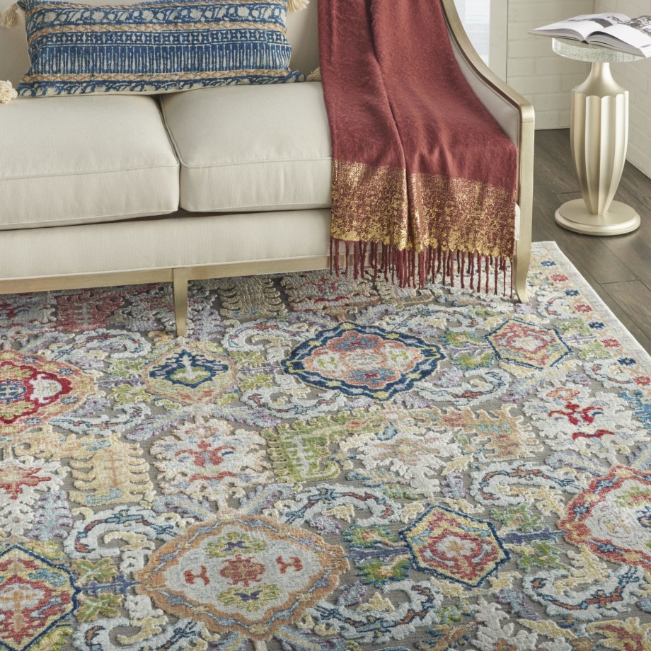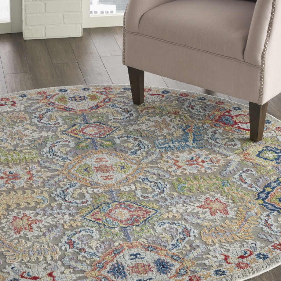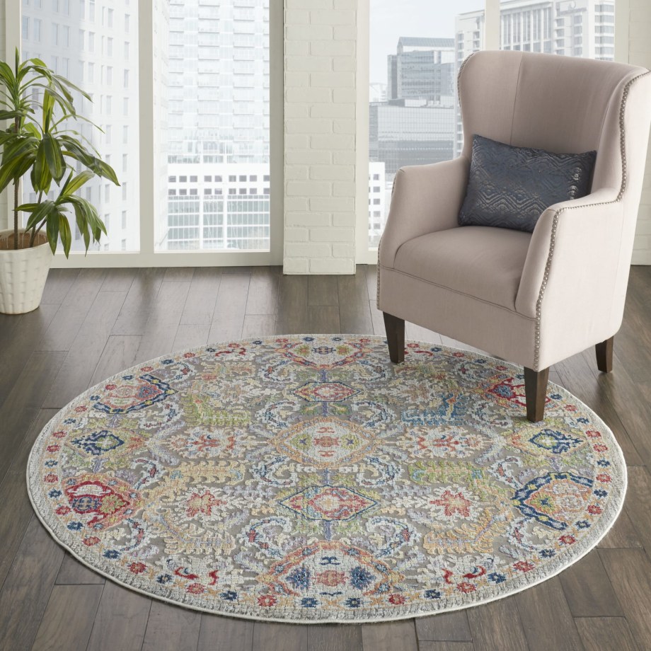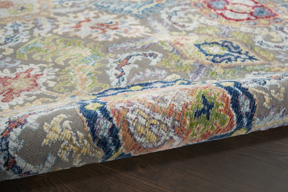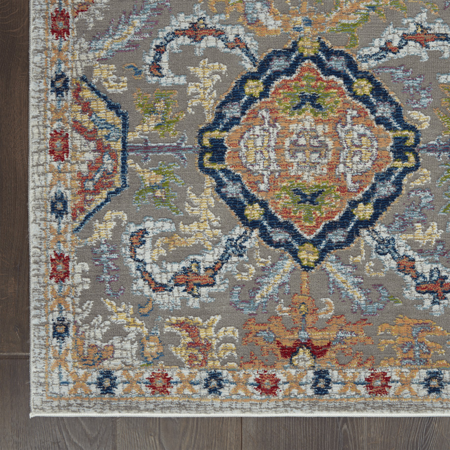 This delightful Ankara Global Collection rug features intricately detailed medallions in traditional garden motifs, for a balance of liveliness and harmony. The soft grey and multicolor palette with delicate border creates a light and airy feel, with distressed effects for a vintage look and feel. Bright colors and sheen are sure to bring an exotic touch to any decor in your home.