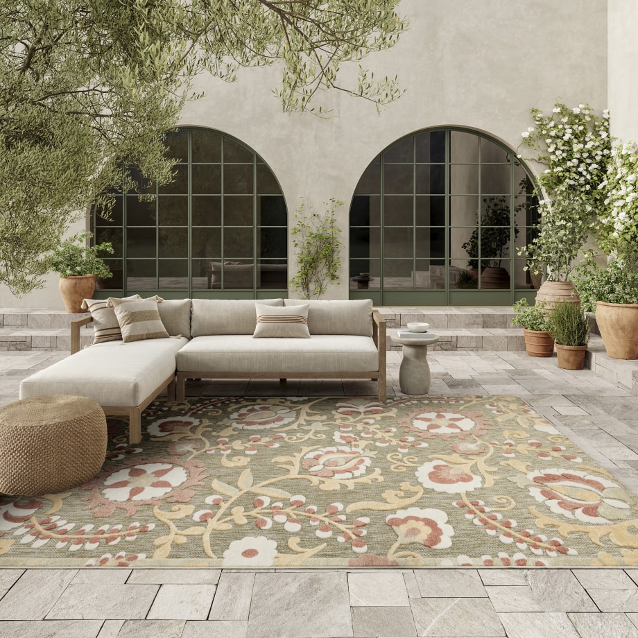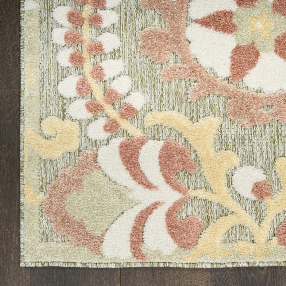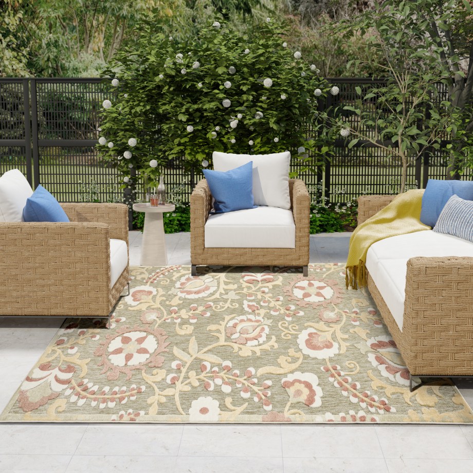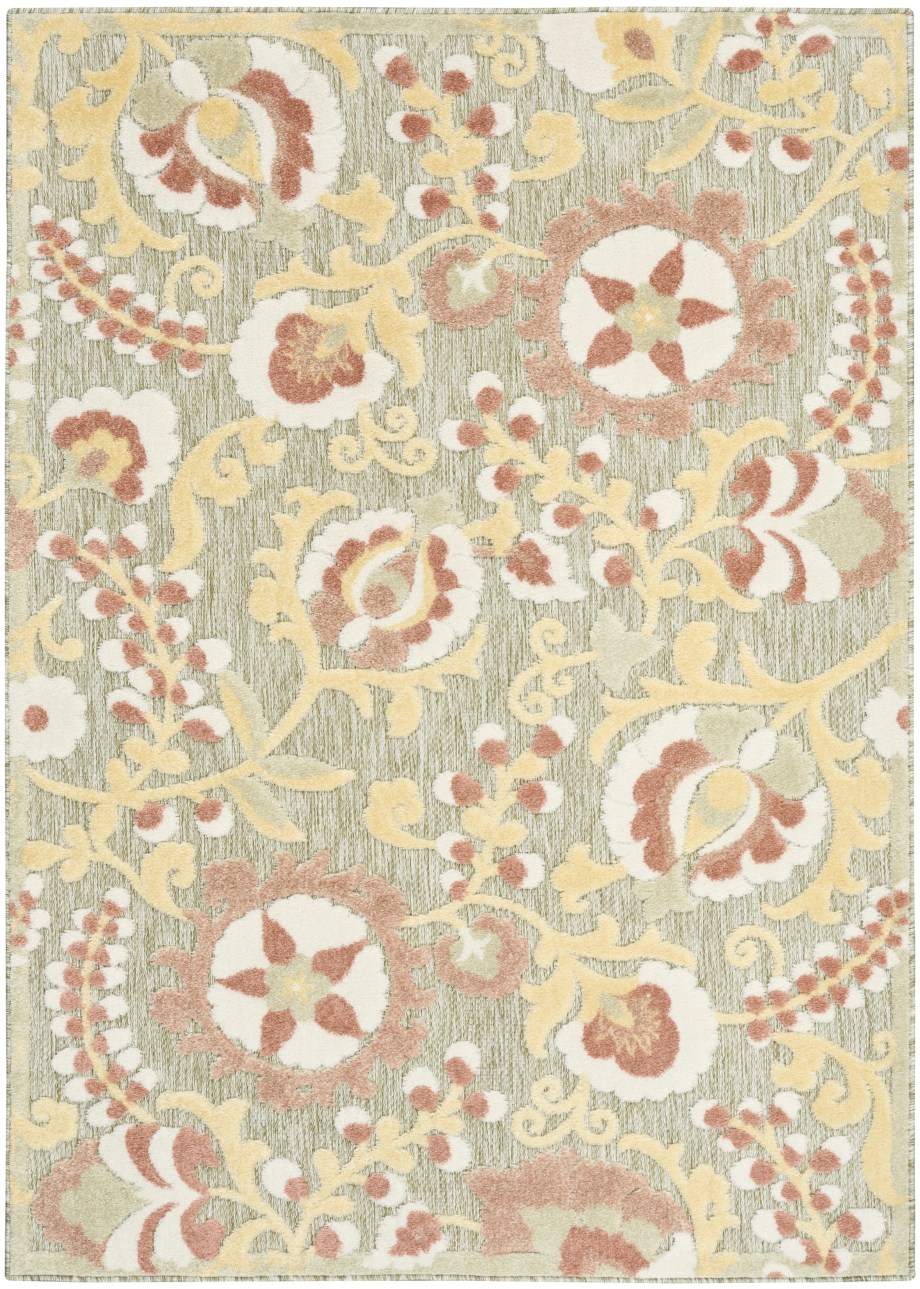 In swirling vines and flowers of rose, yellow, and sage, this Aloha outdoor rug complements your patio, porch or poolside setting. A high-low weave combines textural patterns with an intricately woven base for exceptional look that stands up to the elements. Machine-made from premium stain-resistant fibers that are easily washable with a hose: simply rinse and allow both sides time to fully air dry.