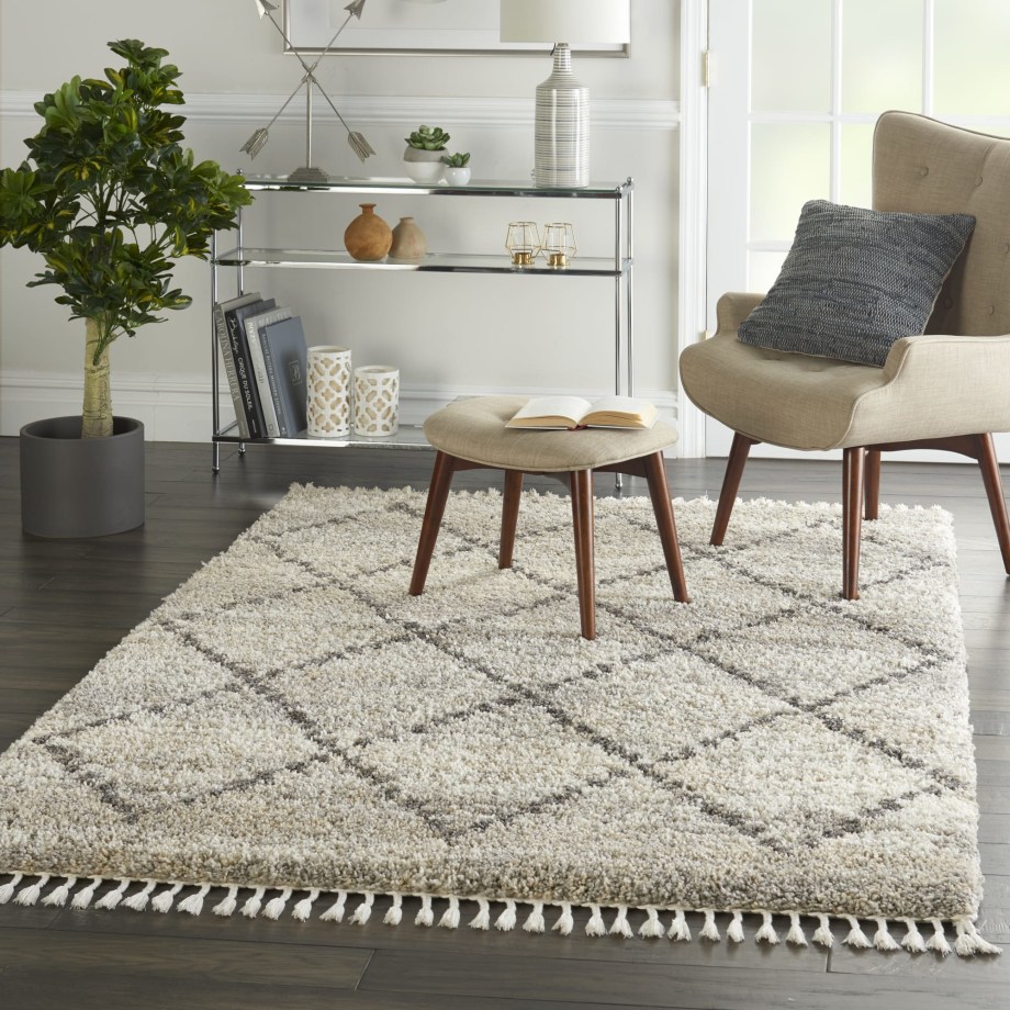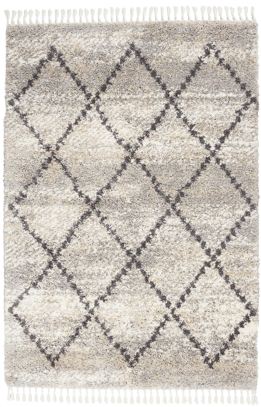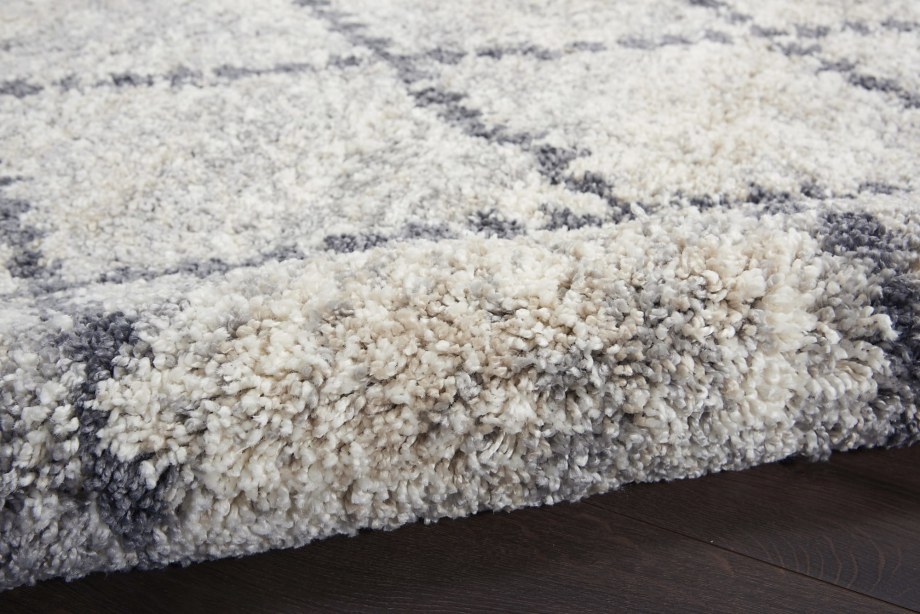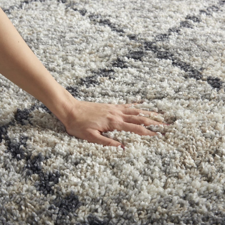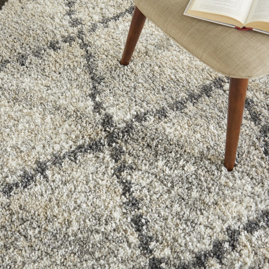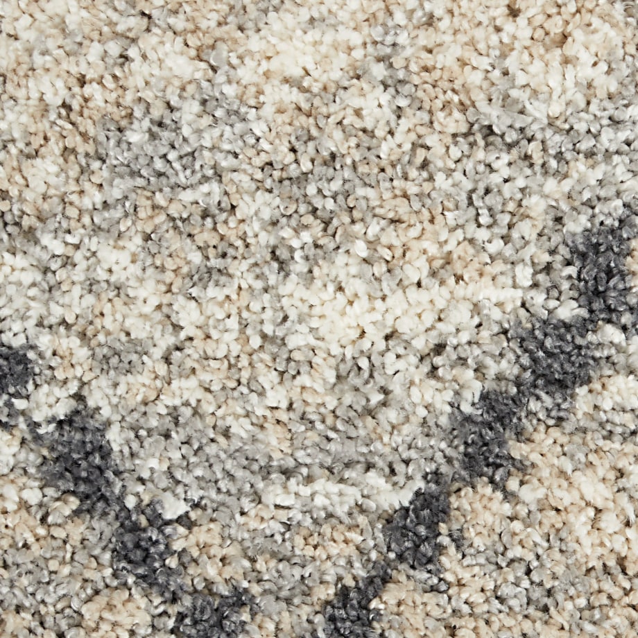 Sleek silvery grey shades create a subtle mottled background for the lattice grid of this Scandinavian tribal rug from Nourison's Oslo Collection. With a look that brings contemporary and ancient styles together, this rug is at home in any decor setting, with easy-care fibers and plush, welcoming shag texture.