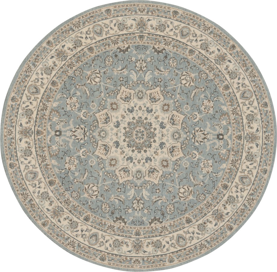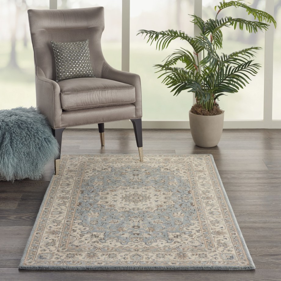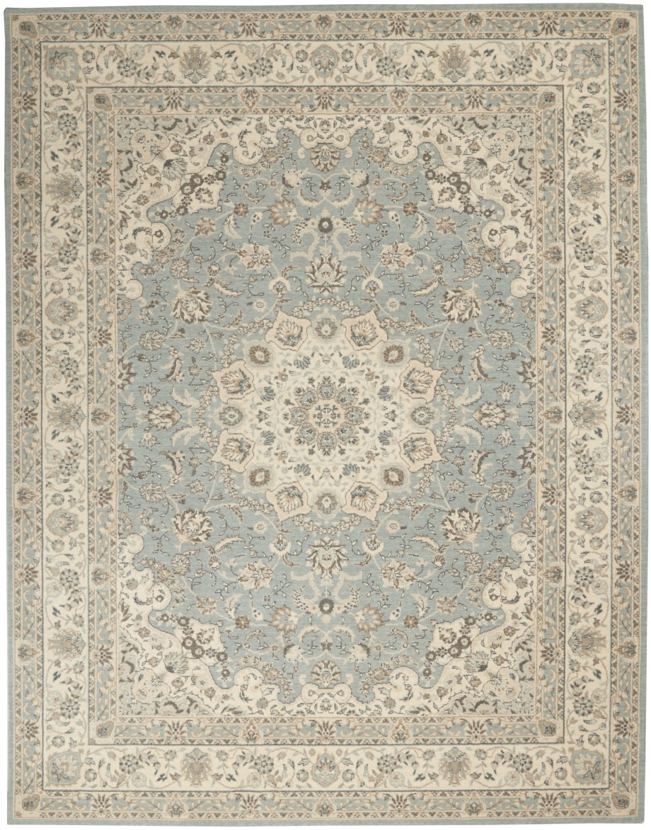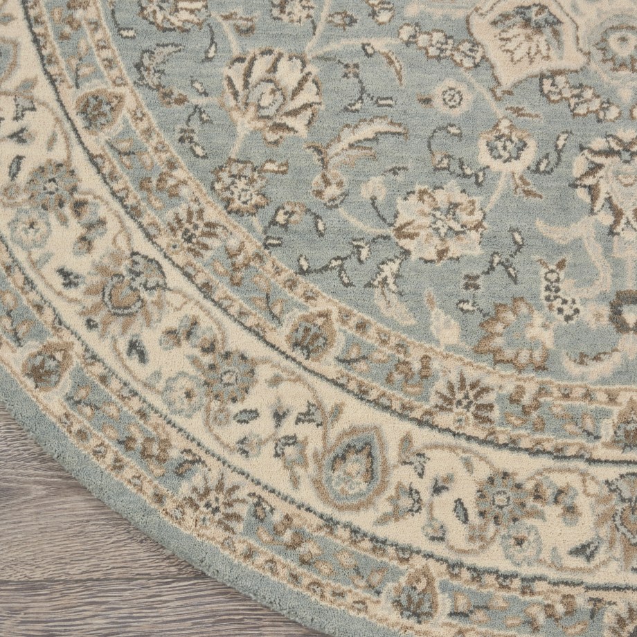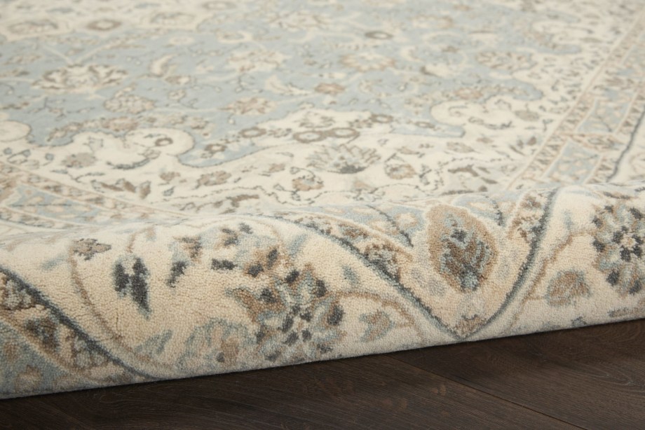 Timeless Persian design in harmonious hues of aqua blue and ivory bring intricate flowers to life. Center medallion lends a subtle kaleidoscope to the bordered design. Rich wool with saturated, yet subtle colors conveys an understated elegance.
