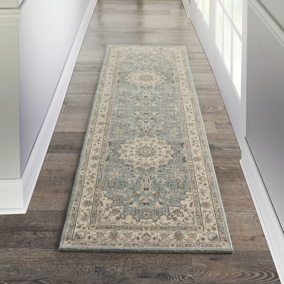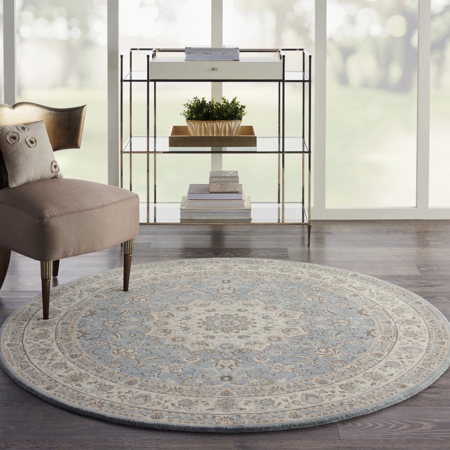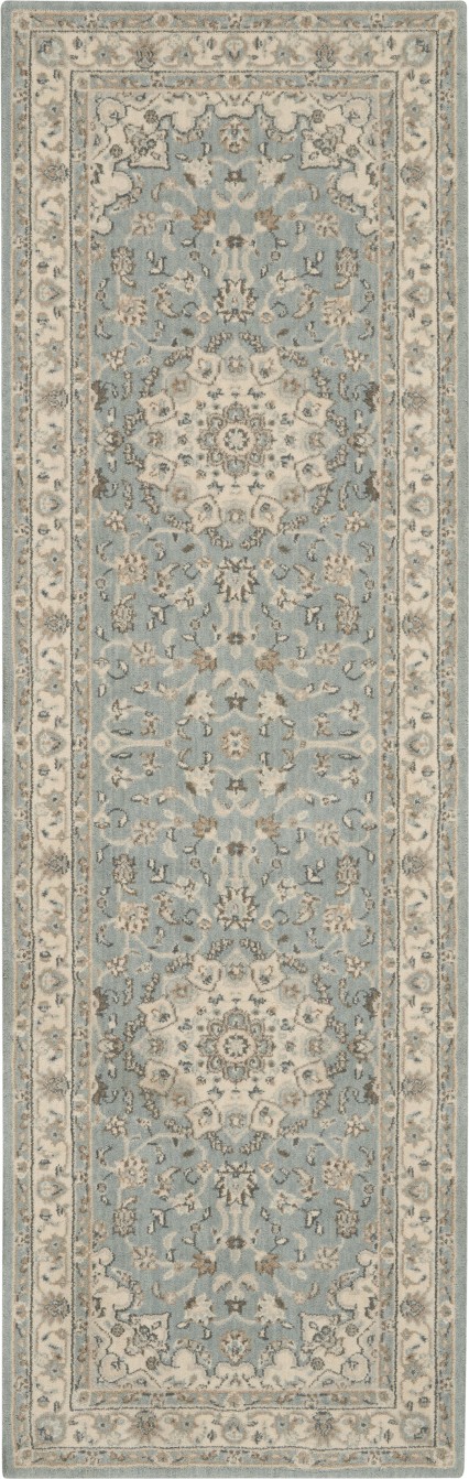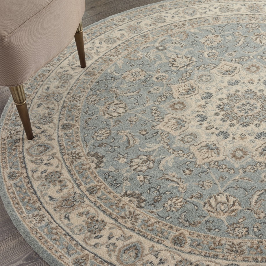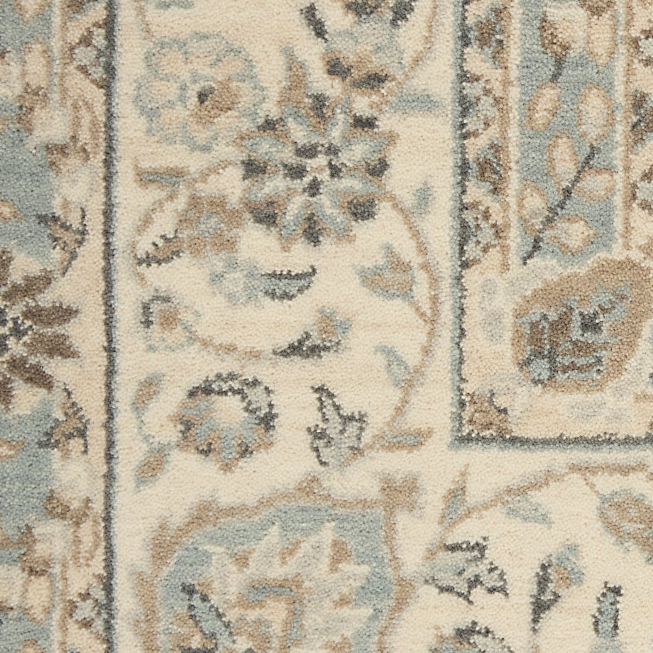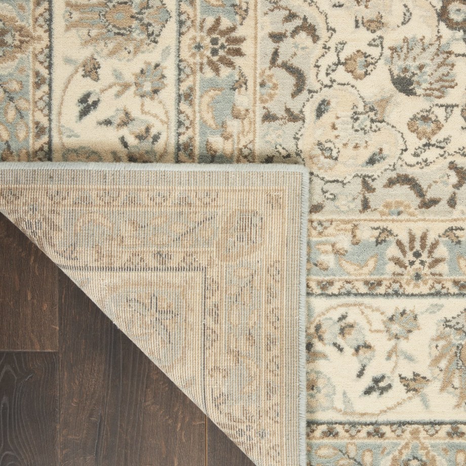 Timeless Persian design in harmonious hues of aqua blue and ivory bring intricate flowers to life. Center medallion lends a subtle kaleidoscope to the bordered design. Rich wool with saturated, yet subtle colors conveys an understated elegance.
