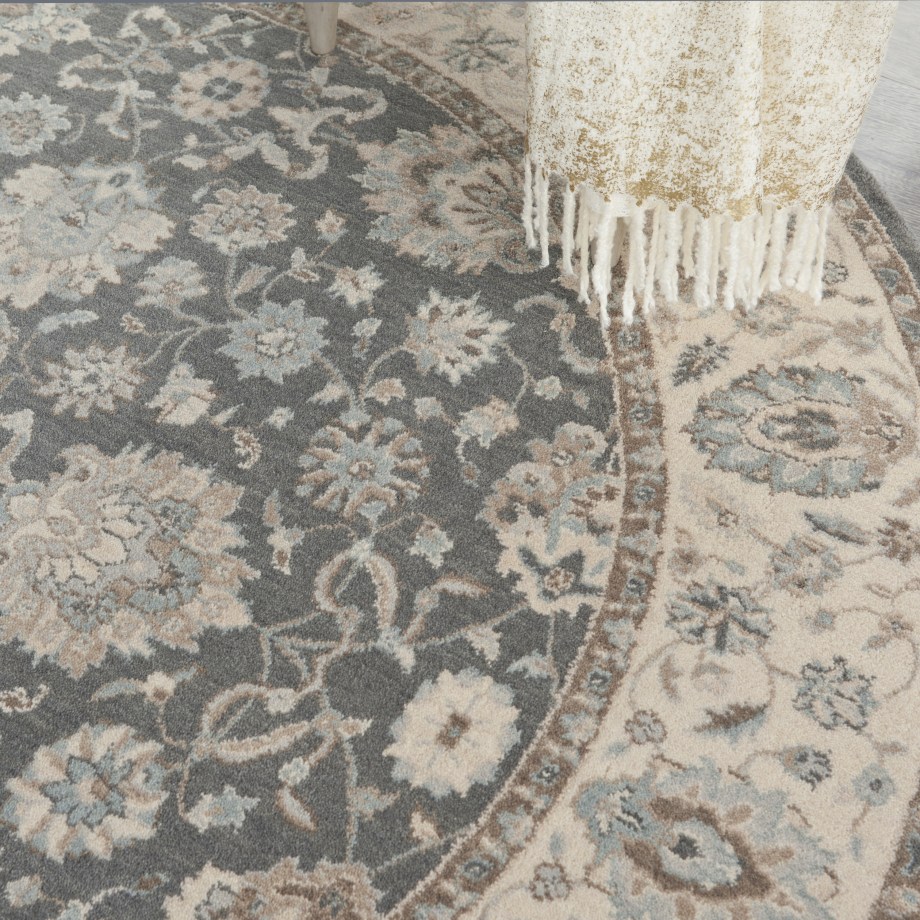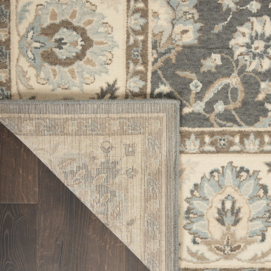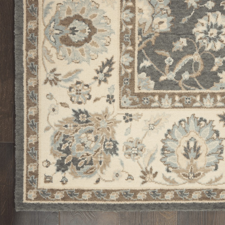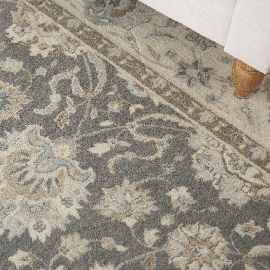 Iconic Persian design with floral border framing a symphony of flowers in neutral tones of grey and ivory. Rich wool with saturated, yet subtle colors conveys an understated elegance.