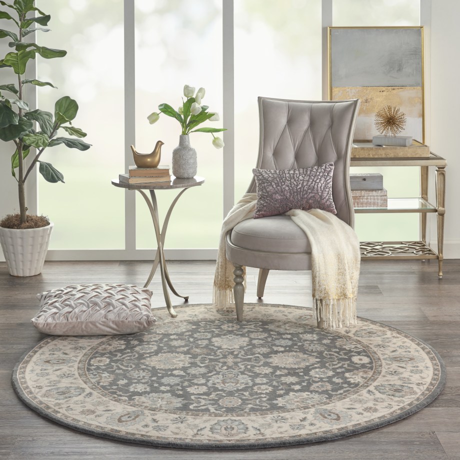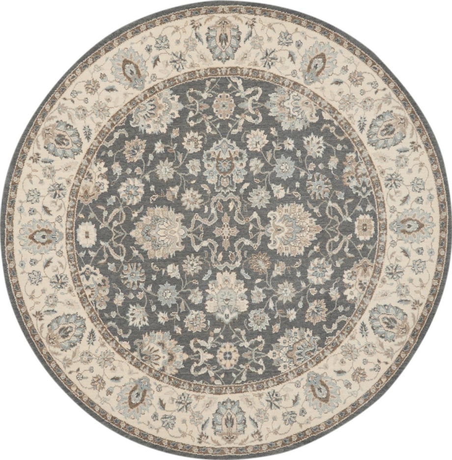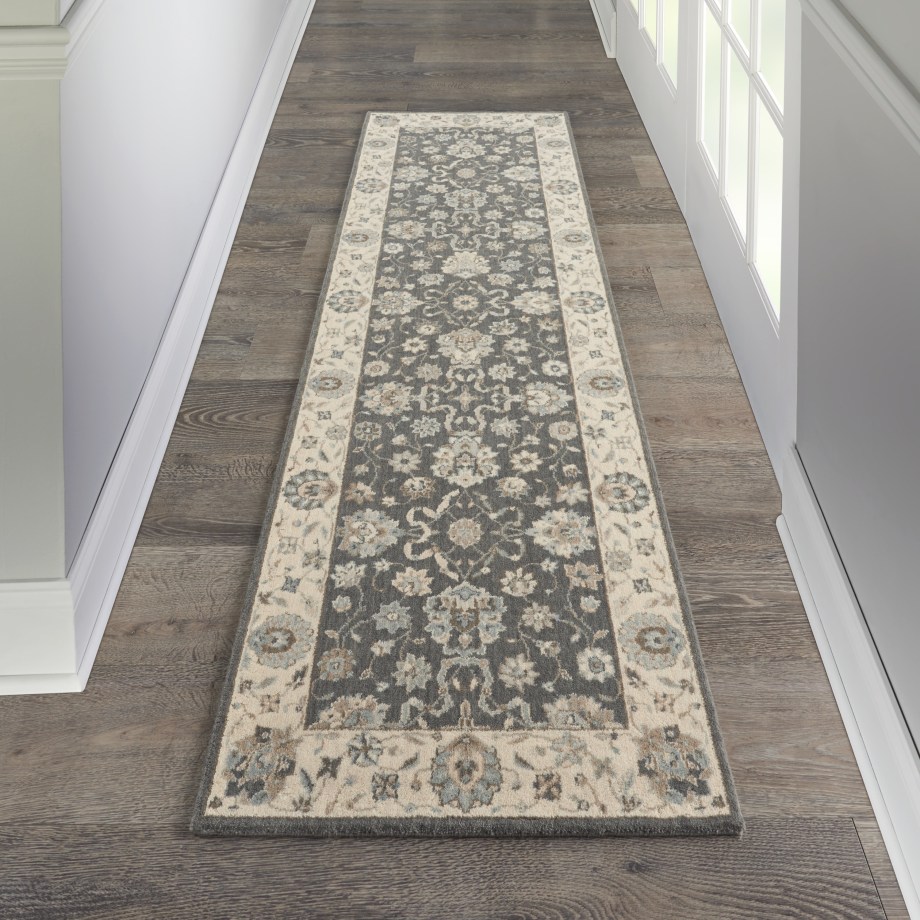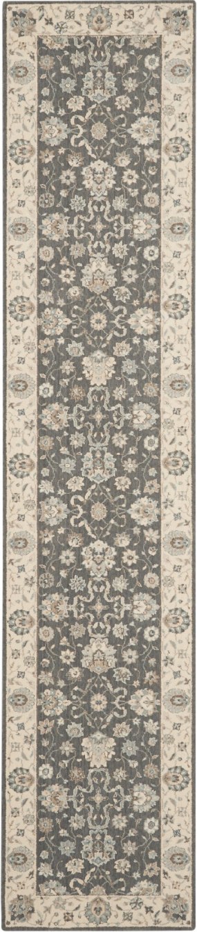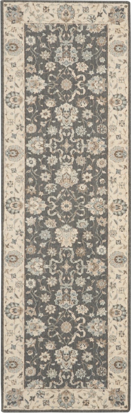 Iconic Persian design with floral border framing a symphony of flowers in neutral tones of grey and ivory. Rich wool with saturated, yet subtle colors conveys an understated elegance.