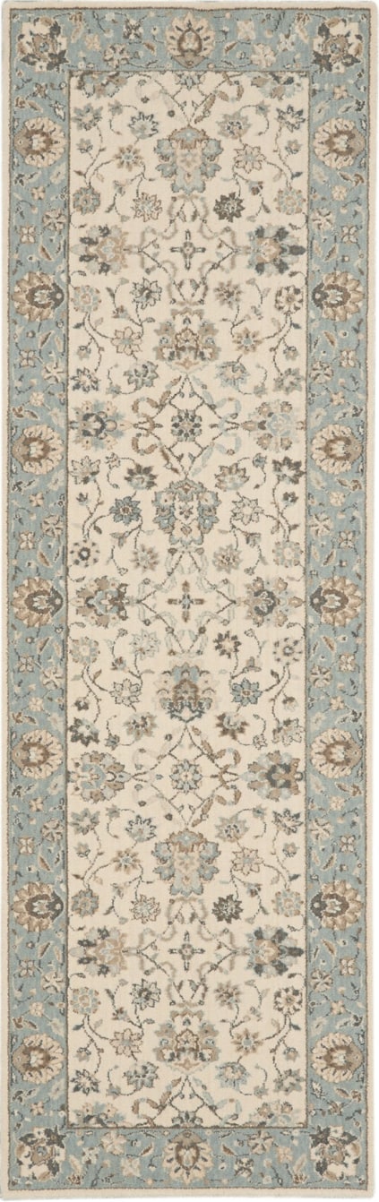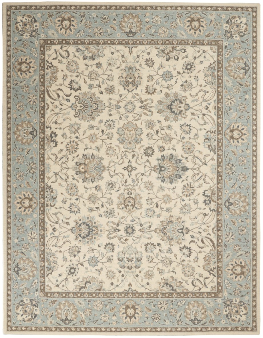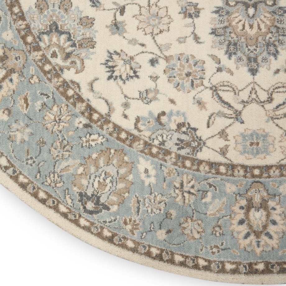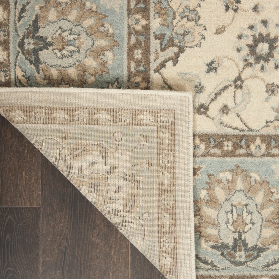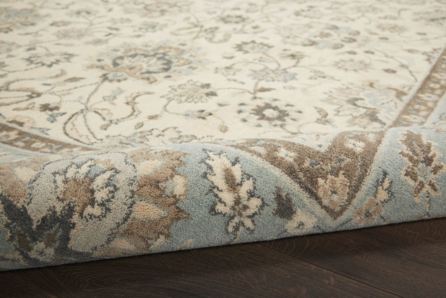 Iconic Persian design with floral border framing a symphony of flowers in soft tones of aqua blue and ivory. Rich wool with saturated, yet subtle colors conveys an understated elegance.