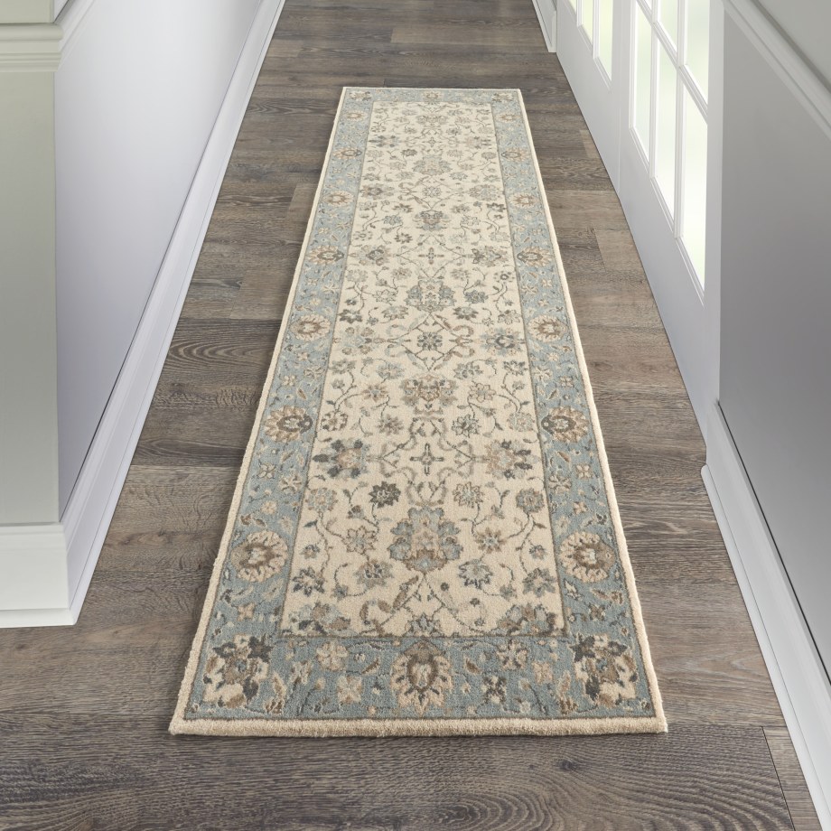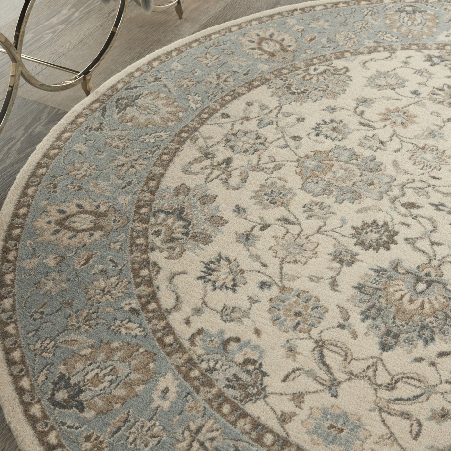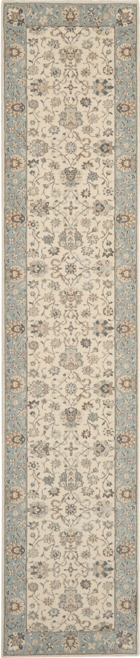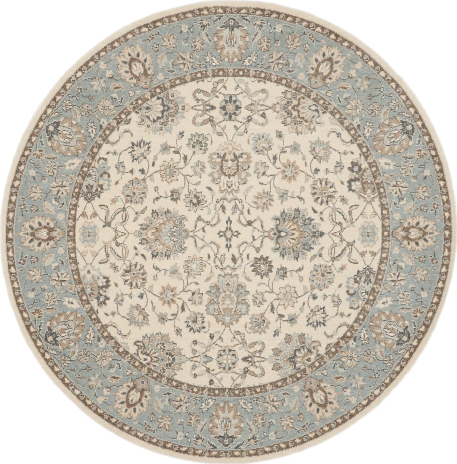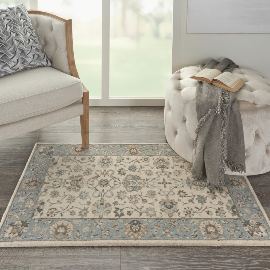 Iconic Persian design with floral border framing a symphony of flowers in soft tones of aqua blue and ivory. Rich wool with saturated, yet subtle colors conveys an understated elegance.