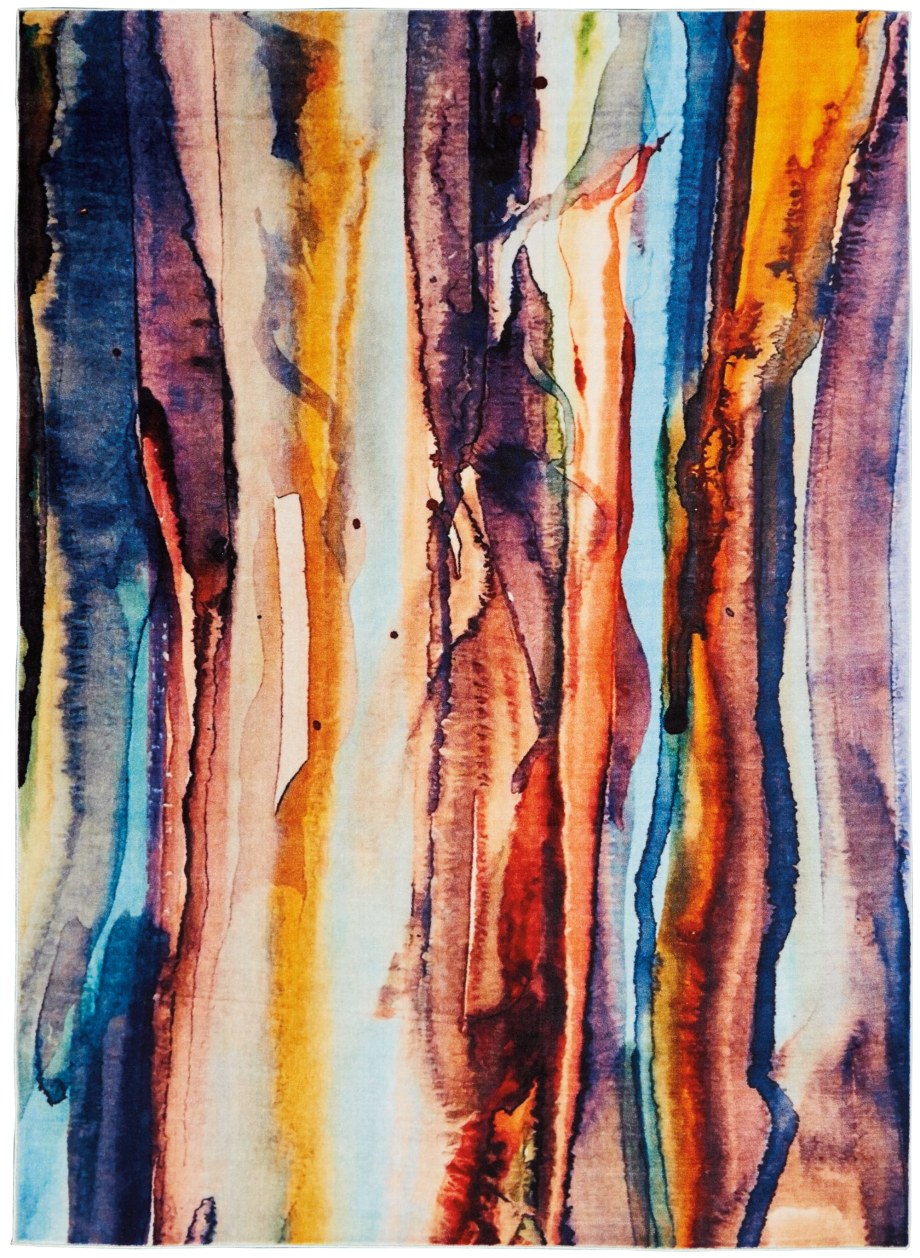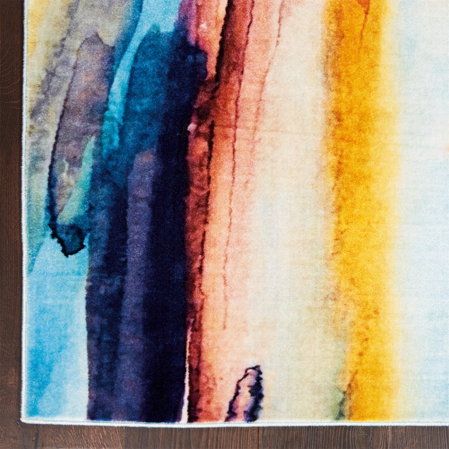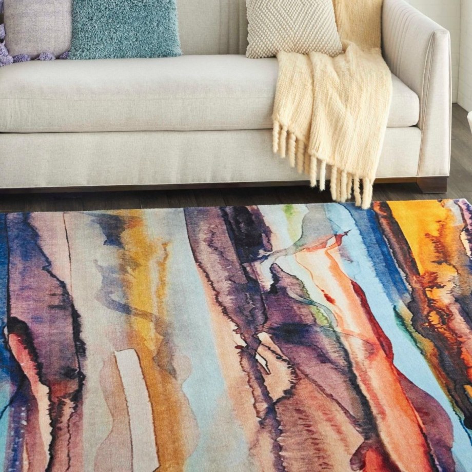This stunning multicolor rug from Nourison's La Reve Collection is a masterpiece of contemporary, artistic style. Gorgeous freehand stripes in blue, purple, and gold mingle with a painterly watercolor effect. Softly textured from easy-care fibers, it's as comfortable as it is artistic.