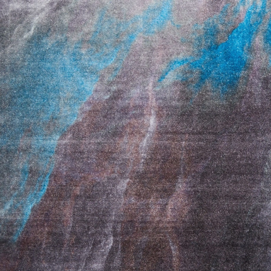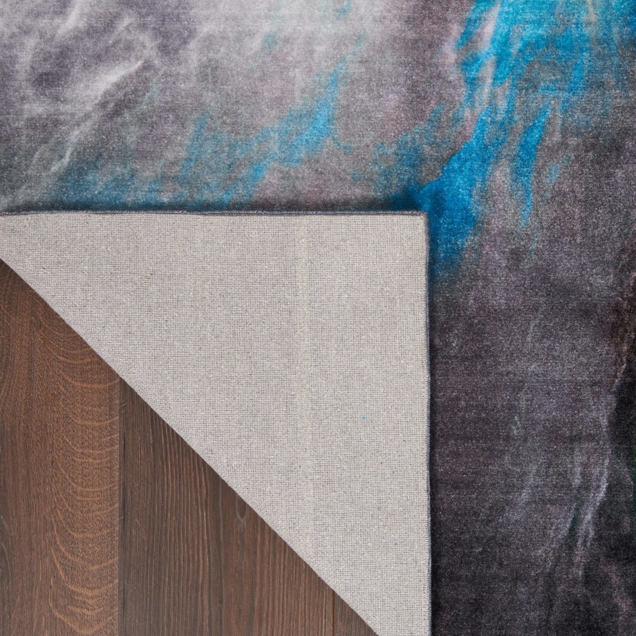 This remarkable Le Reve Collection rug reflects the immensity and dramatic colors of space in abstract PhotoReal detail. A dramatic burst of light and brilliant turquoise highlights streak across the deep charcoal field to create a vivid color contrast that brings modern energy and appeal to any room.