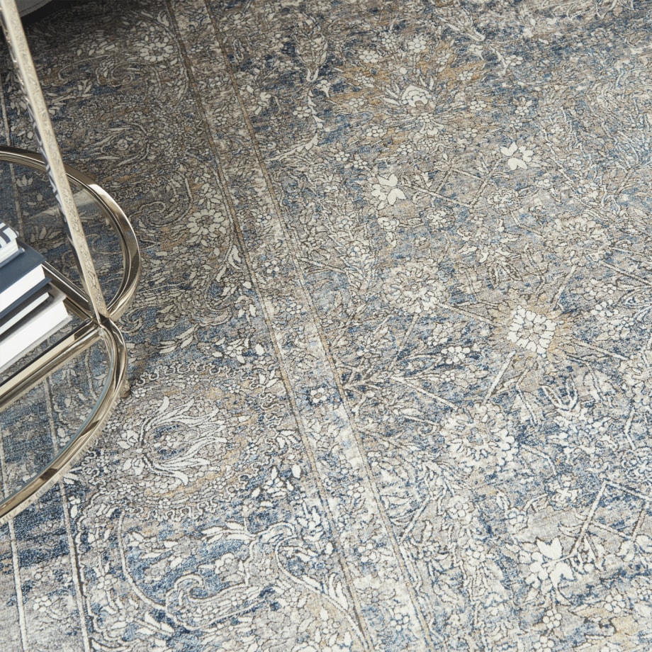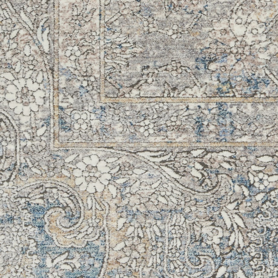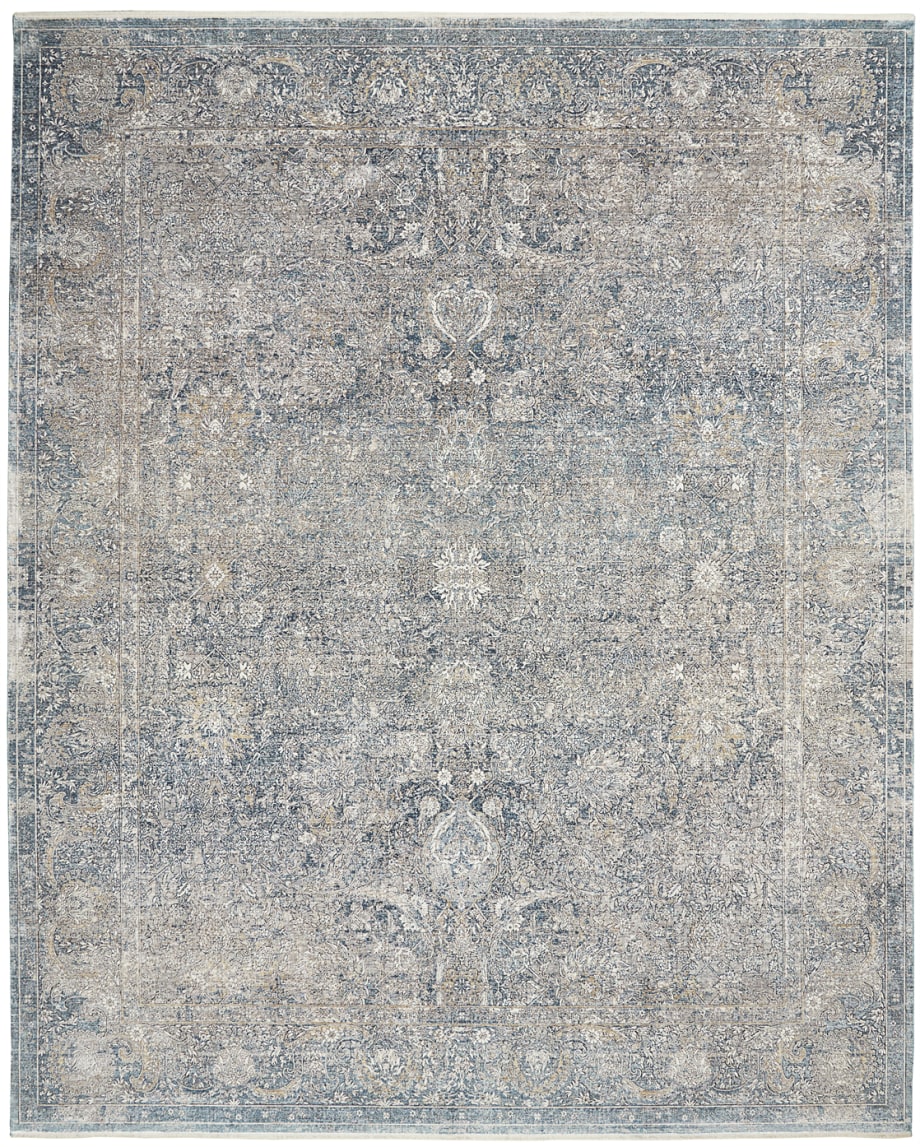 Erased, traditional pattern lends an antique feel to this Persian style area rug. Tones of cream and faded blue swirl in a classic, framed floral pattern. Silky to the touch and pleasing to the eye, in a soft, inviting pile.
