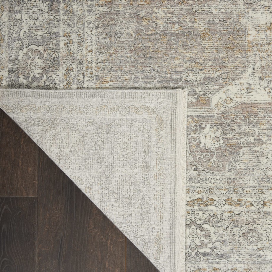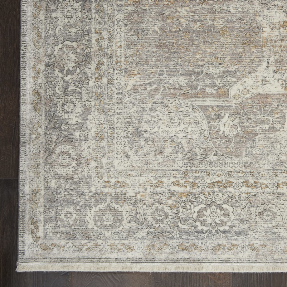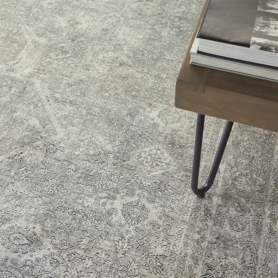 Erased, traditional pattern lends an antique feel to this Persian style area rug. Tones of cream and faded silver swirl in a classic, framed floral pattern with double center medallion. Silky to the touch and pleasing to the eye, in a soft, inviting pile.