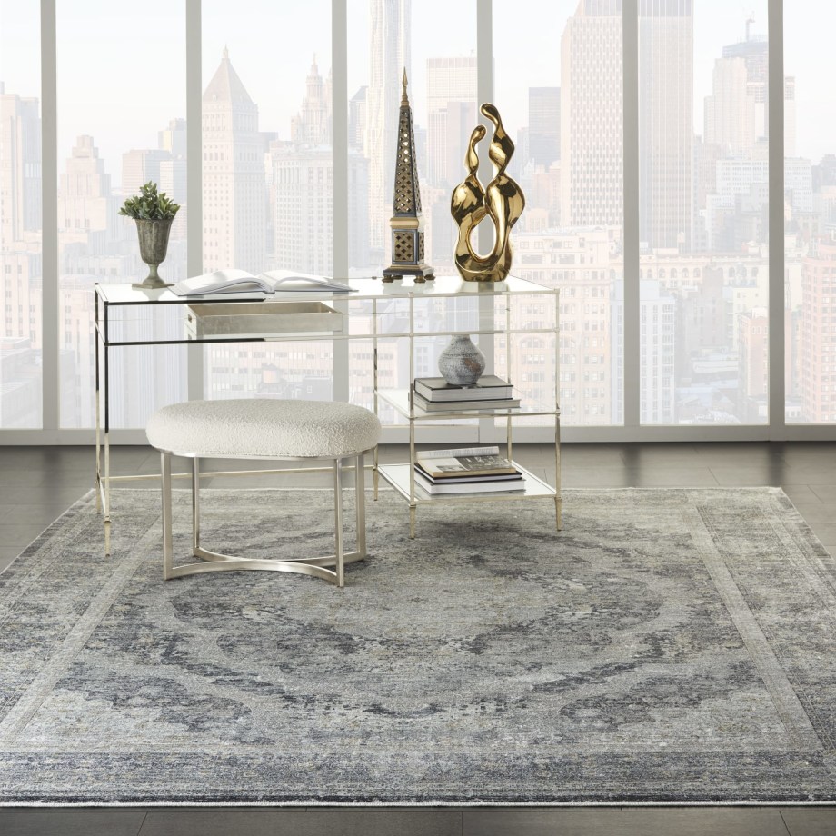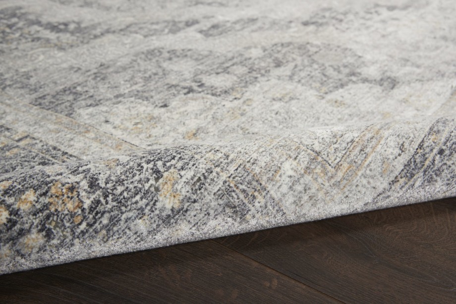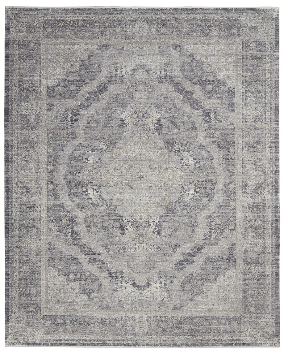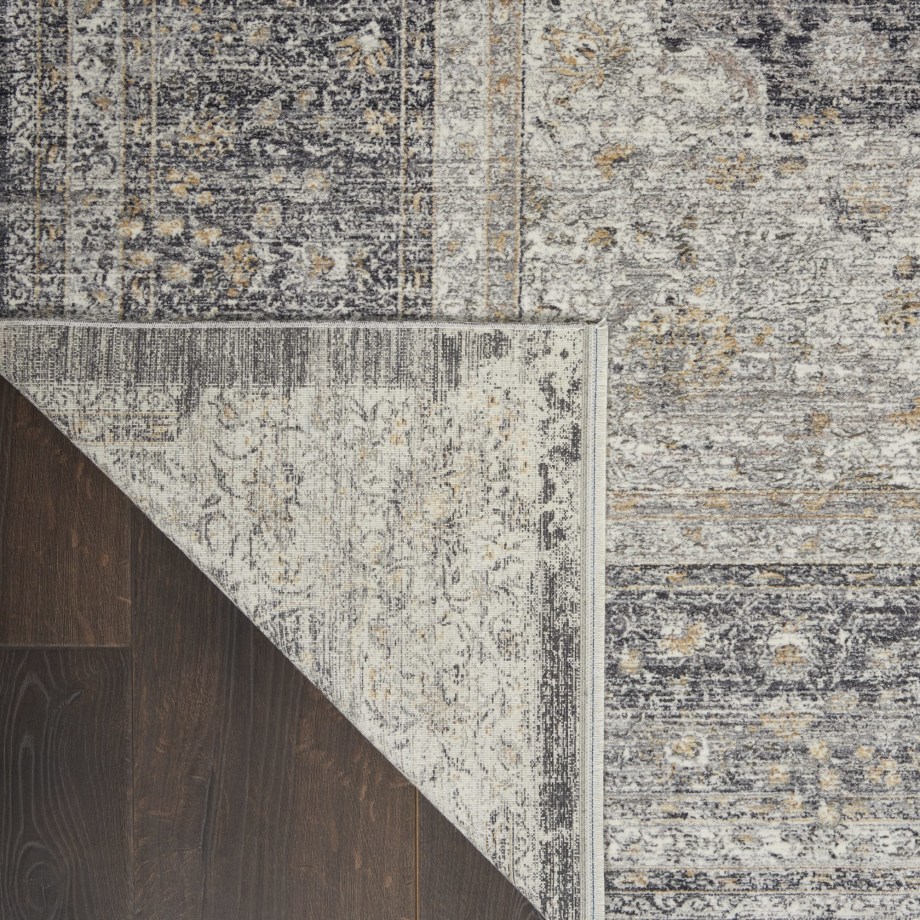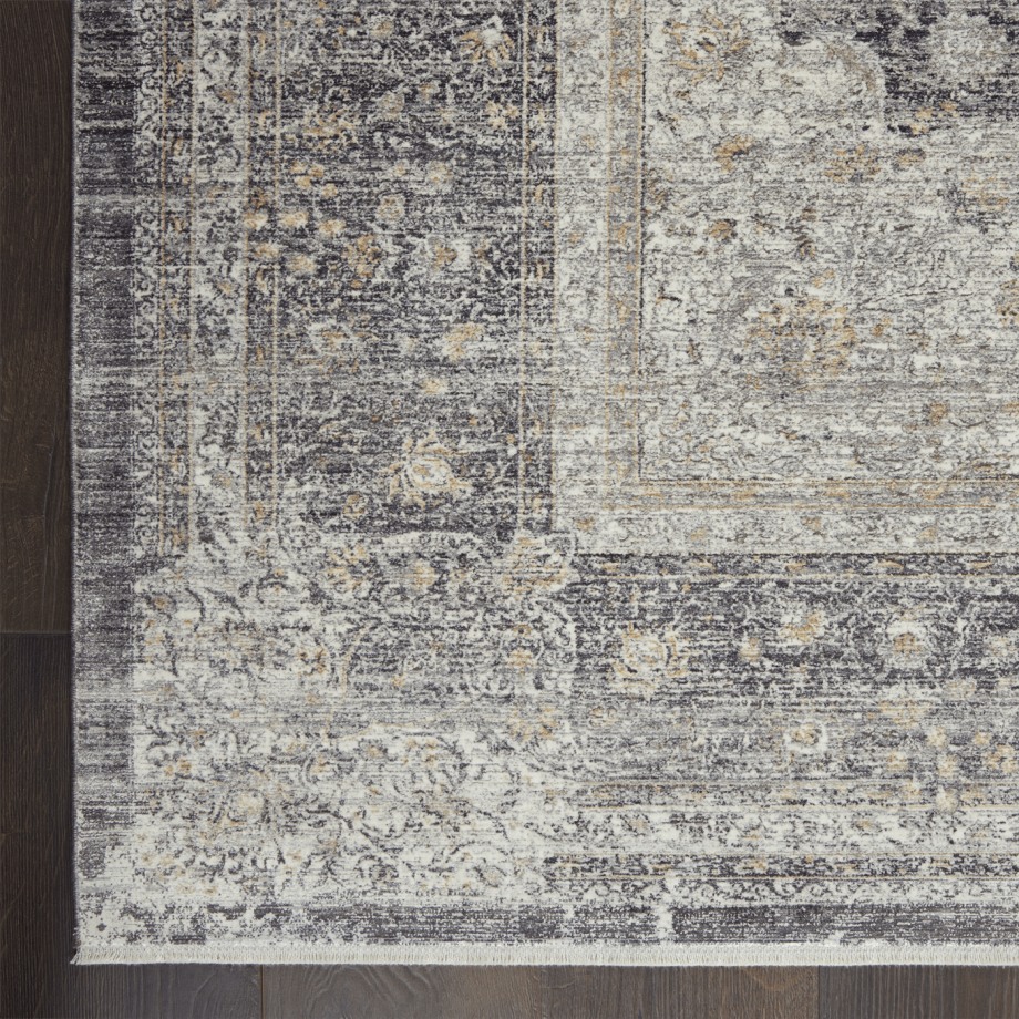 Elaborate design on a traditional, framed floral pattern with faded patina for a vintage look. Cream and faded charcoal threads blend seamlessly on this versatile, Persian style area rug. Silky to the touch and pleasing to the eye, in a soft, inviting pile.