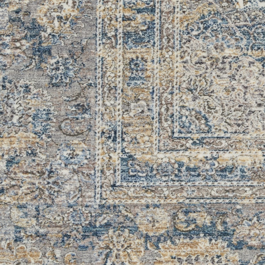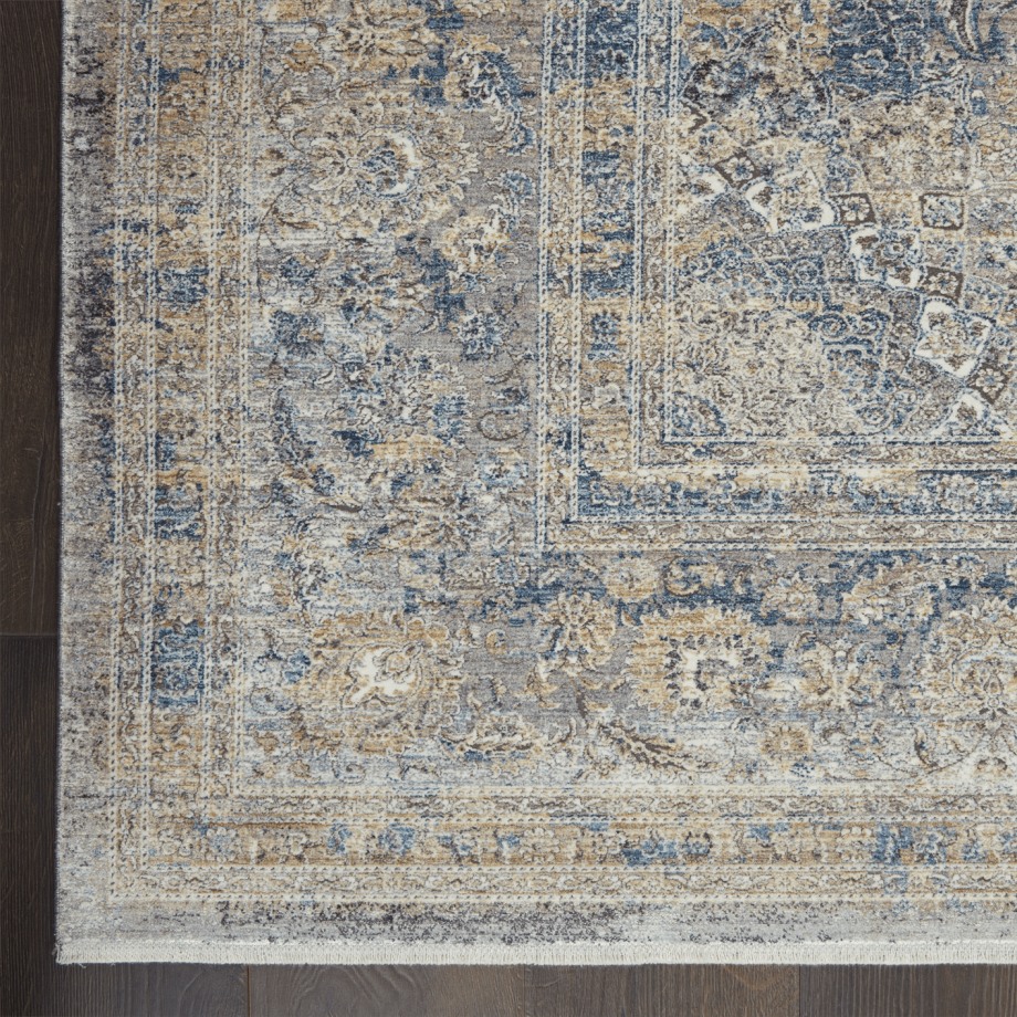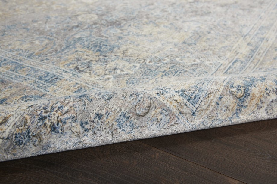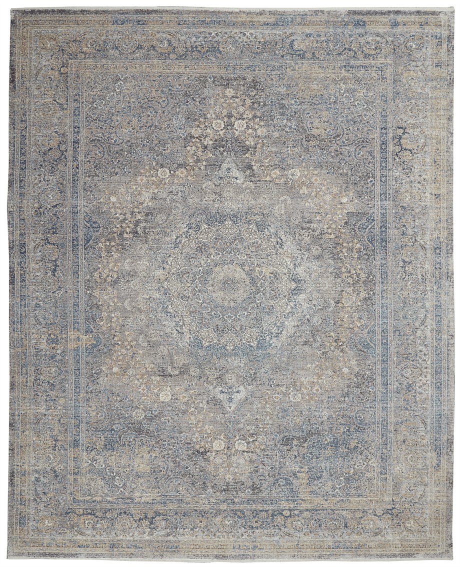 Erased, traditional pattern lends an antique feel to this Persian style area rug. Faded tones of rich cream and regal blue swirl in a classic, framed floral pattern with center medallion. Silky to the touch and pleasing to the eye, in a soft, inviting pile.