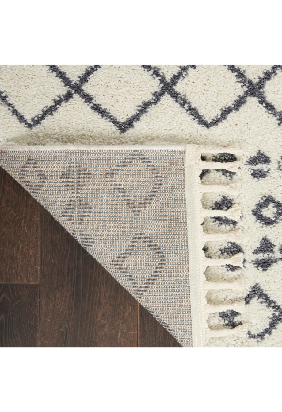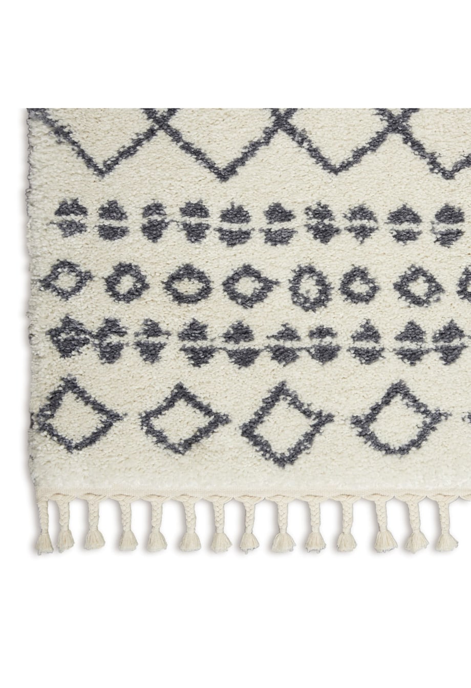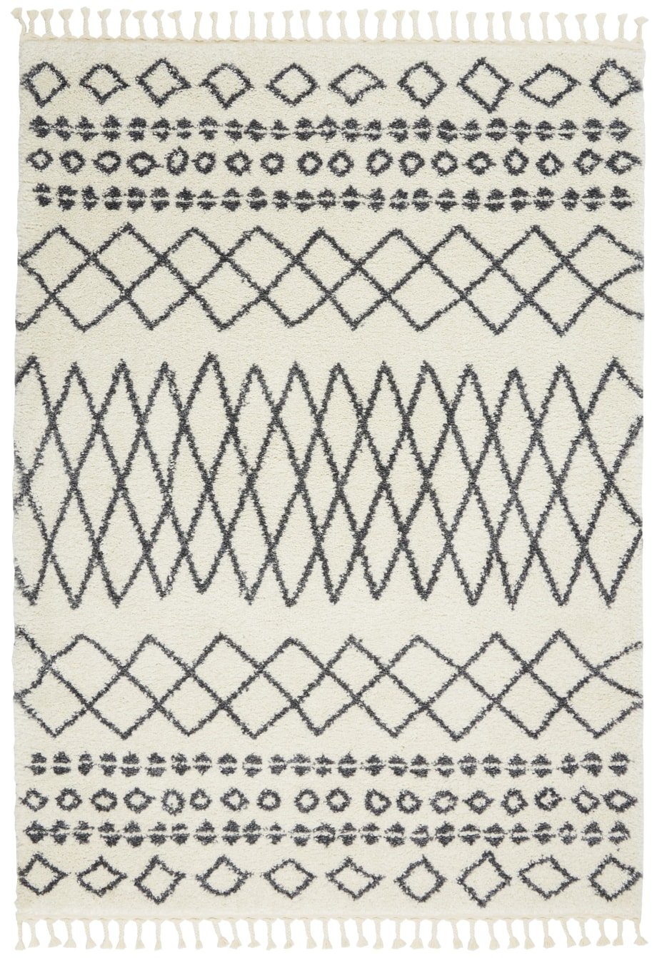| With its upbeat tribal-inspired diamond design, cozy tassels, sumptuous shag construction and cosmopolitan color palette of white and black, this stunning Moroccan Shag area rug from Nourison seamlessly blends the best of the old world with the new. Hand loomed from a fantastic 100% Polypropylene friese for stress free living and to go the distance beautifully. |