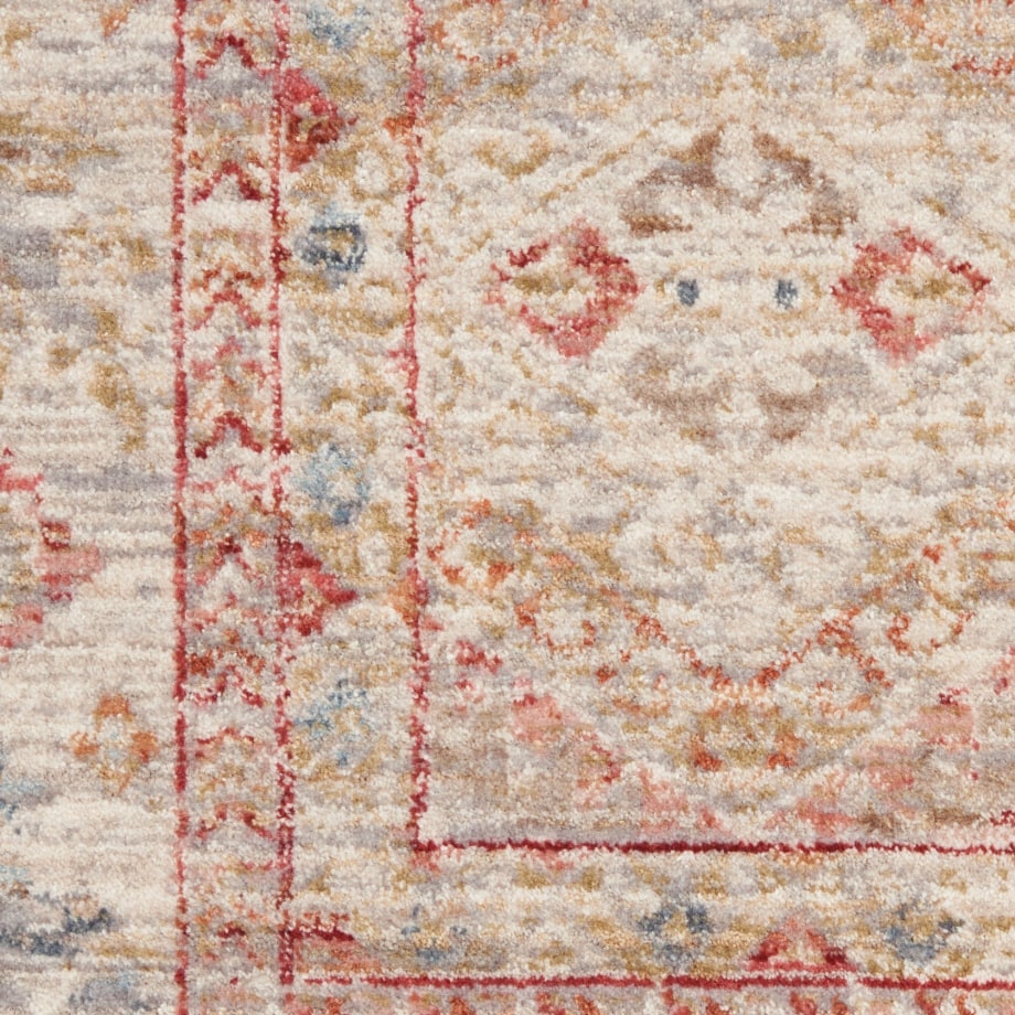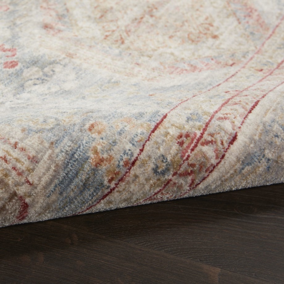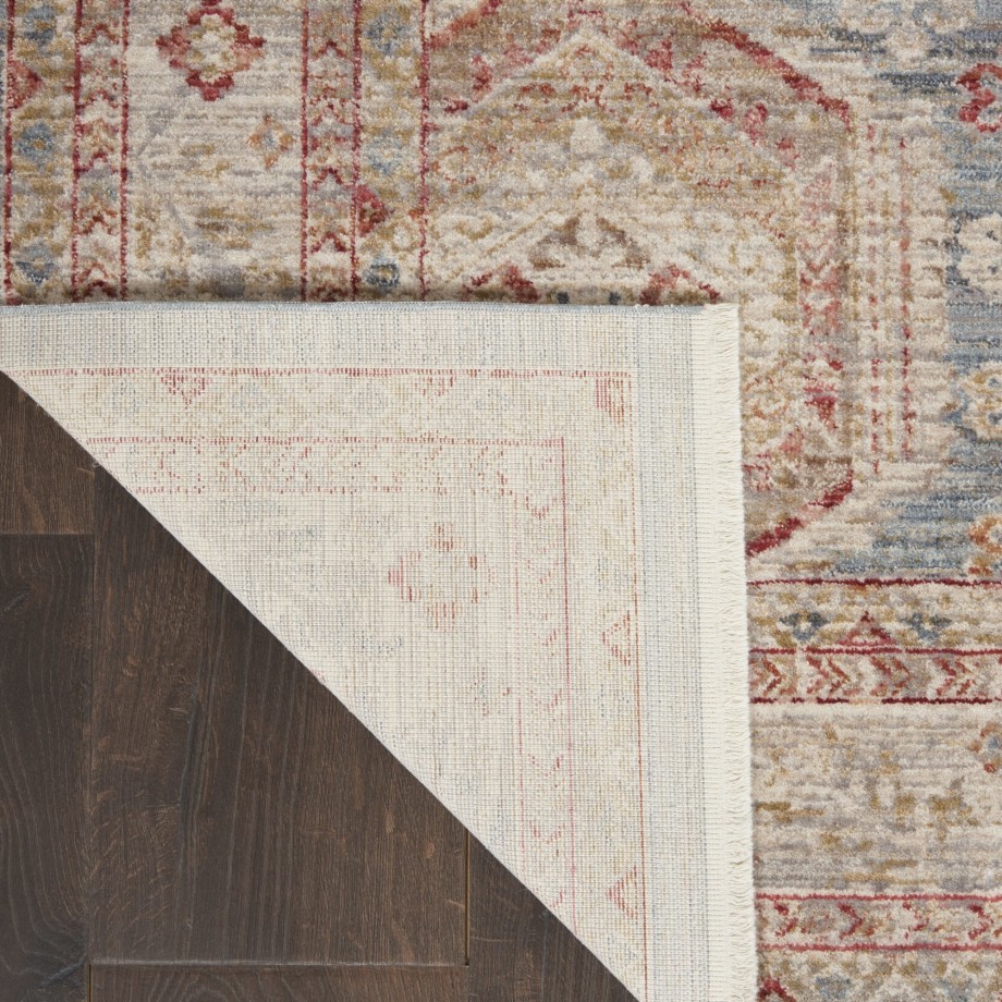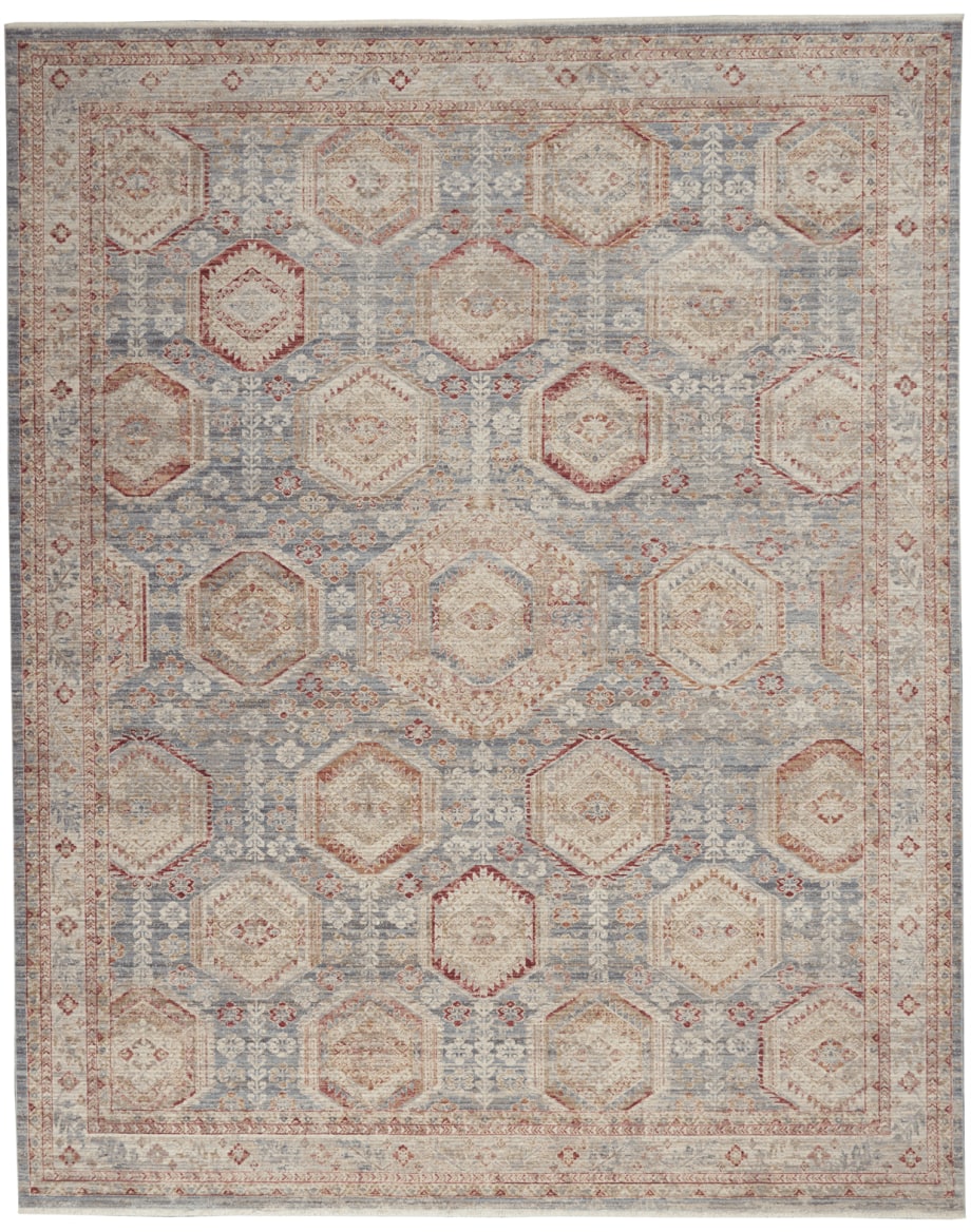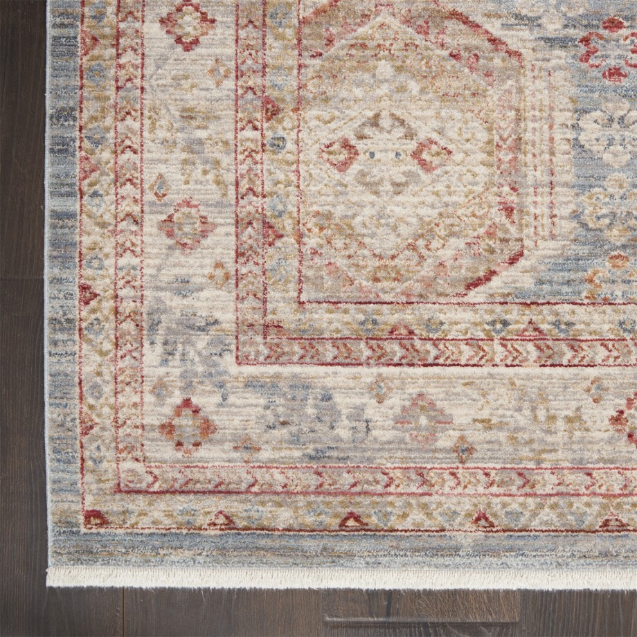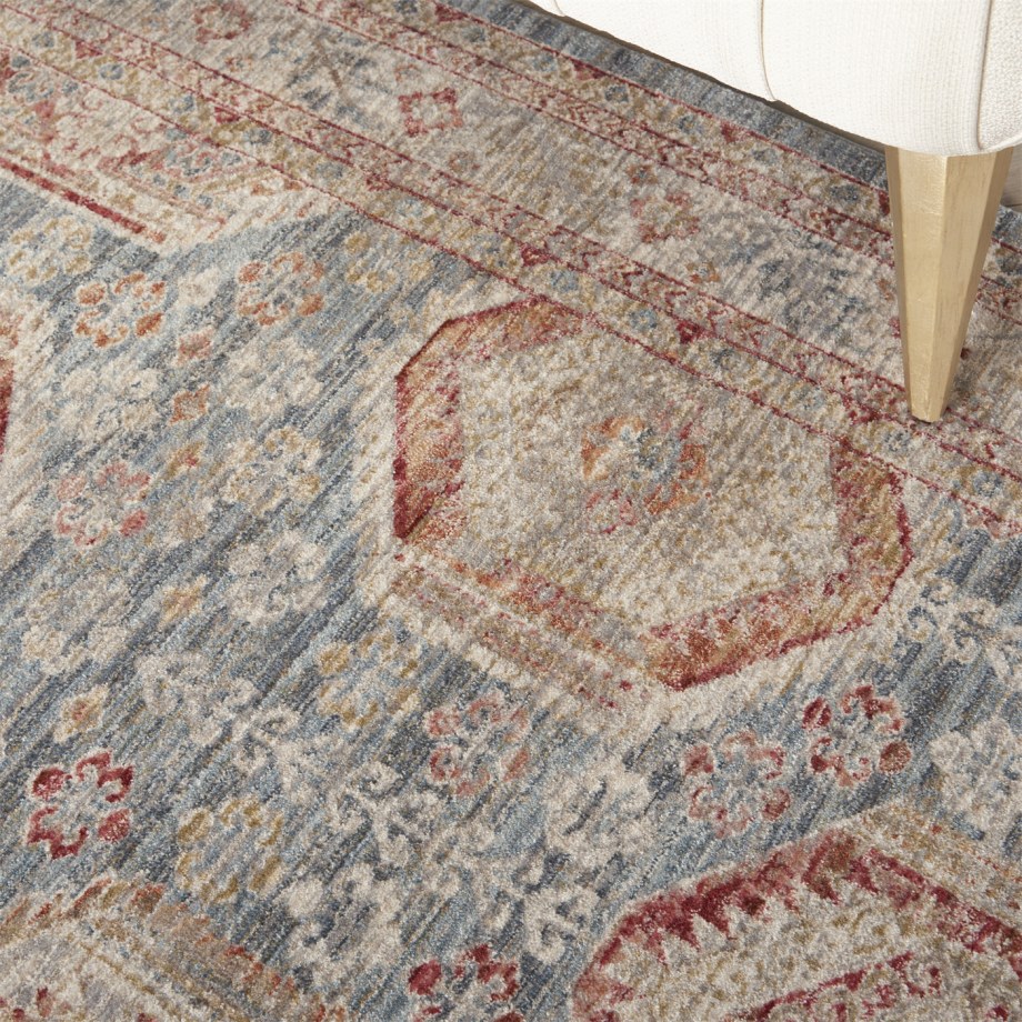 | Traditional Persian medallions alternate in interlocking shapes to fill this soft blue and multicolor Homestead area rug with lively pattern. Each medallion contains stylized flowers for a tapestry of intriguing detail. In a warm and luminous low-pile with layered border, small fringe and faded vintage appeal.Treated with Nouri-Guard™ fiber protectant for lasting, stain-resistant beauty. |