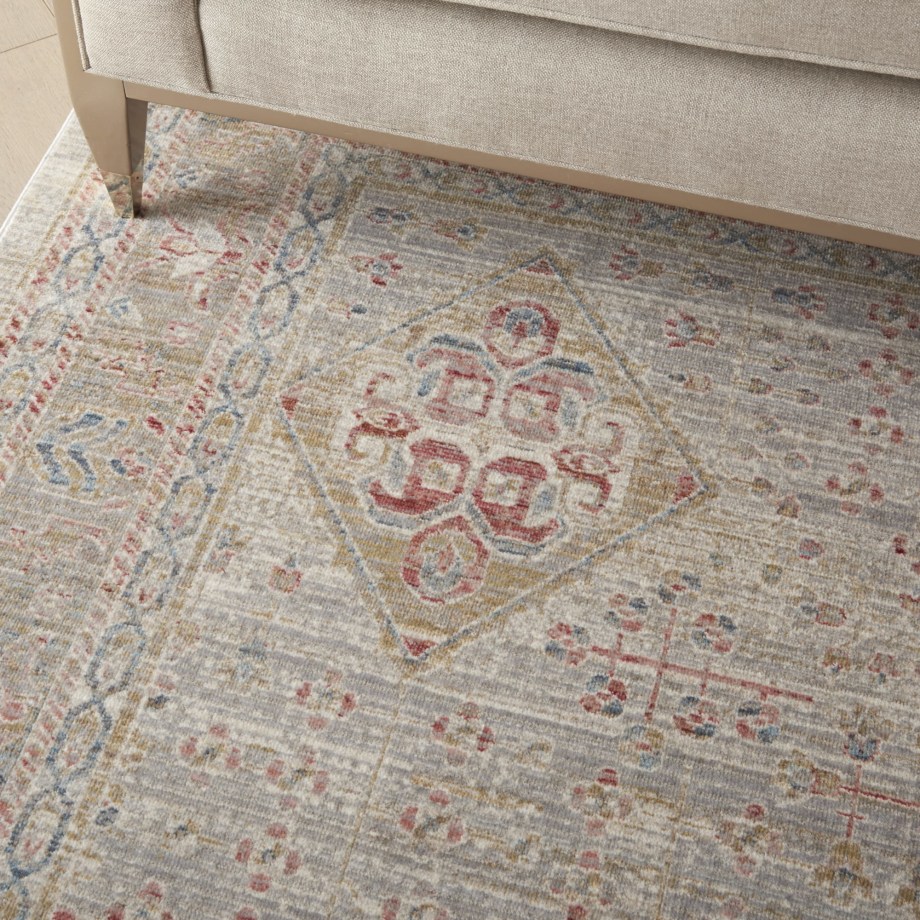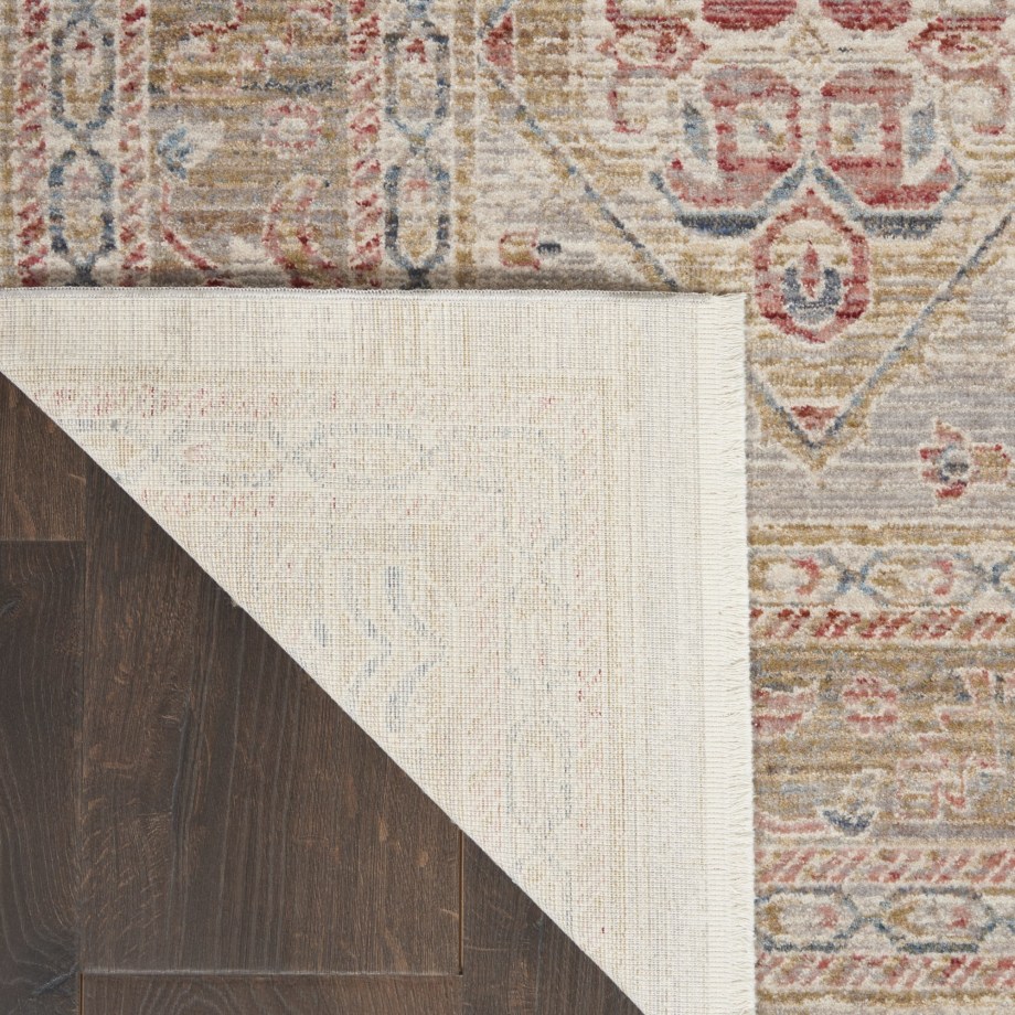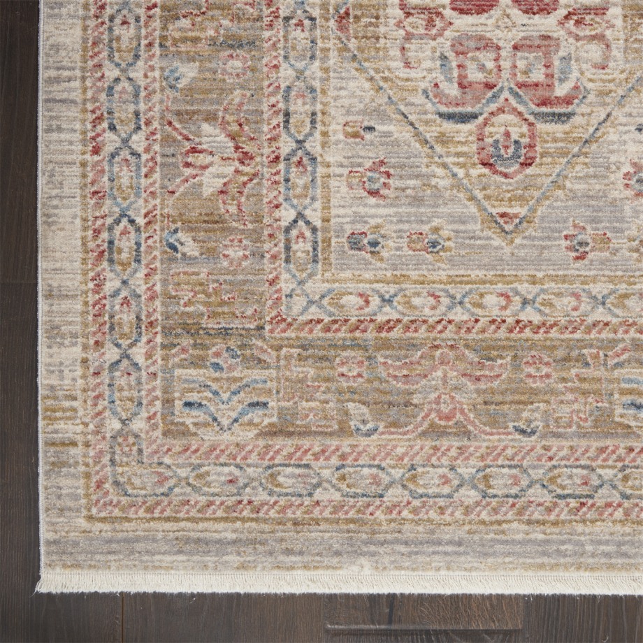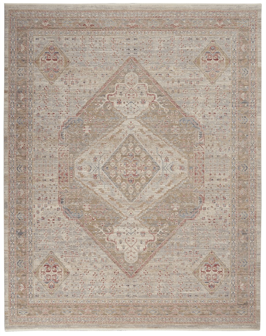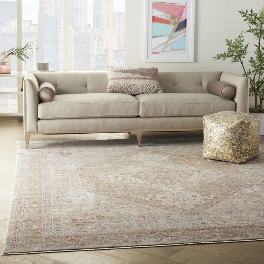 | Bring warmth and beauty to a special room with this Persian-inspired Homestead area rug. Its classic center medallion design is balanced by four corner diamonds, all richly detailed with delicate floral motifs. The soft and luminous low pile is Nouri-Guard protected; superbly subtle in gently faded beige and grey.Treated with Nouri-Guard™ fiber protectant for lasting, stain-resistant beauty. |