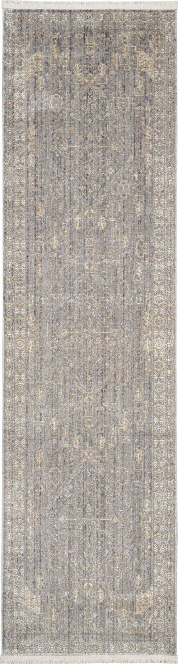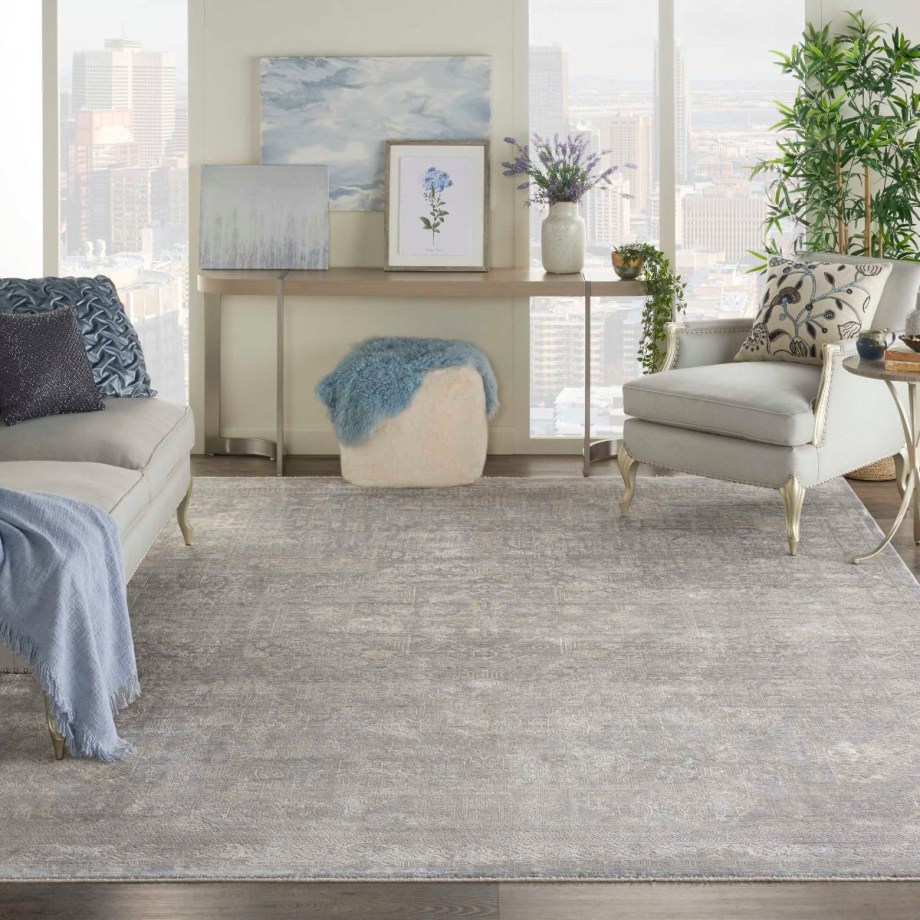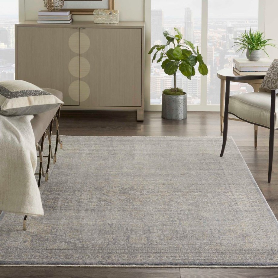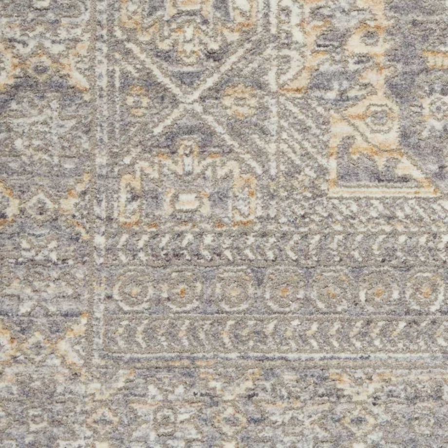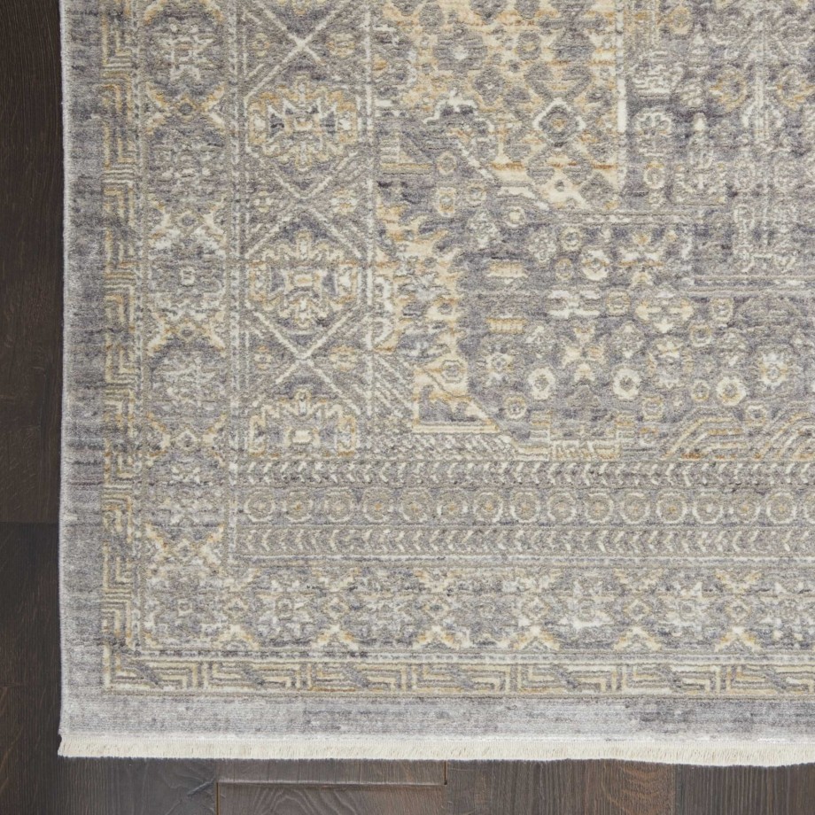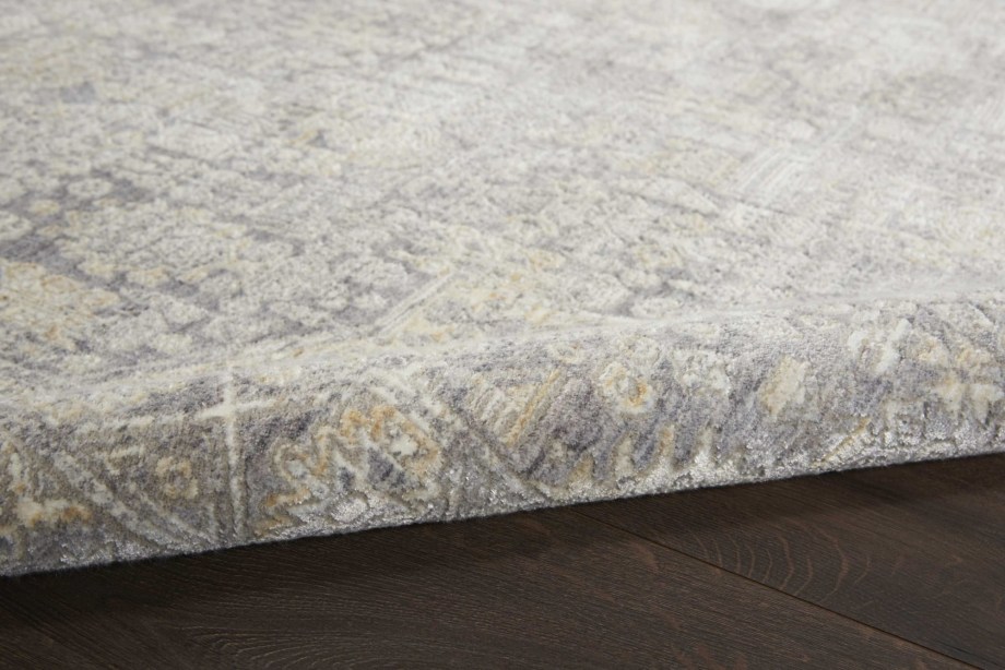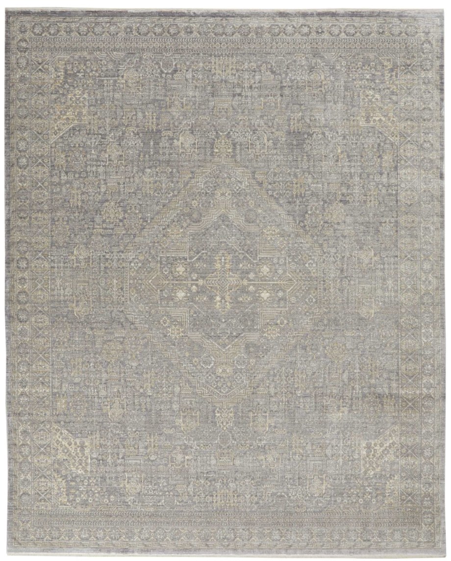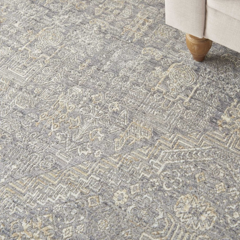 Bountiful and beautiful. Grey and beige flowers interplay with a diamond center medallion and intricate border to form a sophisticated pattern. An erased pattern gives the Lustrous Weave area rug a subtle beauty that makes it as easy to coordinate with family heirlooms as modern furnishings.
