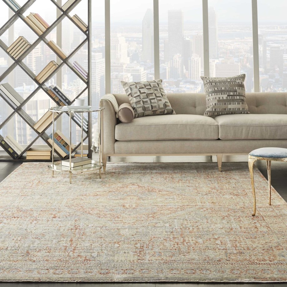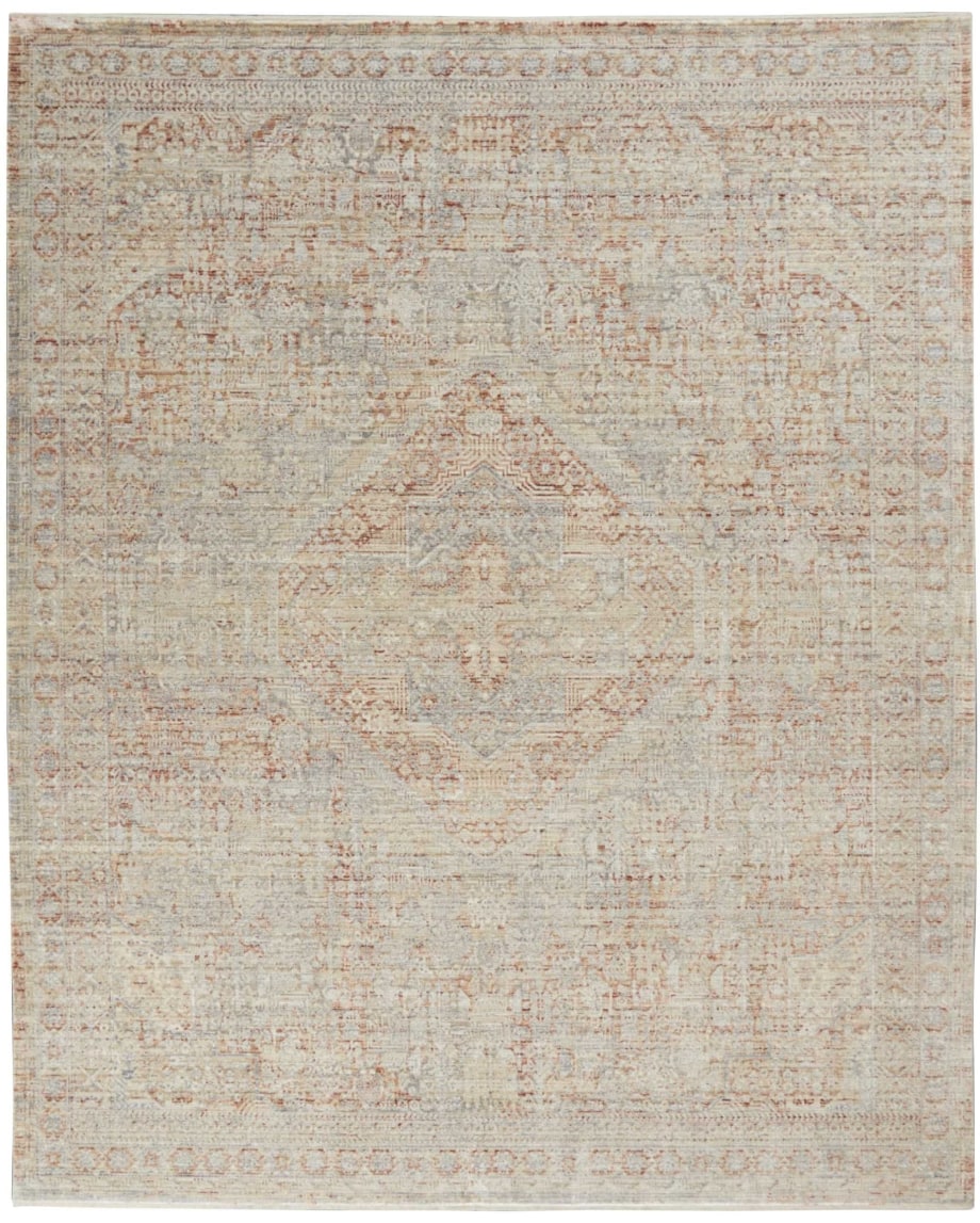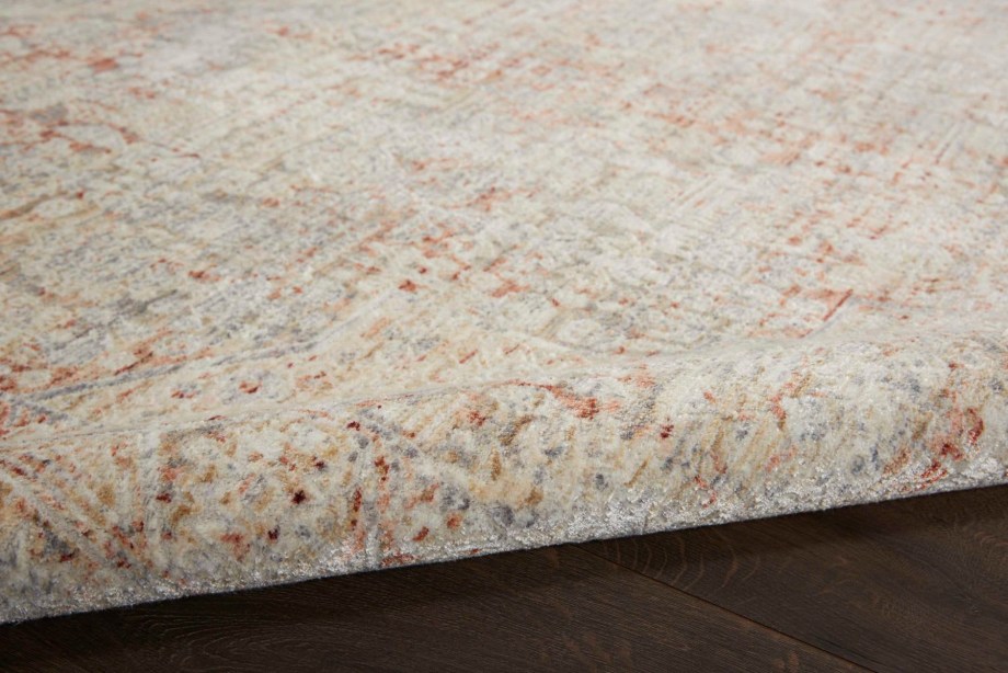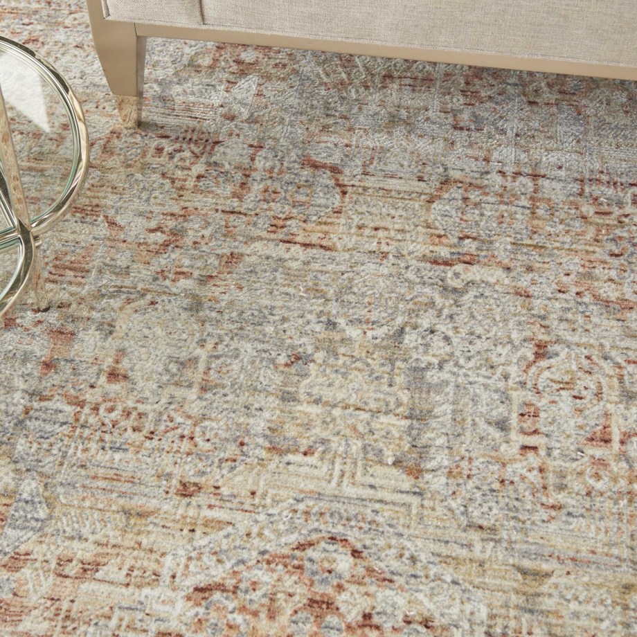 Bountiful and beautiful. Grey and Ivory flowers interplay on an unexpected field of burnt orange with a diamond center medallion to form a sophisticated pattern. An erased pattern gives the Lustrous Weave area rug a subtle beauty that makes it as easy to coordinate with family heirlooms as modern furnishings.