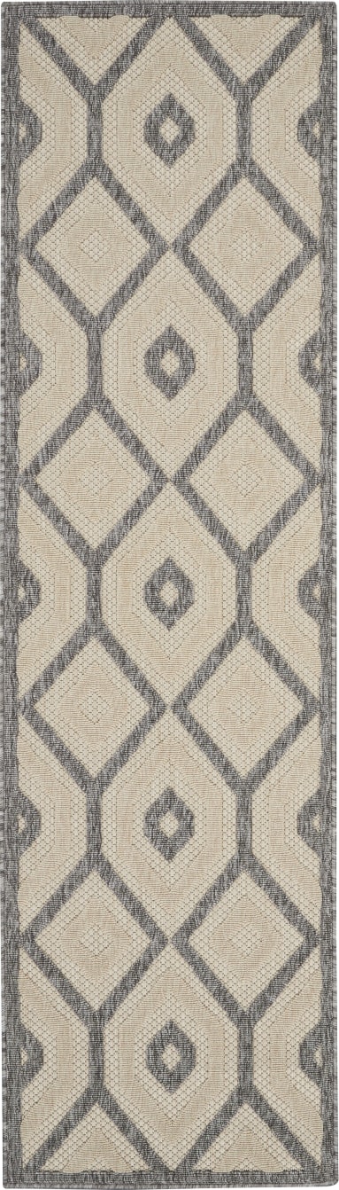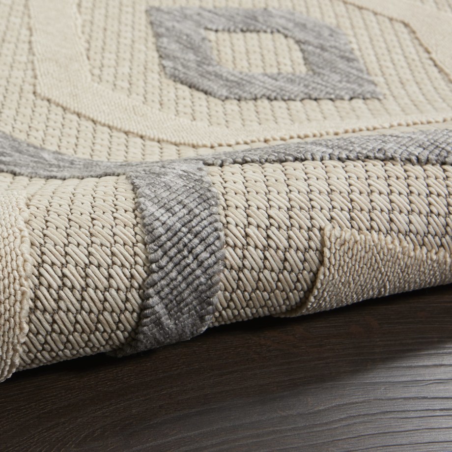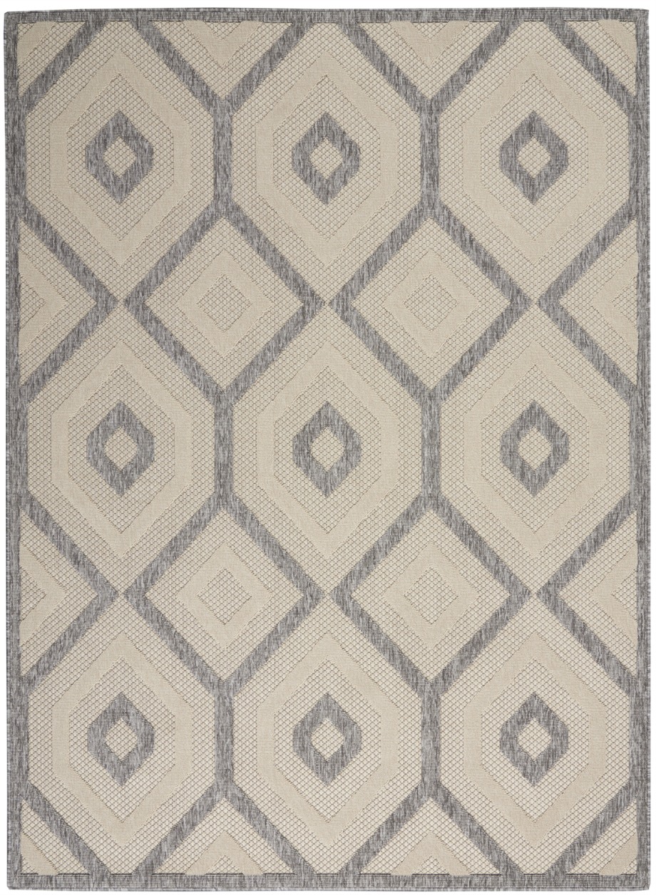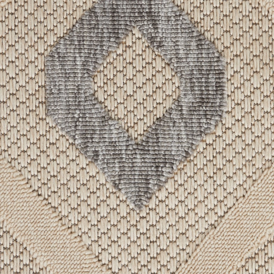 | Soft cream and grey create muted contrast in this chic and subtle Cozumel area rug. Its geometric design of concentric diamonds is beautifully highlighted by high-low loop pile and varying types of weave. A great casual look, indoors or out. |