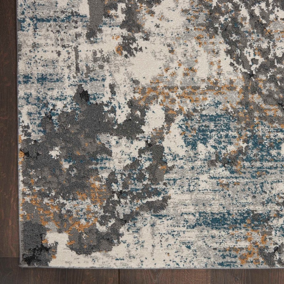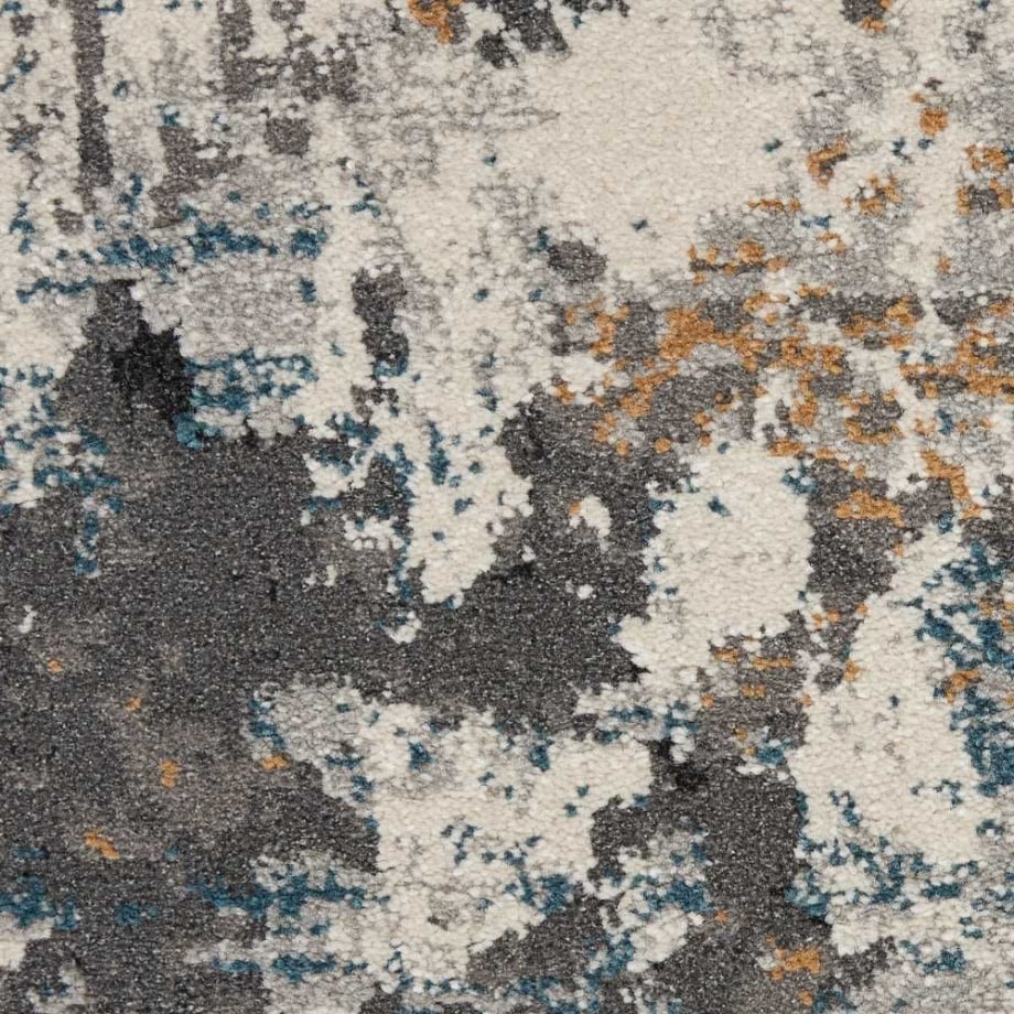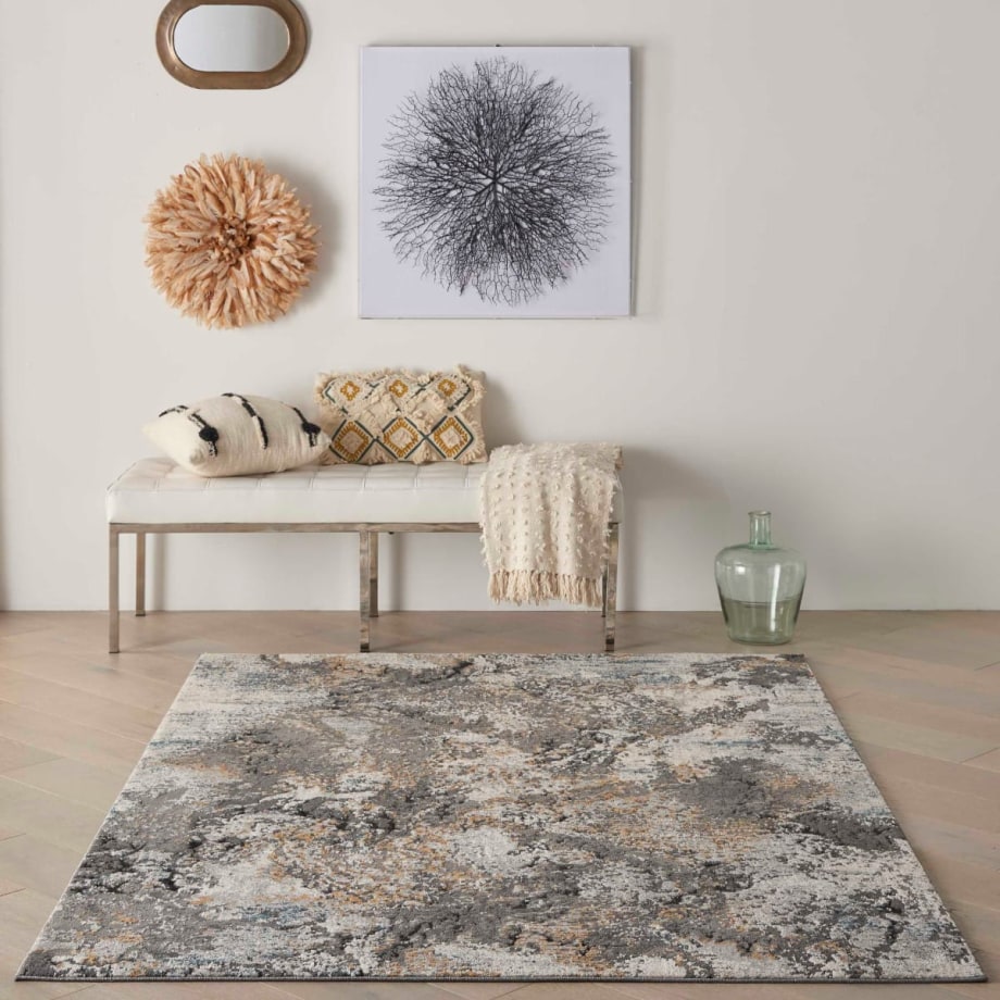 Rich shades of grey mingle in luxurious counterpoint with ivory and golden beige, creating fascinating pools of transitional neutral tones as if on a painters canvas. This stunning and perfectly modern Tangra area rug is power-loomed in an easy-care poly-fiber blend, with all-over design, serged edge and thick, low pile.