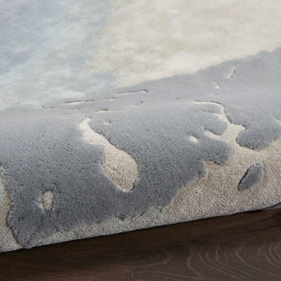 Let the soft, hypnotic colors of this Prismatic area rug envelop you in a magnificently modern, abstract design. Swirling, painterly clouds of seafoam and silver mingle like ocean and sky in a painterly, hand-tufted rug with exciting hand-carved detail. The dense, durable pile is composed of fine wool and shimmering Luxcelle fibers.