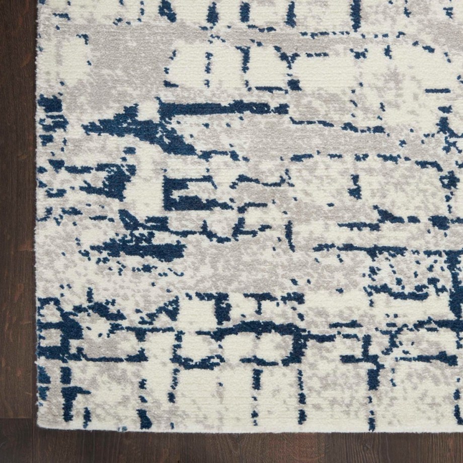 Sultry evening tones of navy and grey, sparked by ivory, add a modern touch to the living room, dining room, bedroom, foyer or playroom in this abstract Twilight design. With serged edge, cut pile and hand-washed finish, this no-shed area rug works with all kinds of décor, from contemporary and transitional, to bohemian and eclectic.