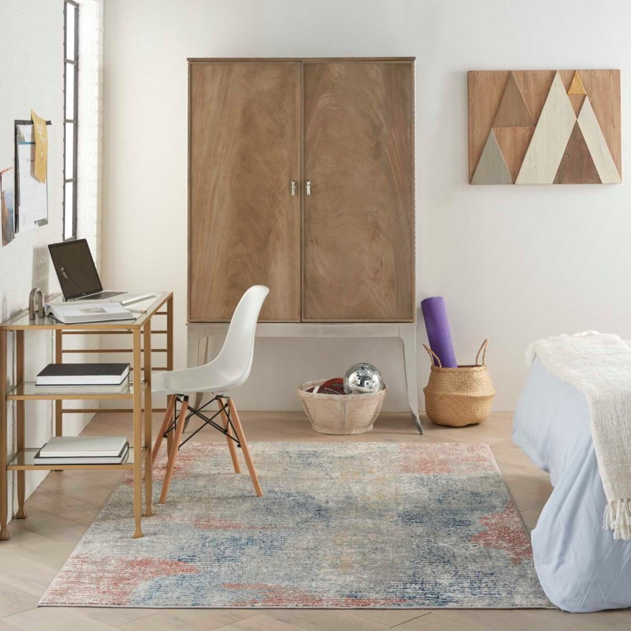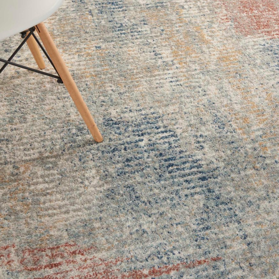 Bring visual pleasure into your living room, dining room, family room, bedroom or study with this magnificent abstract area rug from our Quarry Collection. Pools of color in blue and rust on ivory hint at pattern with an intriguing distressed effect. Sophisticated and elegant in a high cut-pile that adds depth and texture to modern and contemporary dcor.