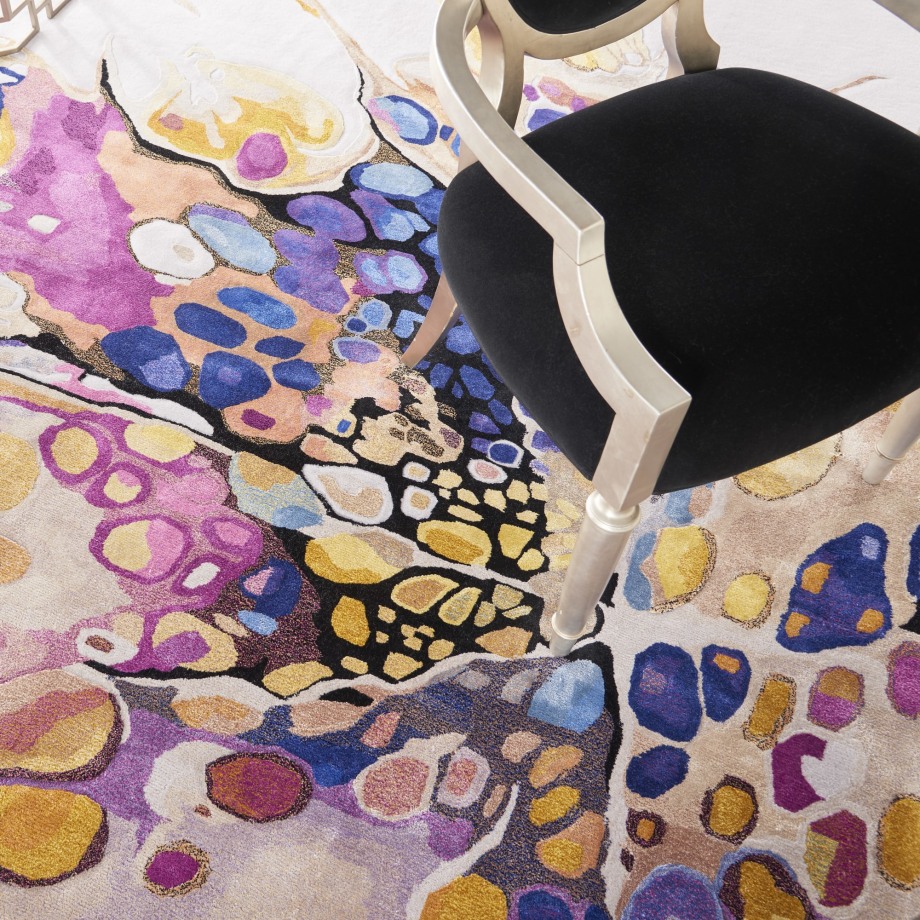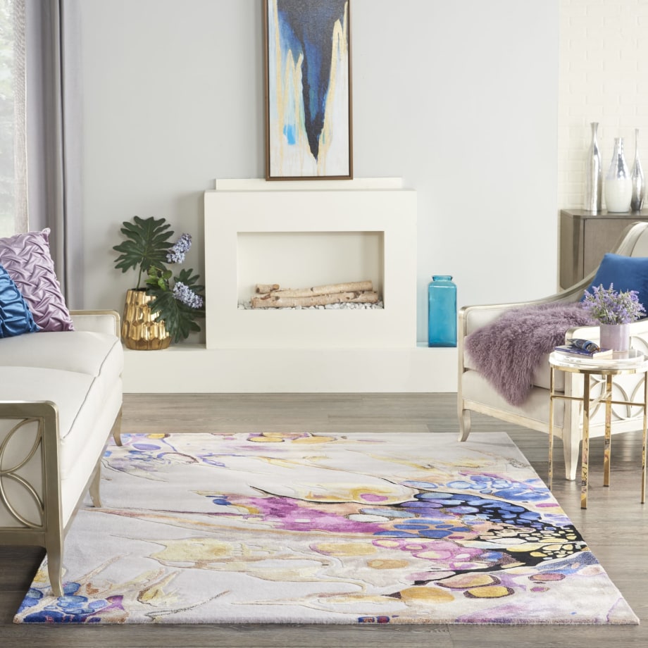 | Captivatingly vivid color seems to splash across the surface of this sensational Prismatic area rug. The abstract design hints at floral motifs and natural forms, in a beautifully balanced and painterly rug. The luxurious blend of wool and shimmering, silk-like Luxcelle fibers adds to the beauty of its sophisticated palette in multicolor shades of grey, purple, gold, beige, blue, and yellow. This exceptionally soft, hand-tufted cut pile works beautifully in contemporary, modern, and eclectic décor. |