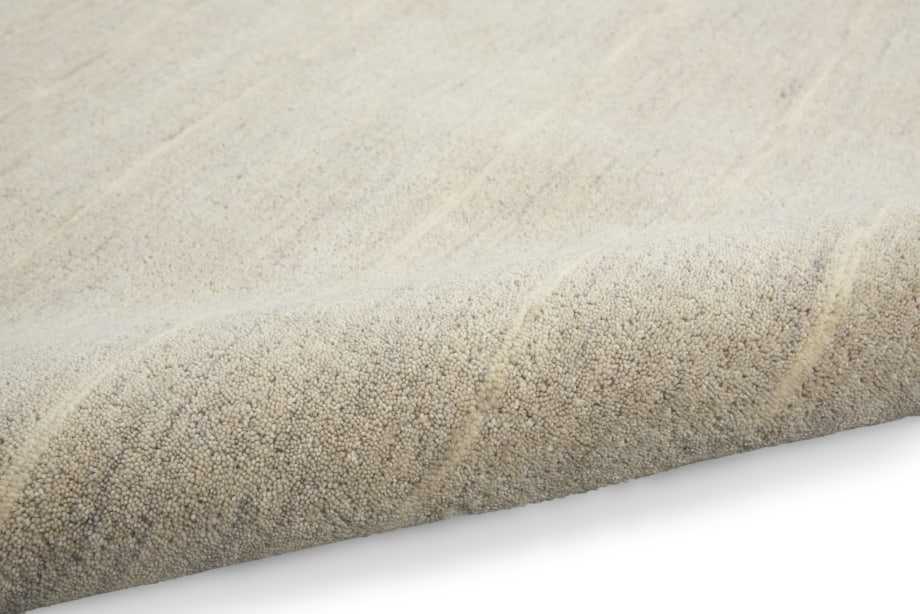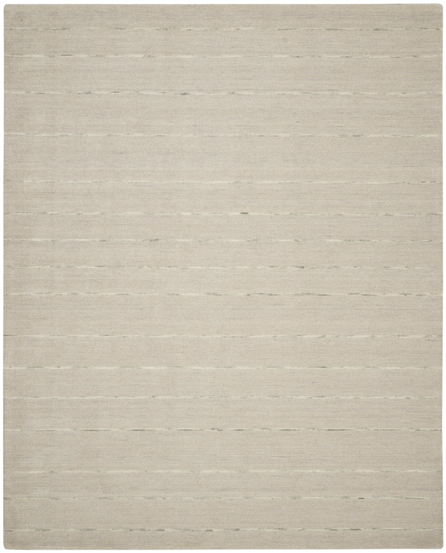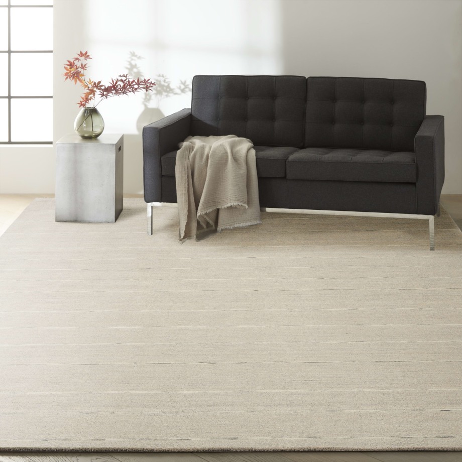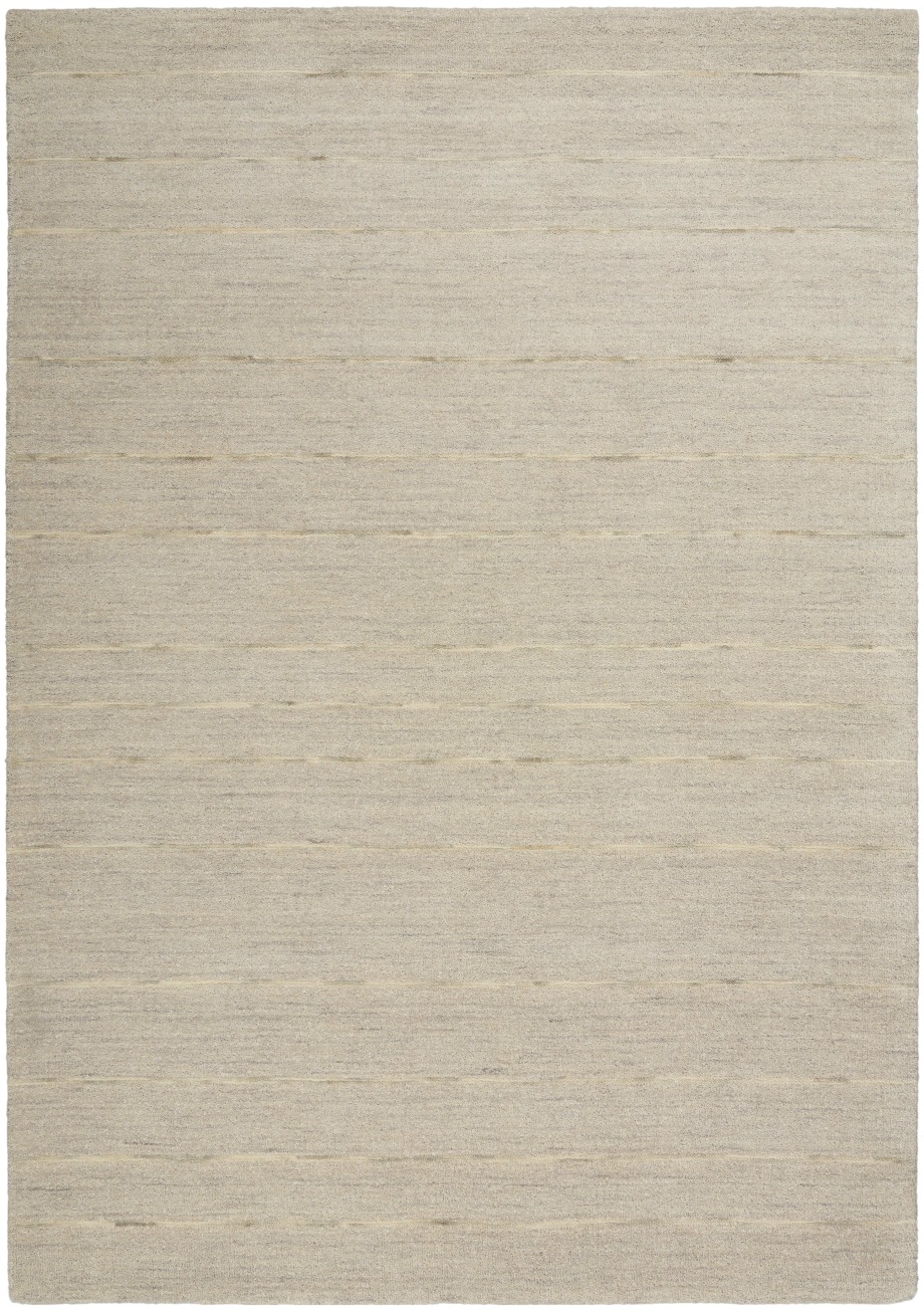 Natural, calming and modern. This Calvin Klein Halo rug offers a clean foundation for modern decor. A charcoal grey ground, space-dyed for tonal variation, is accented by softly broken stripes in neutral grey and ivory. This minimalist rug design is handmade of softly textured, low-profile wool fibers for lasting comfort.