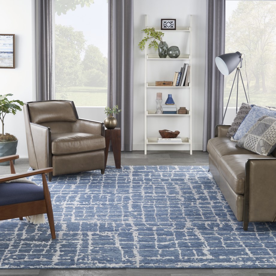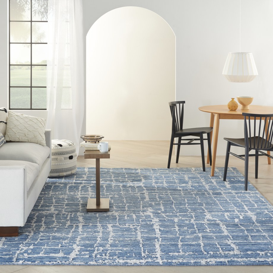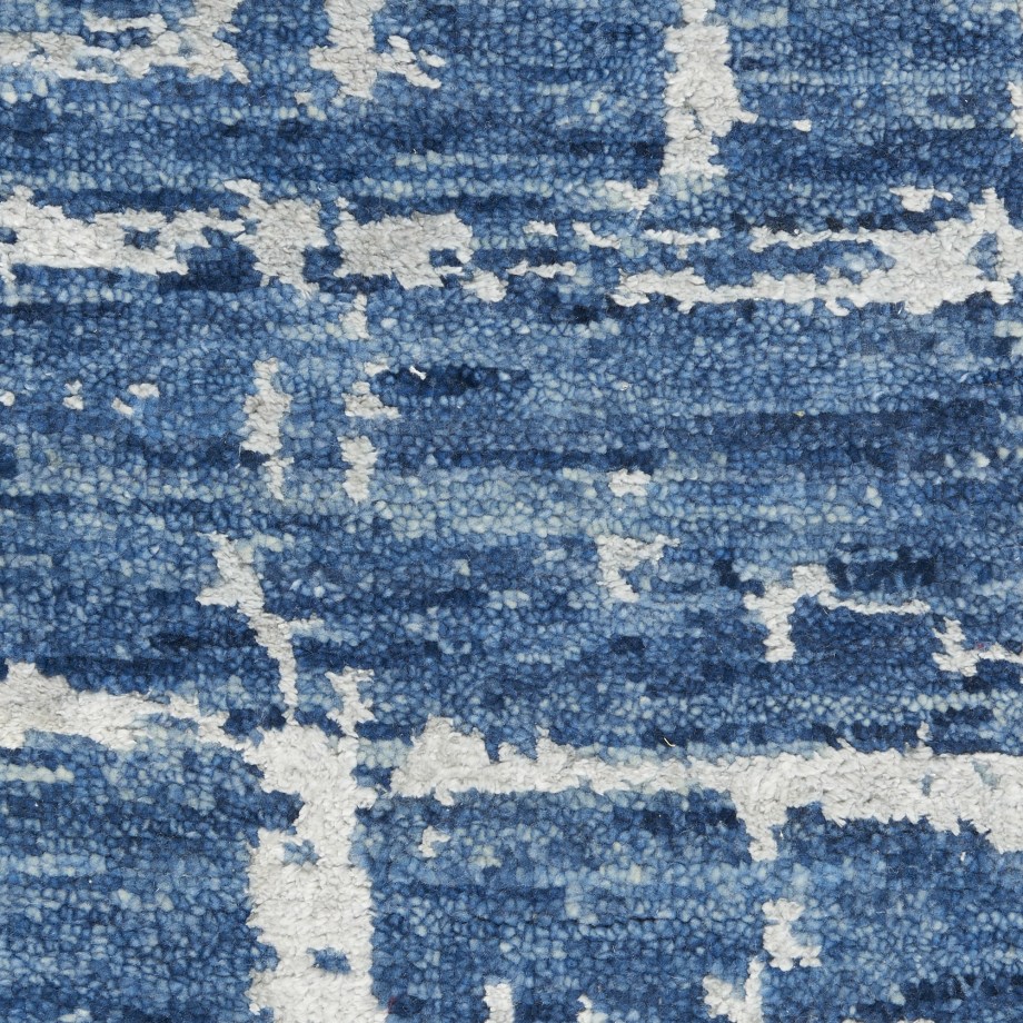 This hand-knotted Luna area rug brings you contemporary design with a flourish! Exciting linear pattern has a modern mosaic effect that will finish your decor with movement, texture and balance. Beautifully handmade in a medium blue and silver colorway, with subtle variations that make each rug unique.