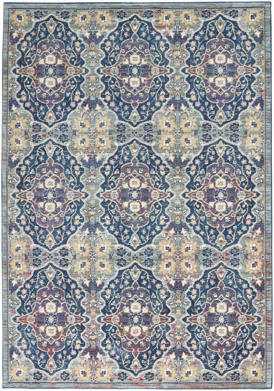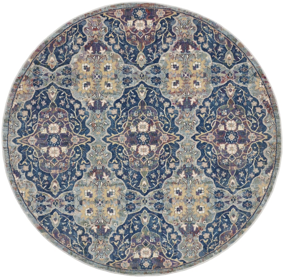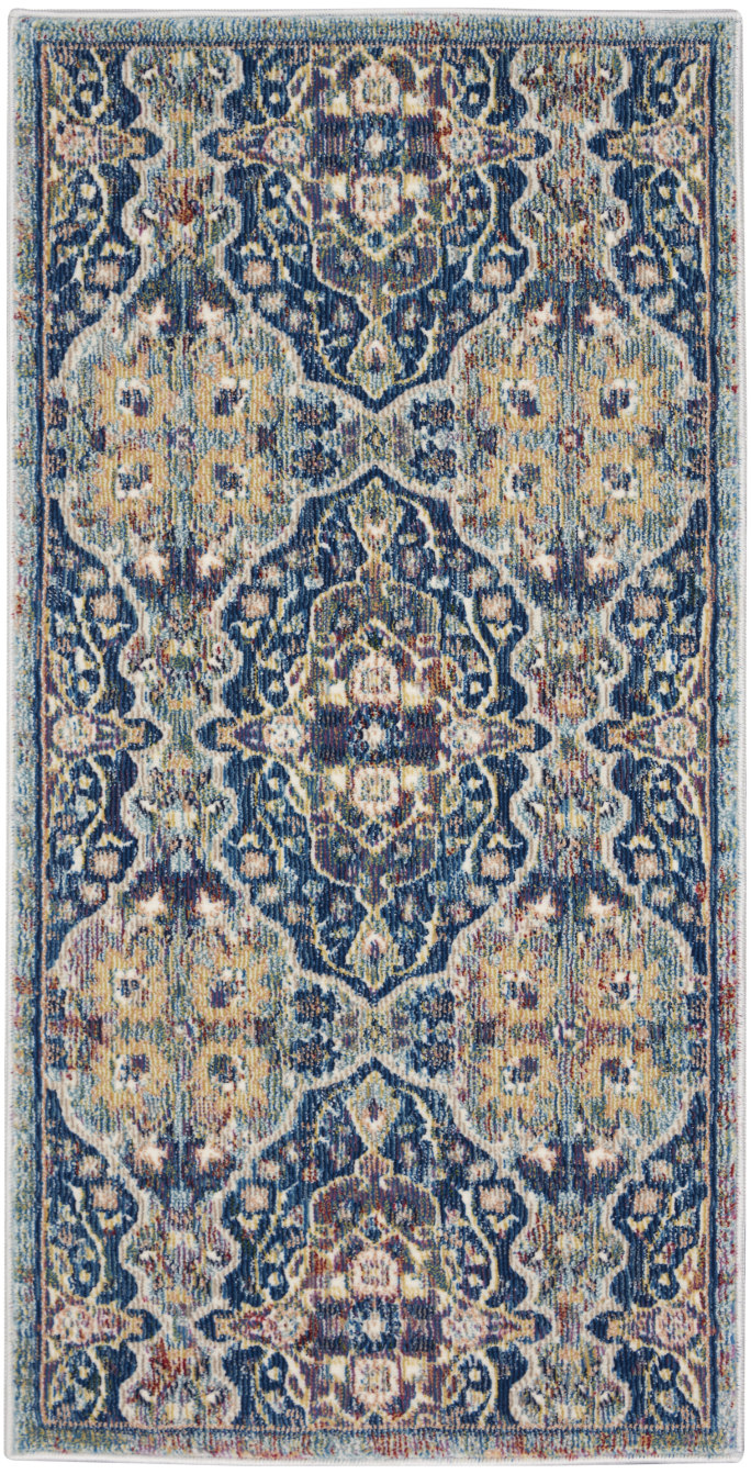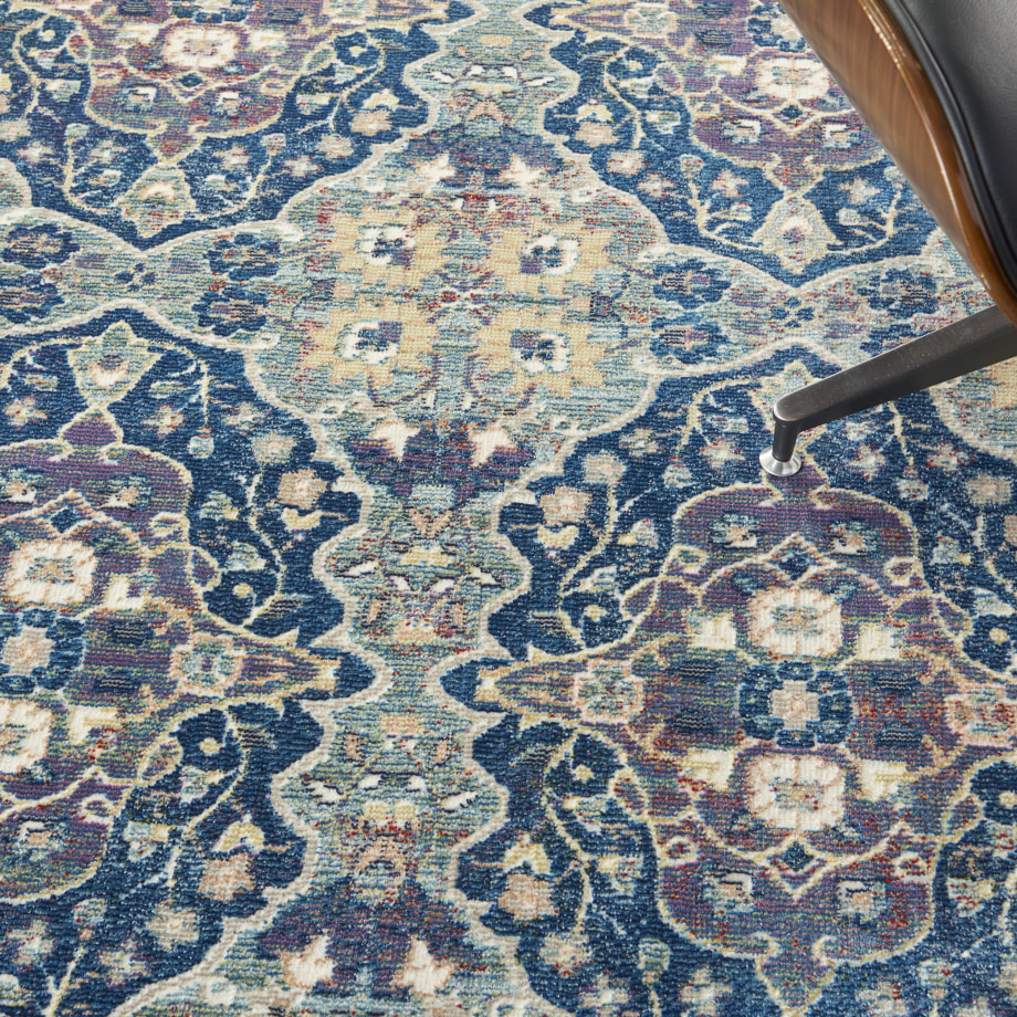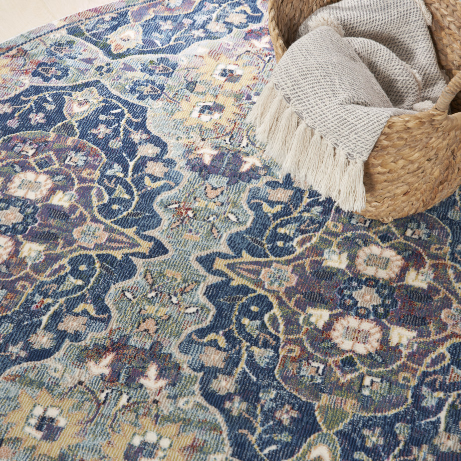 Lavishly ornate. The repeat floral arabesque pattern of this Ankara Global rug is a stunning centerpiece for the transitional design enthusiast. Presented in rich navy blue, muted grey, and yellow multicolor hues finished with light distressing, this design gives all of the signals of a vintage heirloom with the easy upkeep of a modern poly-fiber blend