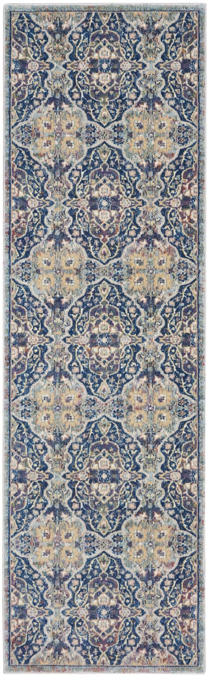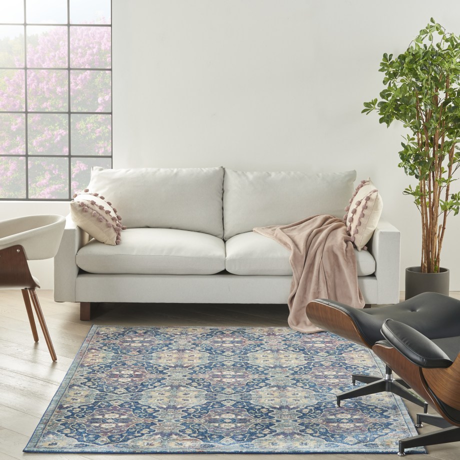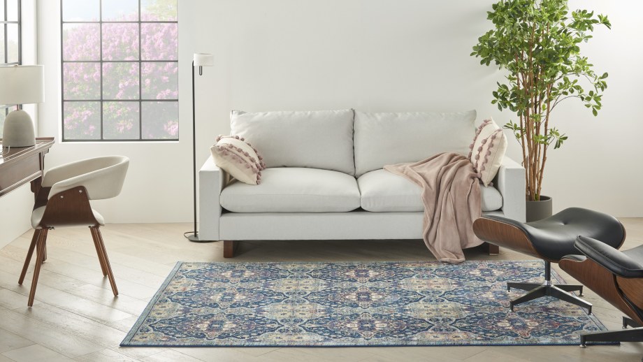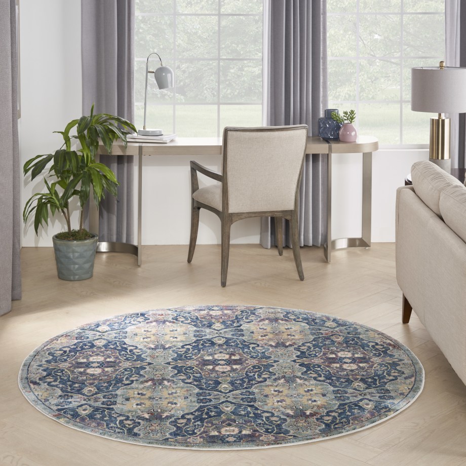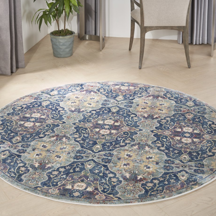 Lavishly ornate. The repeat floral arabesque pattern of this Ankara Global rug is a stunning centerpiece for the transitional design enthusiast. Presented in rich navy blue, muted grey, and yellow multicolor hues finished with light distressing, this design gives all of the signals of a vintage heirloom with the easy upkeep of a modern poly-fiber blend