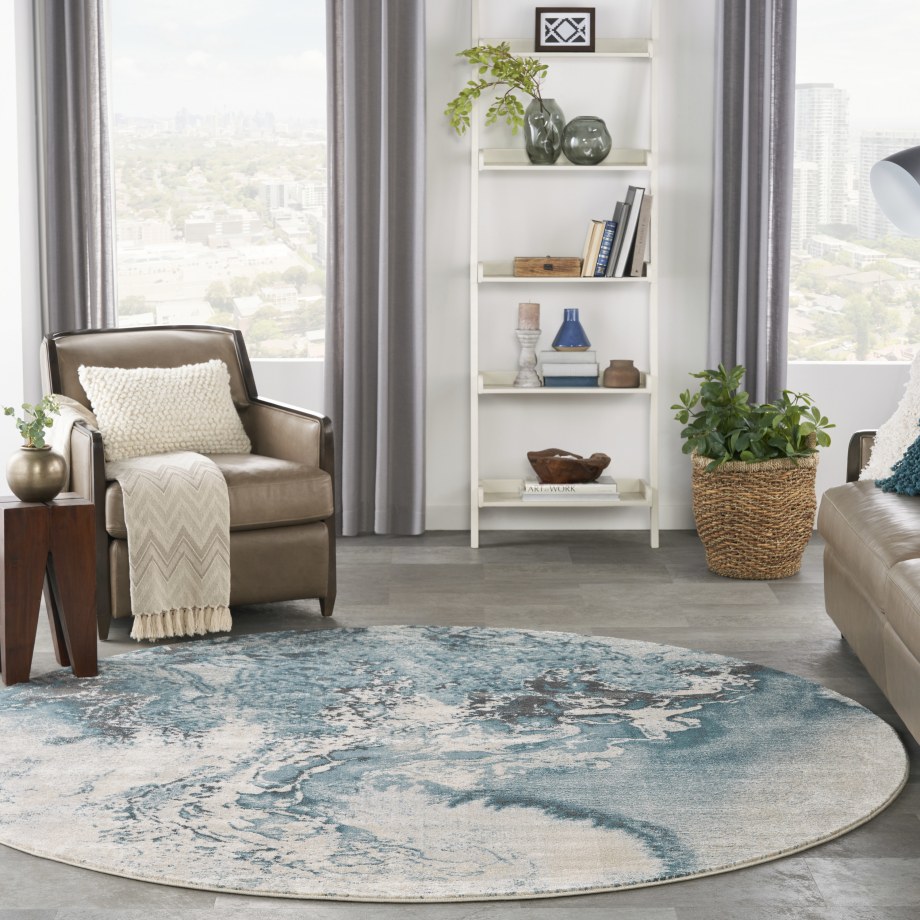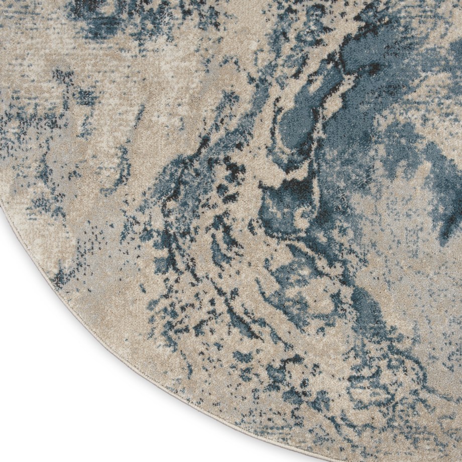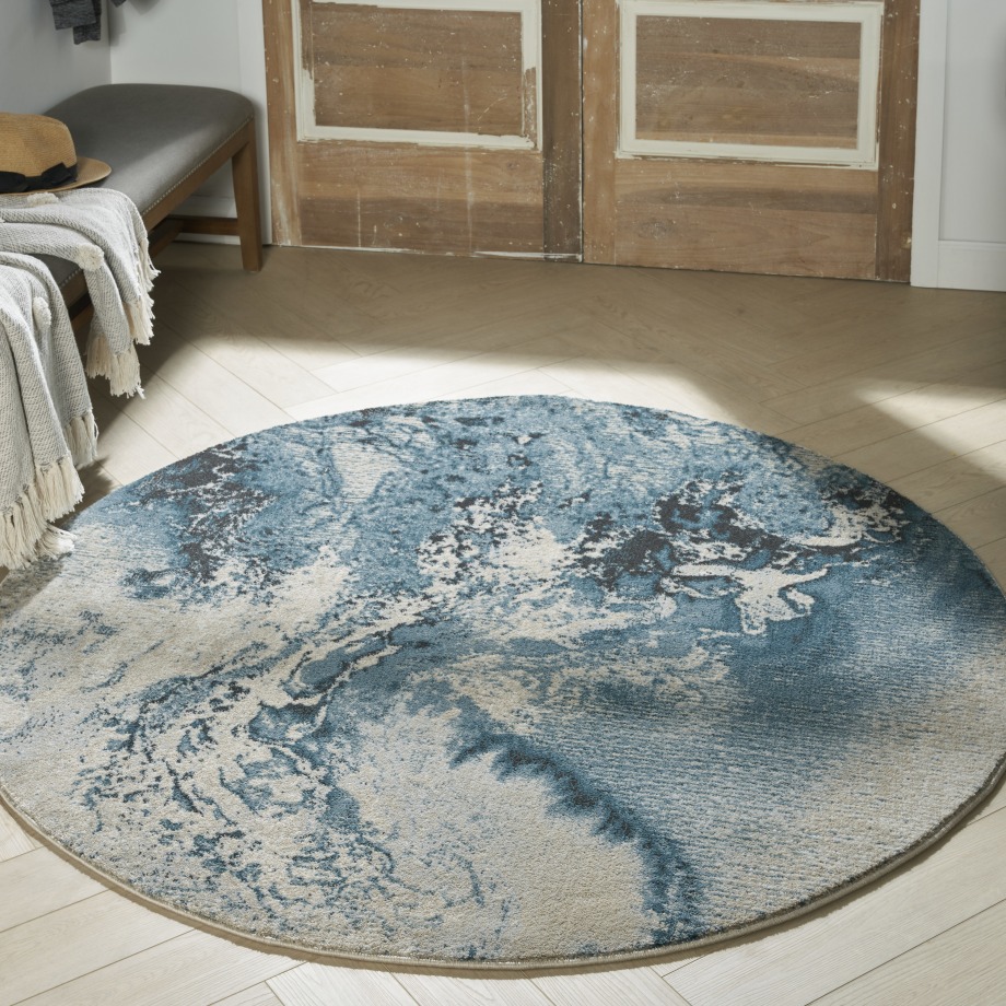 Drawing inspiration from the steady ripples of an ocean current, this abstract rug from the Maxell Collection makes a bold statement. Use it as the centerpiece for your living room furnishings, as a foundation for your home office, or a complement to your bedroom decor. With a medium-thick, 10mm polyester pile, it feels comfortably soft underfoot. Machine-made in a multi-tonal blend of ivory, teal, and dark blue.