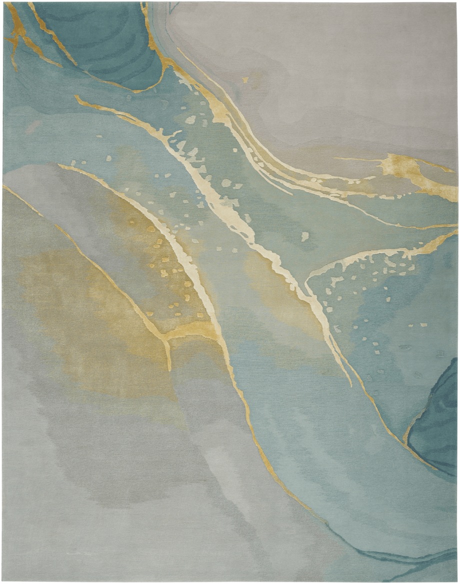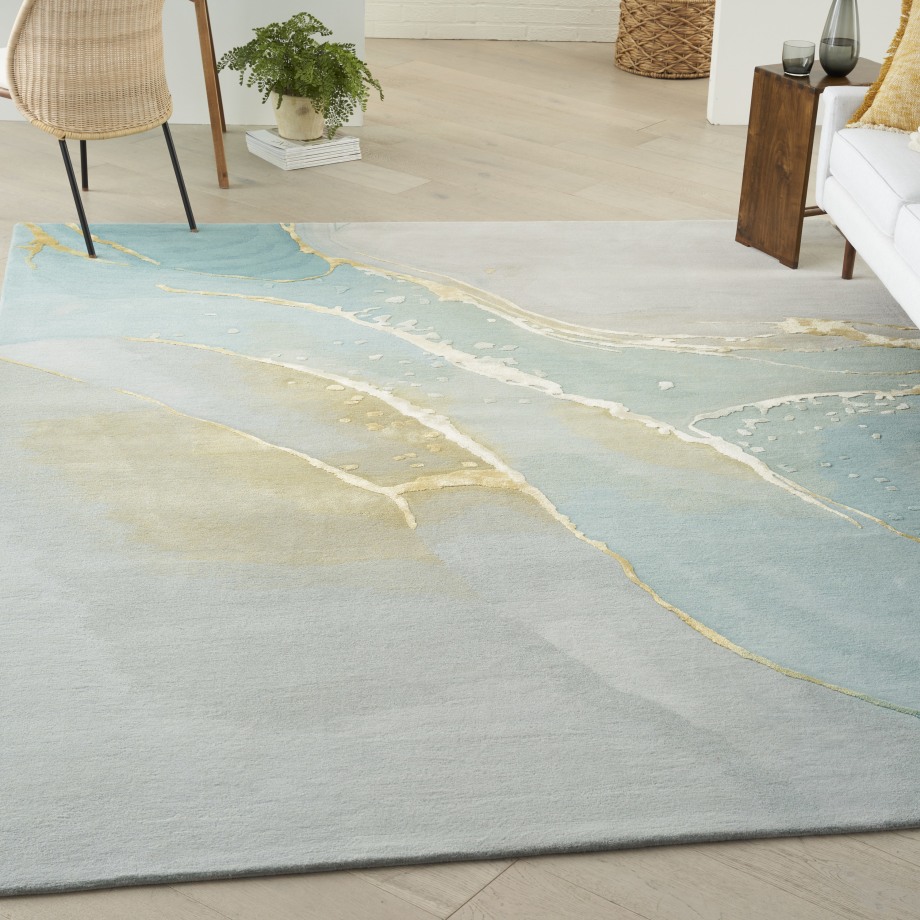 Evoke a sense of calm with this modern rug from the Prismatic Collection. Abstract ripples of grey and blue are accented by swirls of gold that seemingly radiates from its softly hued ground. Hand carved for an added sense of depth, its a standout foundation for your living room or bedroom dcor. This handmade rug is crafted from a fabulously textured blend of New Zealand wool and silky Luxcelle.