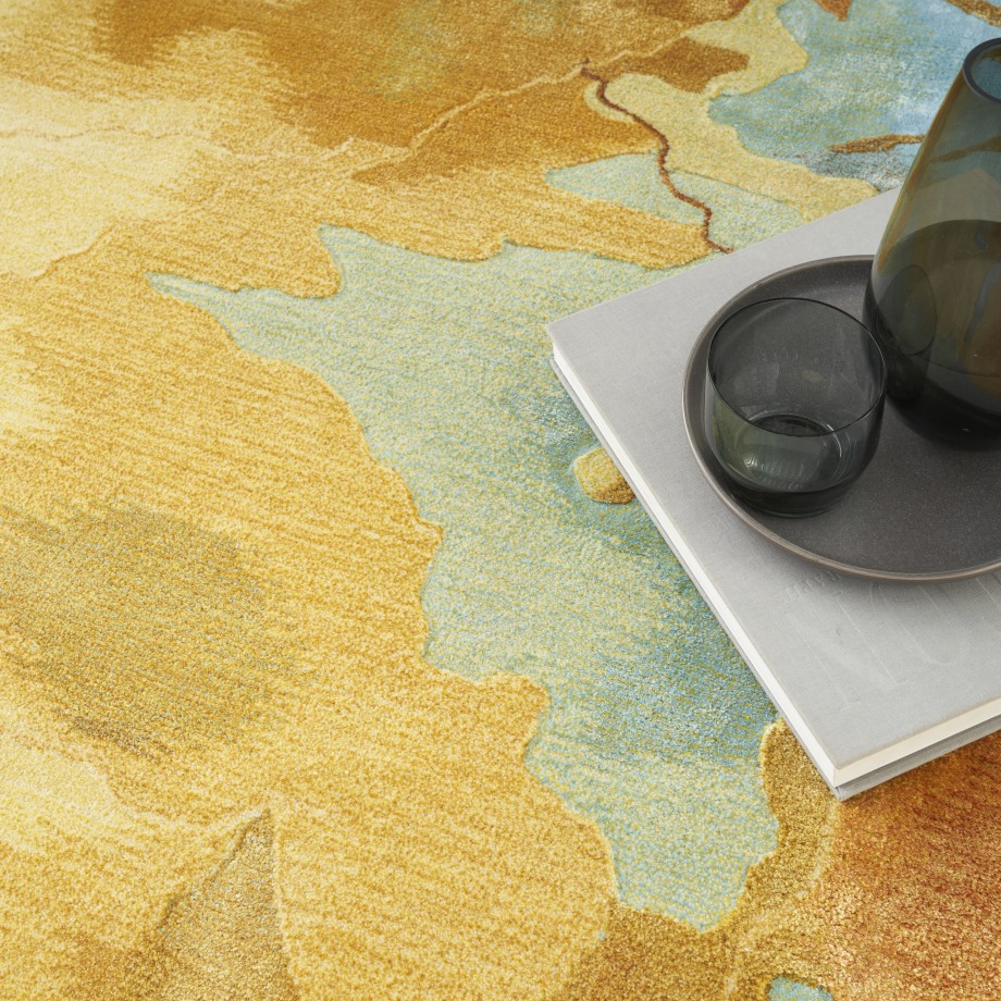 The nuanced colours of dawn are spectacularly displayed in abstract fashion on this modern rug from the Prismatic Collection. Shades of golden yellow, orange, and burnt red appear to glow atop its blue ground, with carved accents that add a unique layer of dimension. Handmade from a luxurious blend of New Zealand wool and silky Luxcelle, its a stunning focal point for your living room decor.