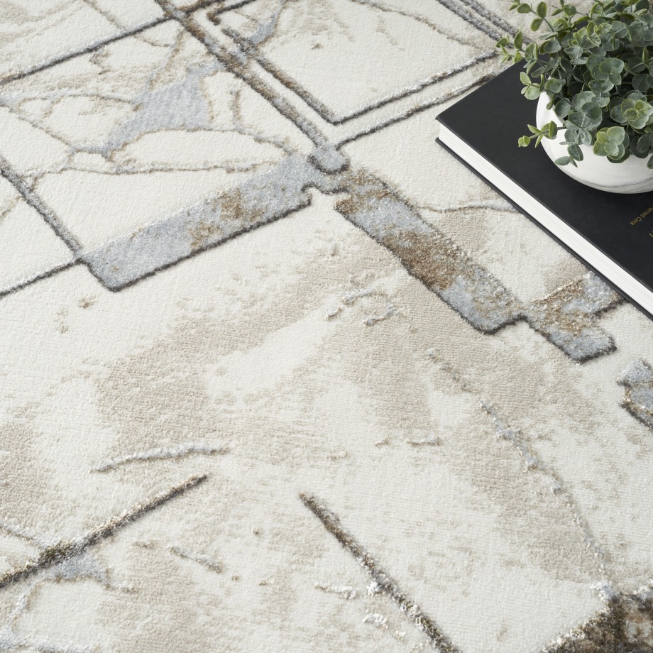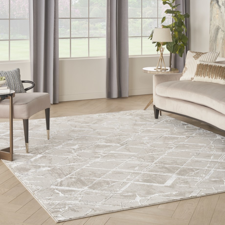 This abstract rug from the Glitz Collection adds modern style with a touch of glam. The marble-like pattern is layered with a broken geometric design that emulates the look of an expertly hand-carved rug. A shimmering finish adds an additional layer of depth and movement, with a softly textured polyester pile that feels wonderfully soft underfoot.