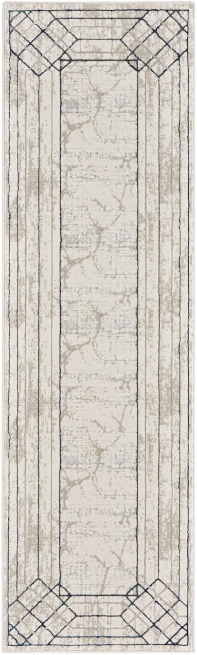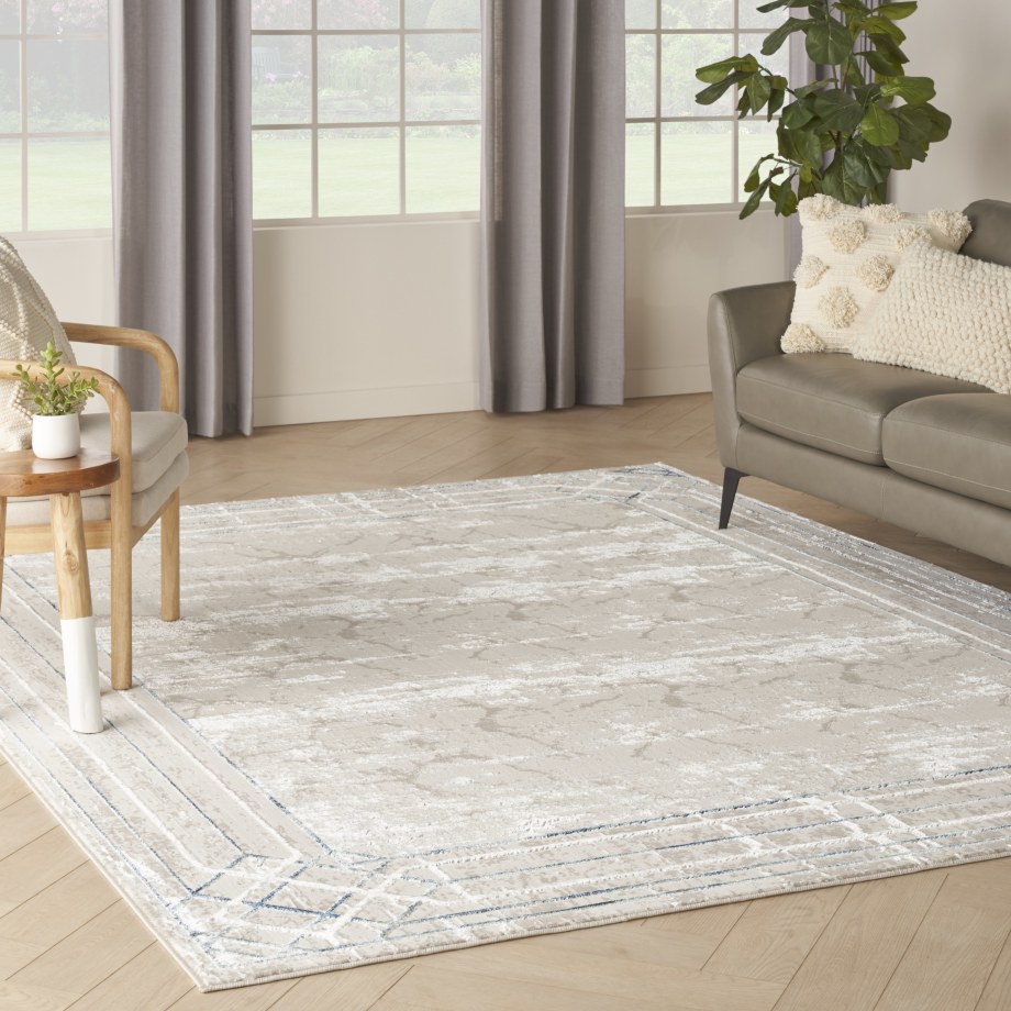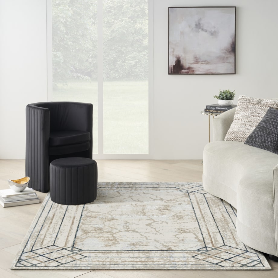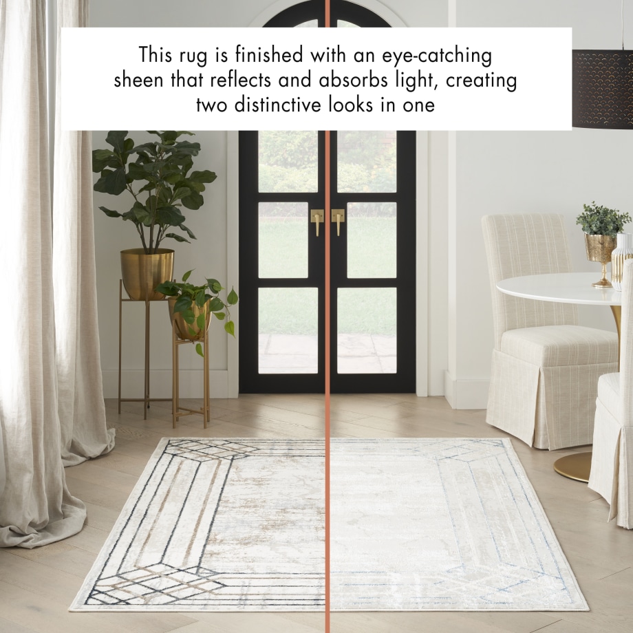 Transport your living room or bedroom to Hollywood’s golden age with this Art Deco rug from the Glitz Collection. The abstract, marble-like pattern is framed by an ornate geometric border in blue and beige, enhanced with a subtly raised texture that adds visual intrigue. Finished with a glamorous sheen that shifts in different light, this contemporary rug is made from softly textured polyester.