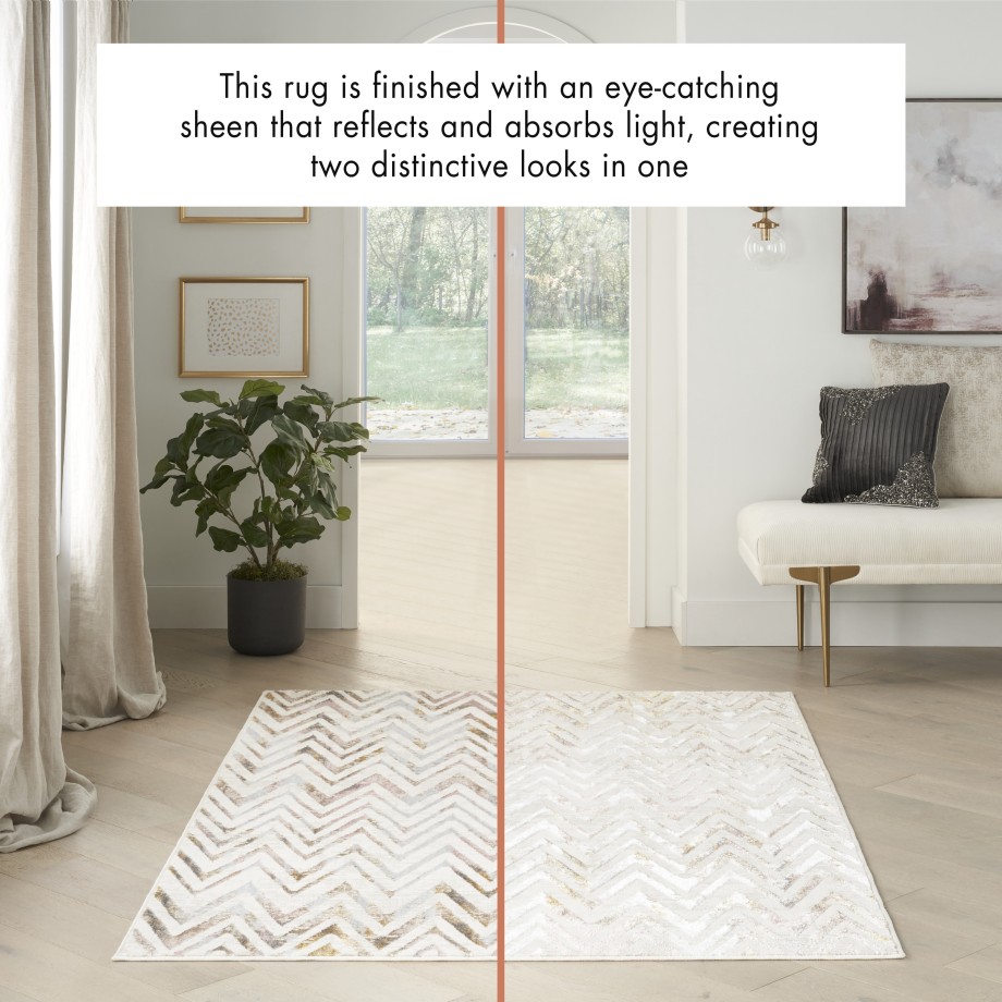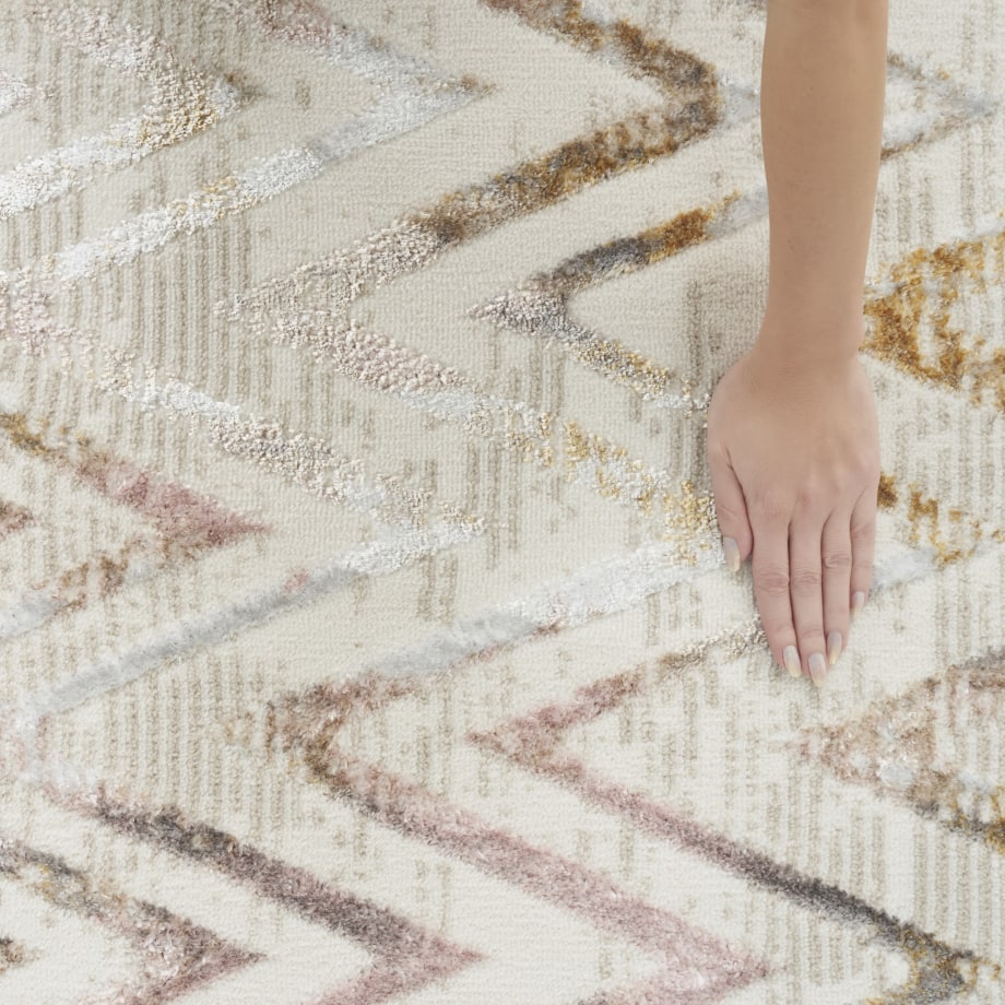 The classic chevron pattern gets a modern update with this contemporary rug from the Glitz Collection. The geometric design is presented in soft multicolored shades with a subtly distressed finish and shimmering accents that shift under different lighting. Made from softly textured, easy to clean polyester yarns.