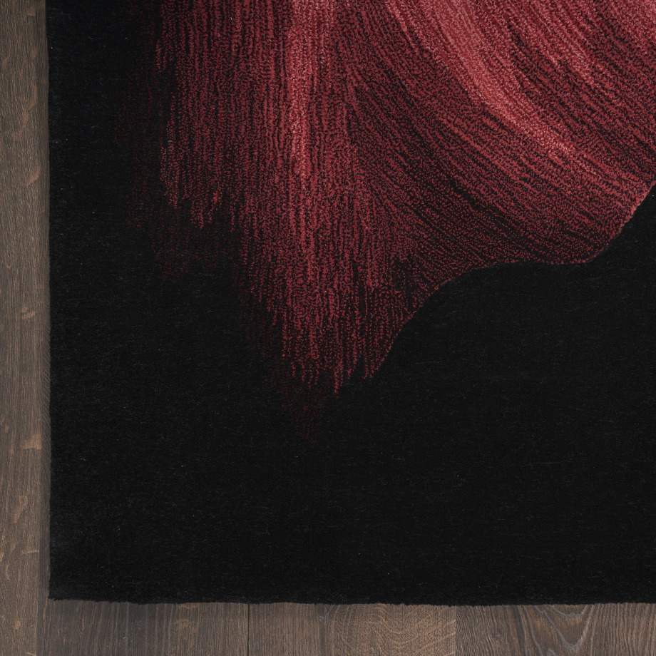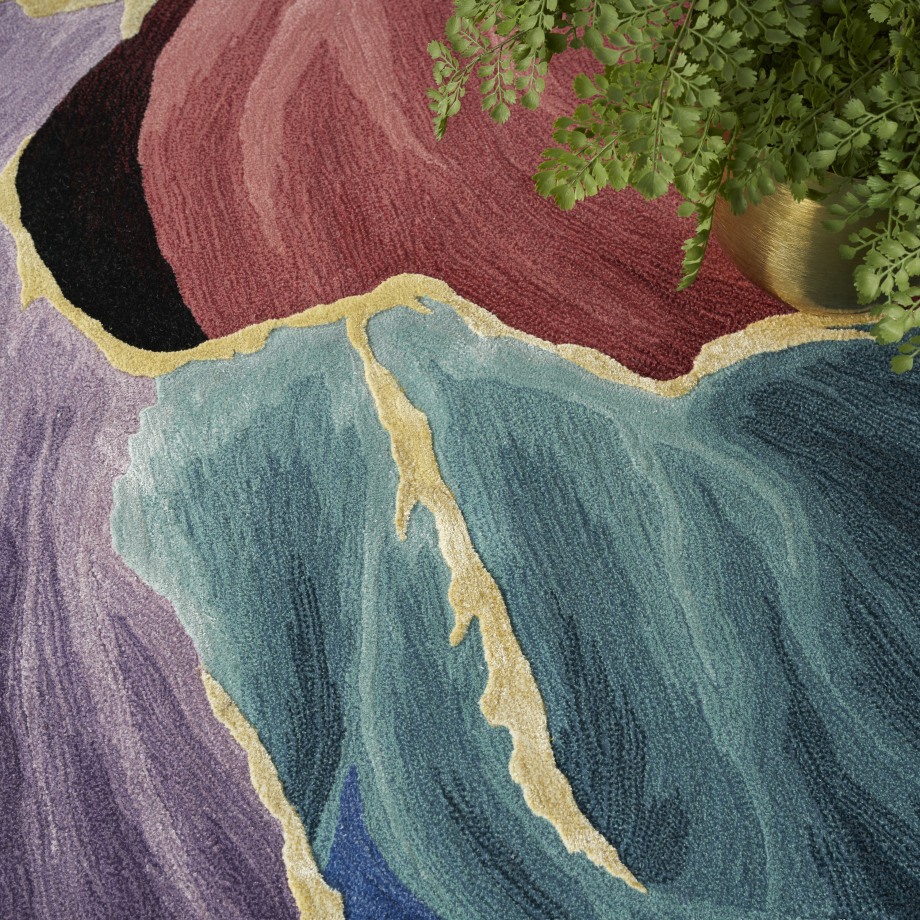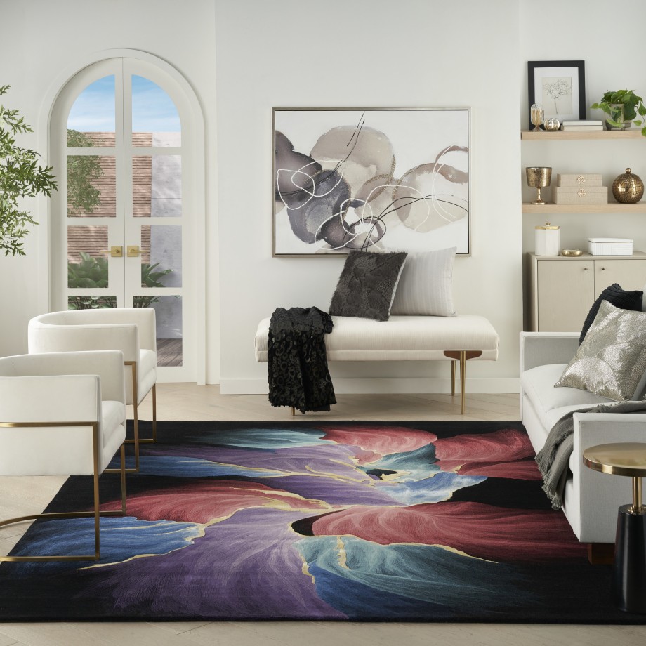Bring mesmerizing style to your living room or bedroom with this abstract rug from the Prismatic Collection. Vibrant strokes of purple, blue, red, and gold create movement across the solid black ground, which is enhanced with carved accents that add an eye-catching sense of depth. Handmade from a blend of premium New Zealand wool and silky Luxcelle™.
