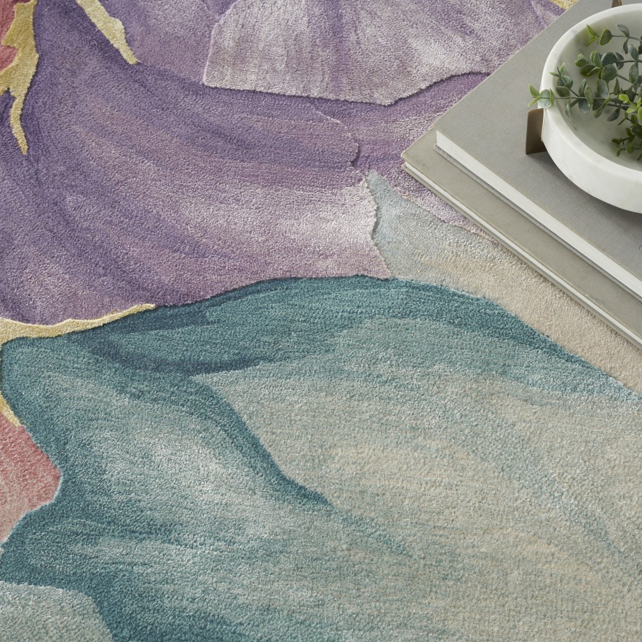 Bring mesmerizing style to your living room or bedroom with this abstract rug from the Prismatic Collection. Vibrant strokes of purple, blue, pink, and gold create movement across the solid ivory ground, which is enhanced with carved accents that add an eye-catching sense of depth. Handmade from a blend of premium New Zealand wool and silky Luxcelle™.