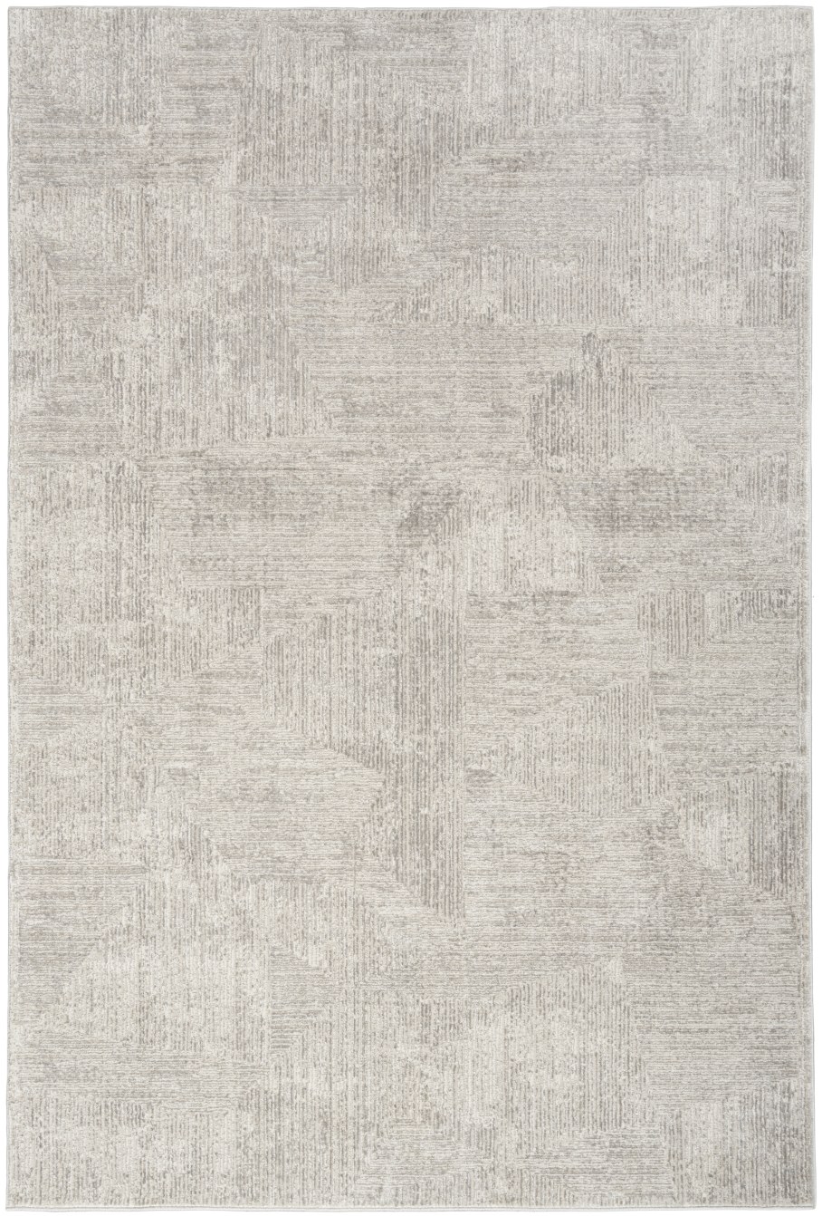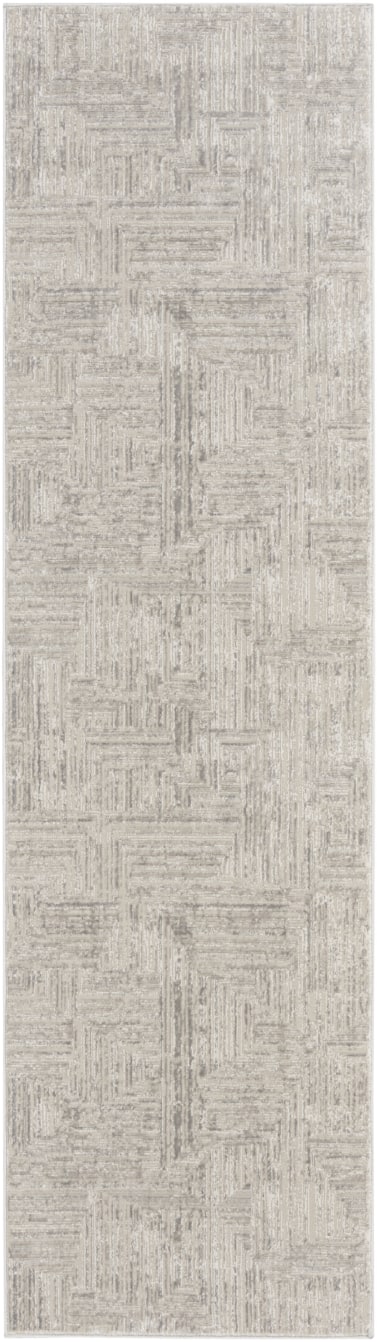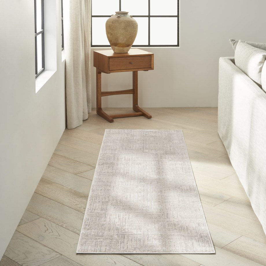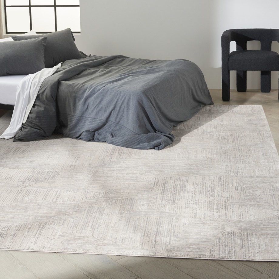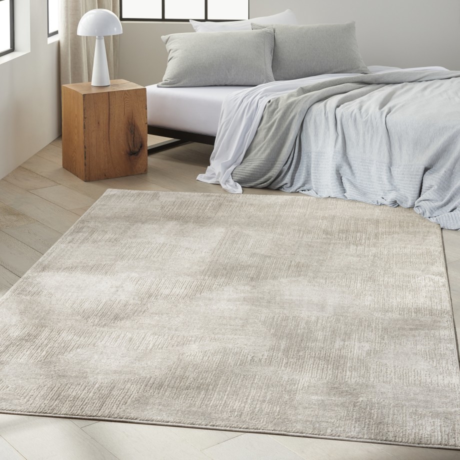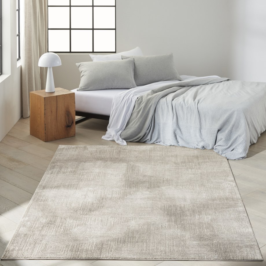 This abstract rug from the Calvin Klein Irradiant Collection brings minimalist energy to your home. An overlapping linear pattern, presented in cream and black tones, is enhanced by subtle texture variations and a vivid sheen. Machine-made from polyester for modern living.