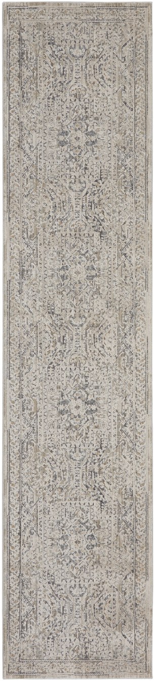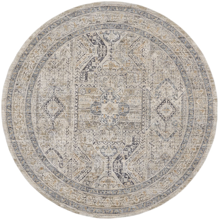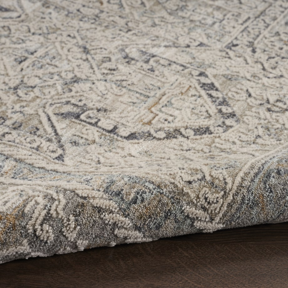 Complement your eclectic style with this boho rug from the Lynx Collection. A classic Persian center medallion pattern is surrounded by intricate botanical motifs, framed by a matching border. The vintage design is enhanced by subtly raised accents that add a unique layer of depth. This ivory, grey, and blue rug is finished at each end with short fringe and metallic serged sides. Runners do not include the fringe.