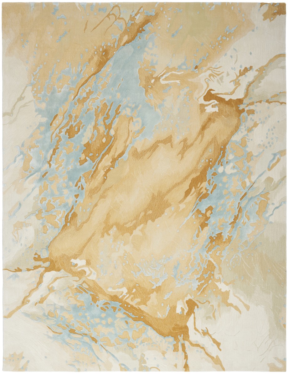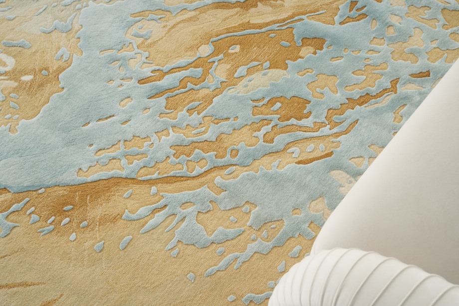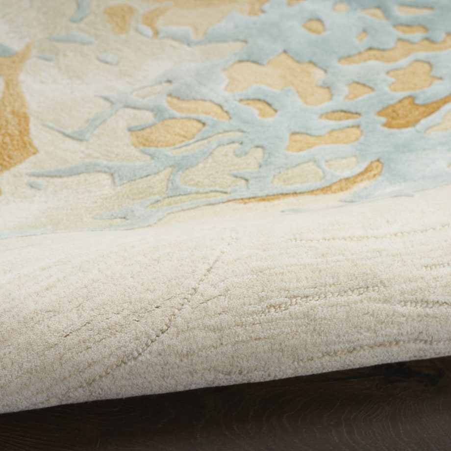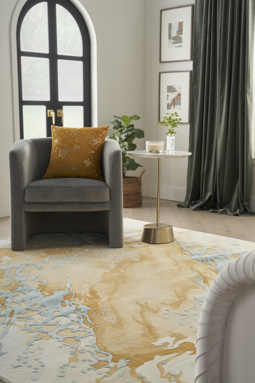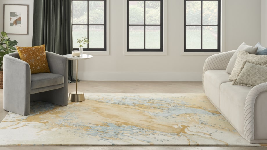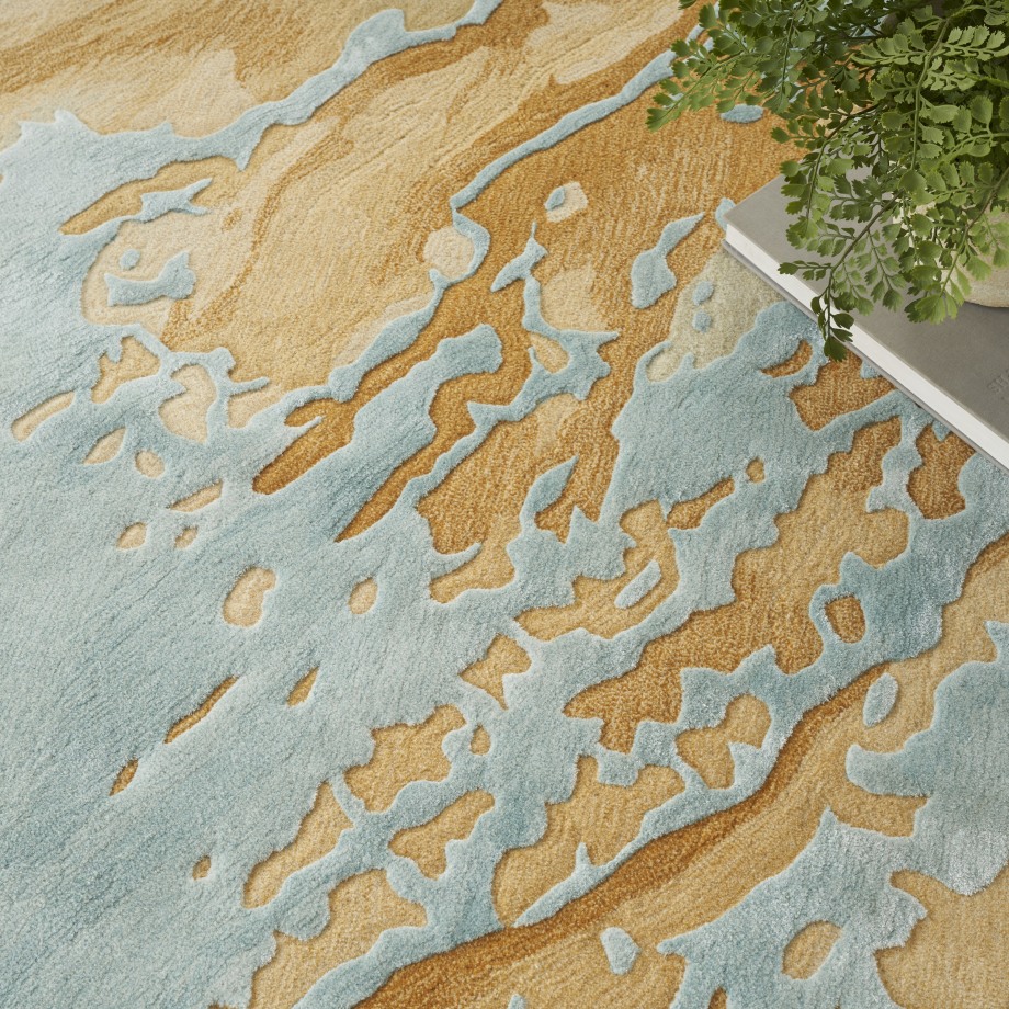 Express your unique style with this abstract rug from the Prismatic Collection. Splashes of blue and gold, enhanced with carved textural accents and an eye-catching sheen, create a stunning focal point for your living room or bedroom décor. This modern rug is handmade from a blend of fine New Zealand wool and shimmering Luxcelle yarns in a comfortable, medium-thick pile that adds an instant layer of warmth.