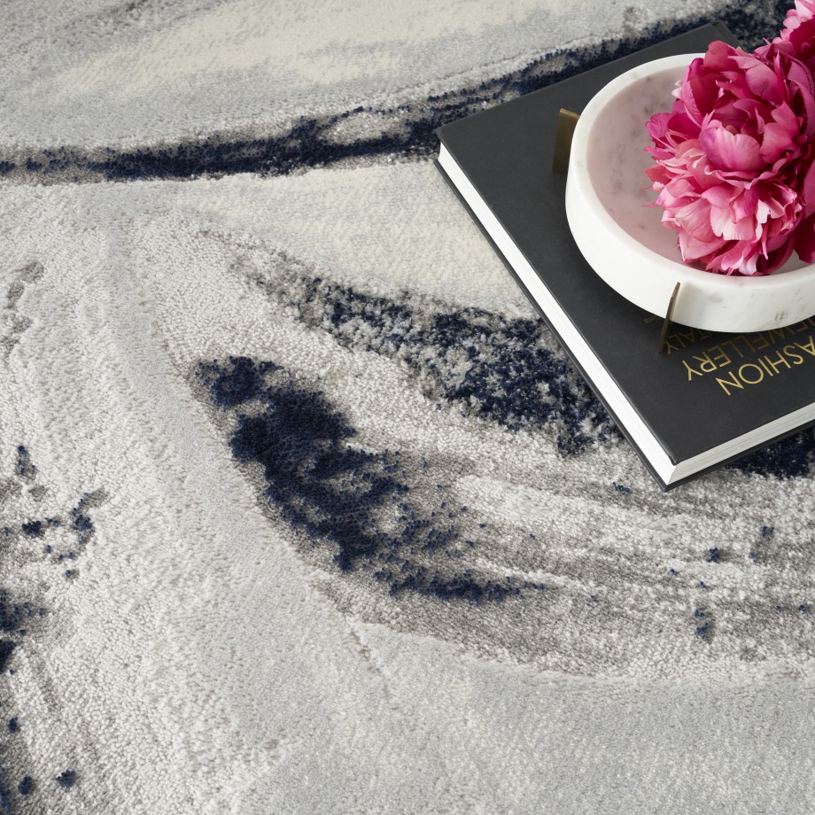 This abstract rug from the Inspire Me! Home Décor Brushstrokes Collection adds soft texture and standout style to your home. The freeform pattern, inspired by modern artistry, helps you create a foundation for your own creative haven. Presented in shades of grey and navy blue, this contemporary rug is enhanced with a high-low texture and metallic shimmering accents designed to turn heads.
