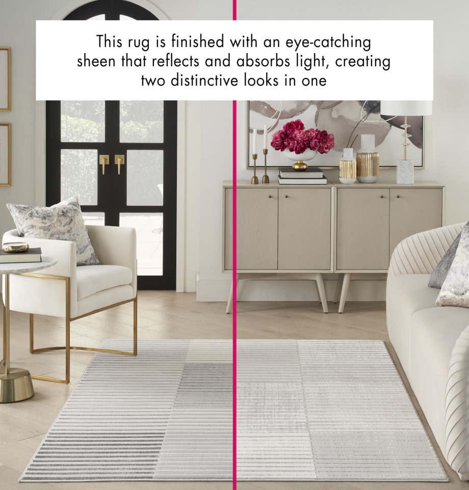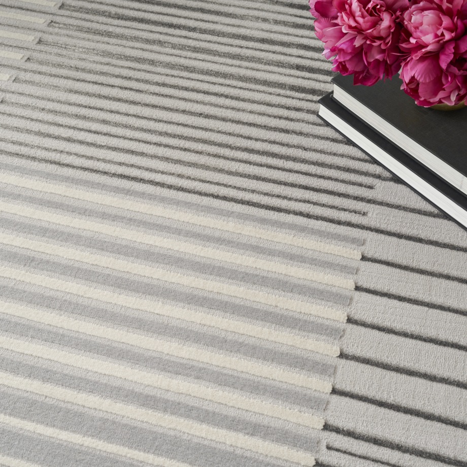 Add an instant touch of modern glamour to your home with this silver-grey striped rug from the Inspire Me! Home Décor Brushstrokes Collection. Rows of stripes of varying sizes, enhanced with a metallic shimmer that shifts in tone under ambient lighting, create a visually appealing look designed to spark conversation. This contemporary rug has a softly textured high-low pile that offers comfort and warmth.