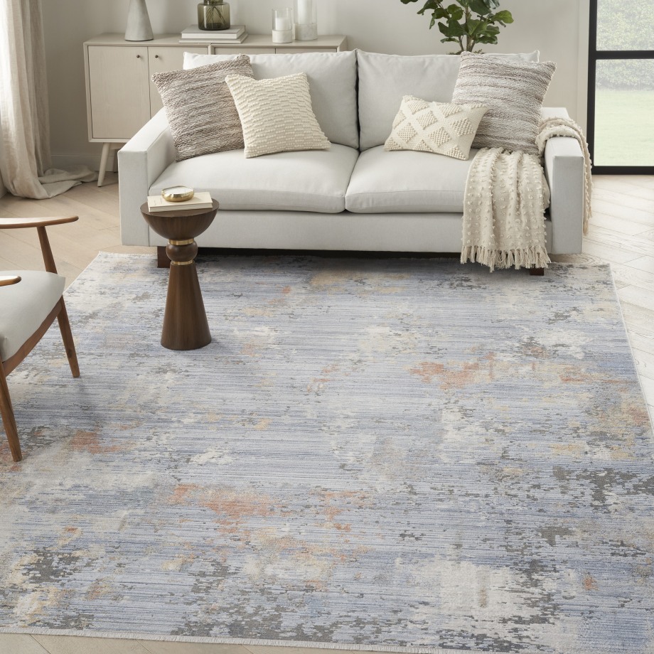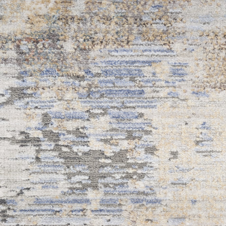 Add a cool and refined look to your home with this modern rug from the Abstract Hues Collection. The abstract design, presented in shades of grey and blue, has a subtly ribbed high-low pile that offers intriguing texture, which is finished at both ends with a short fringe. Made from polyester yarns enhanced with a silk-like sheen that reflects and absorbs light. Runner rugs do not include the fringe.