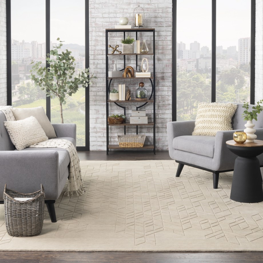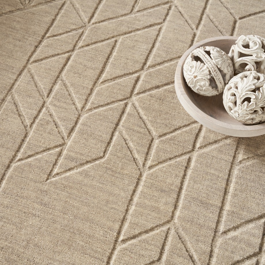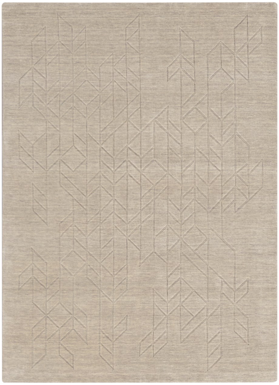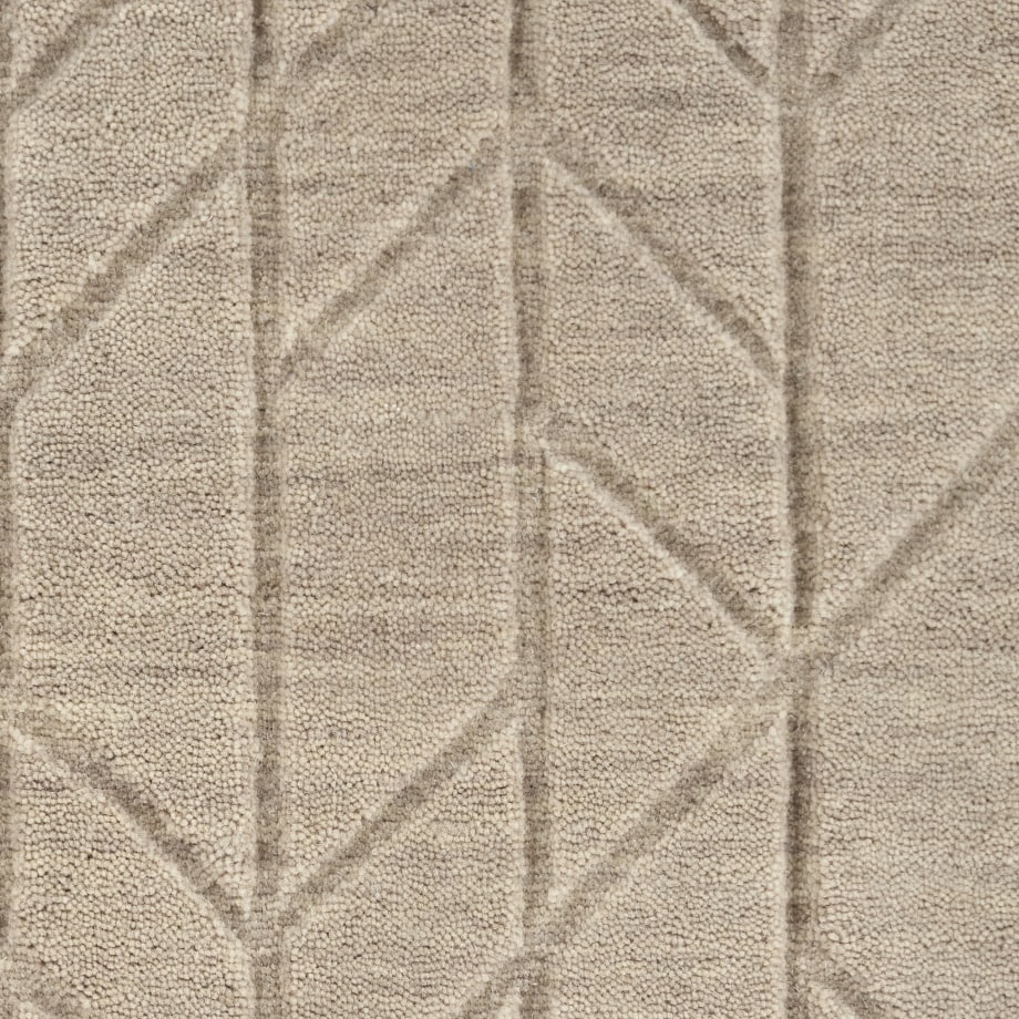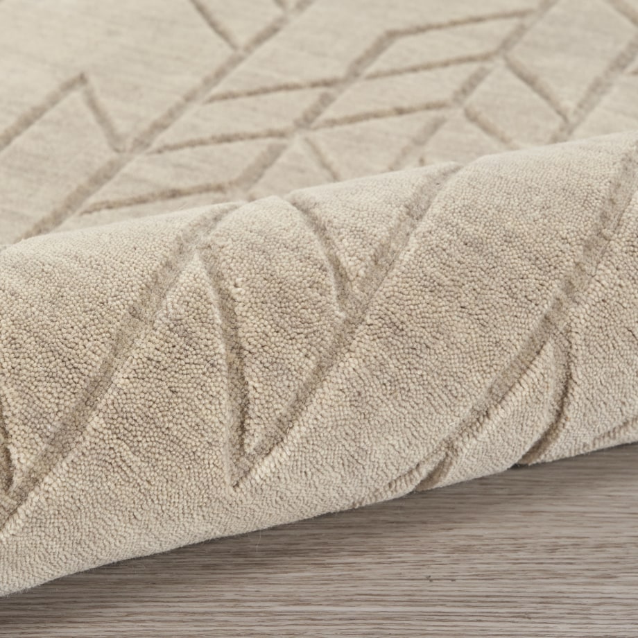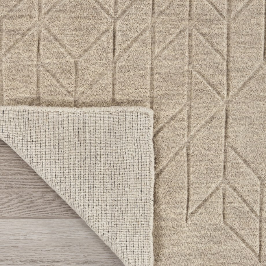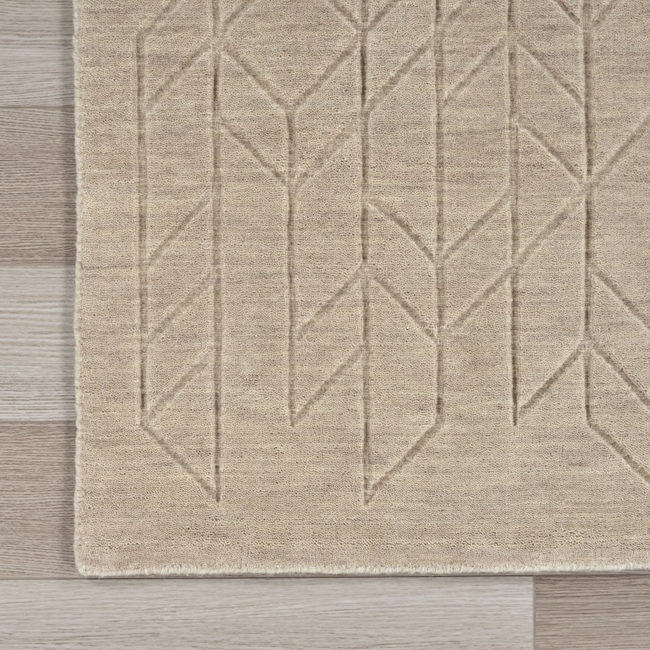 This modern beige rug from the Alessia Collection adds cozy style to your décor. Effortlessly blending style and function, this neutral rug features a heathered ground that adds nuanced color variations, a carved geometric pattern that offers a subtle layer of depth, and a medium-thick pile that has a softly cushioned texture. Handmade from 100% European wool; no backing.