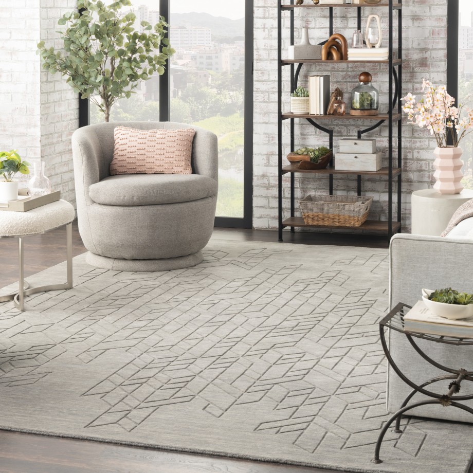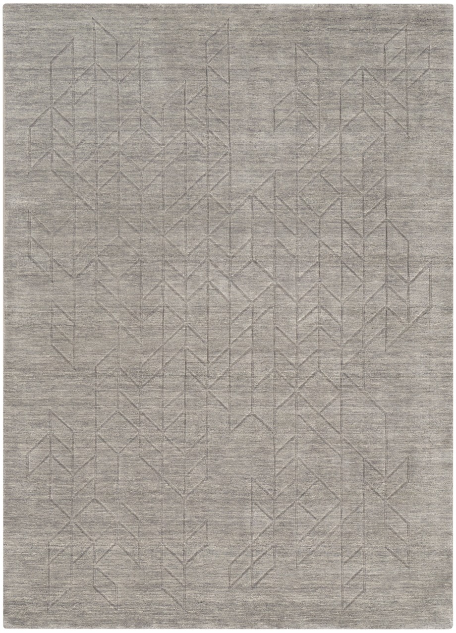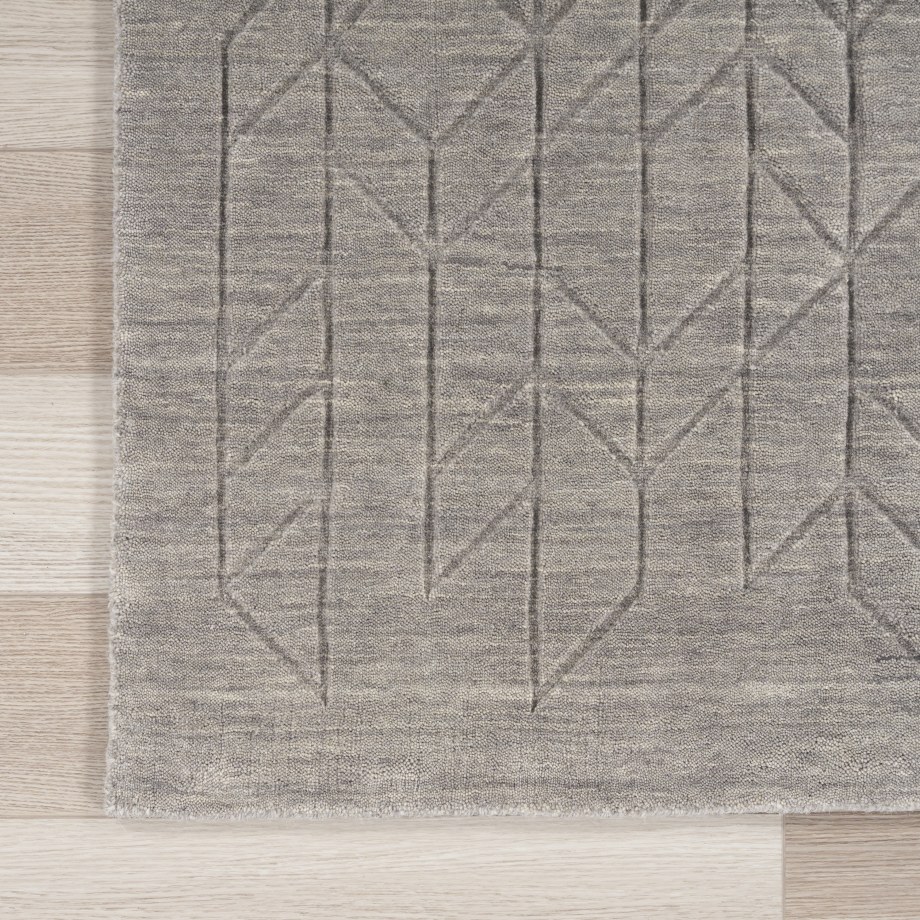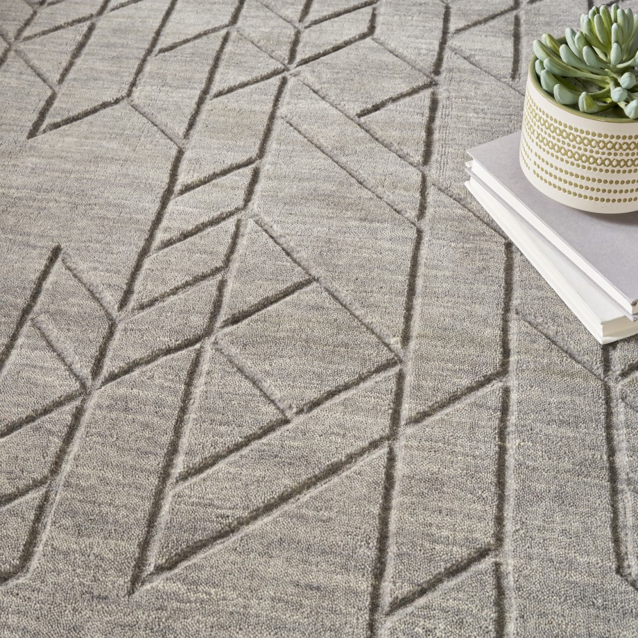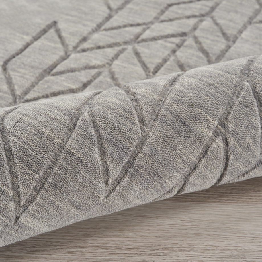 This modern grey rug from the Alessia Collection adds cozy style to your decor. Effortlessly blending style and function, this neutral rug features a heathered ground that adds nuanced color variations, a carved geometric pattern that offers a subtle layer of depth, and a medium-thick pile that has a softly cushioned texture. Handmade from 100% European wool; no backing.