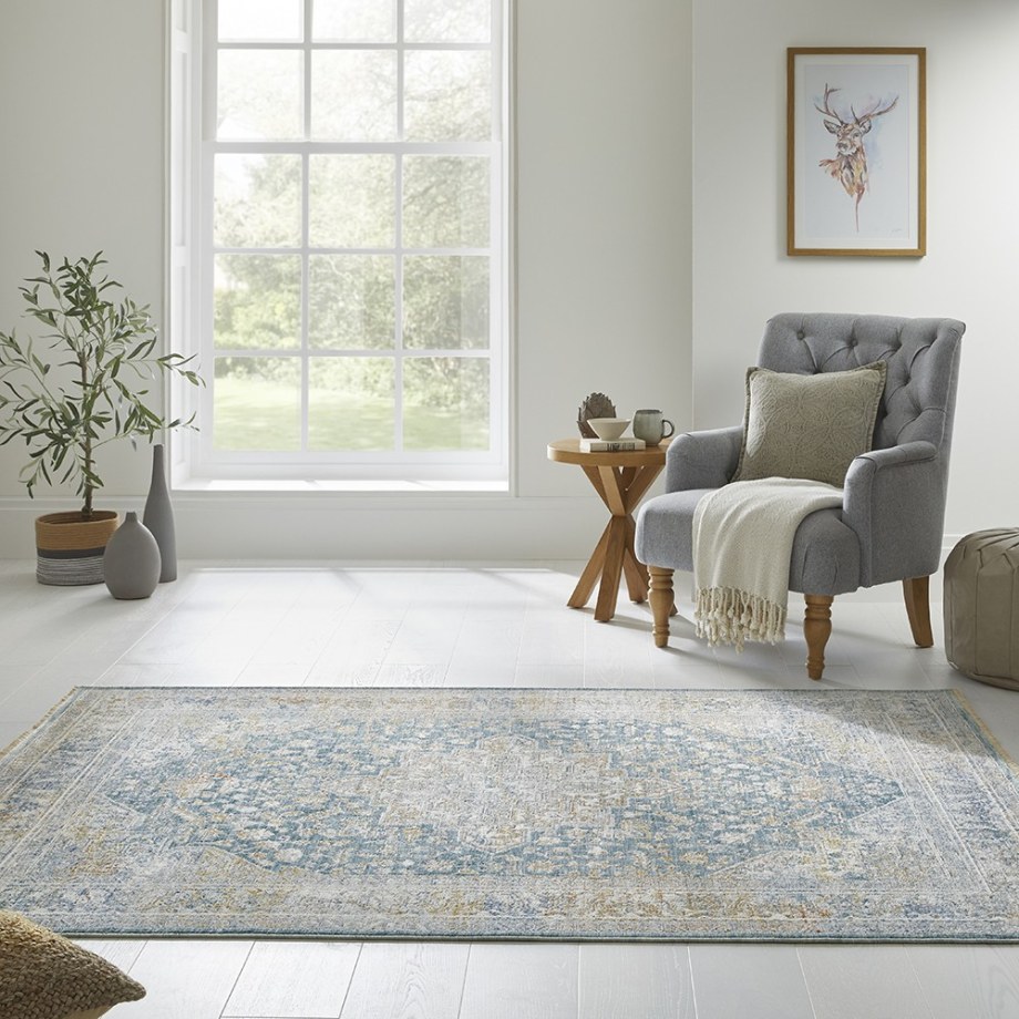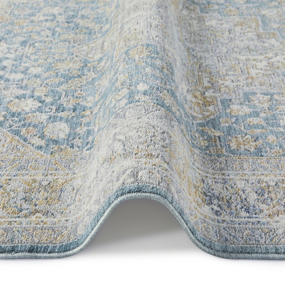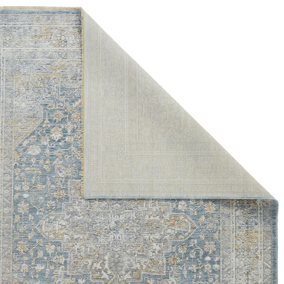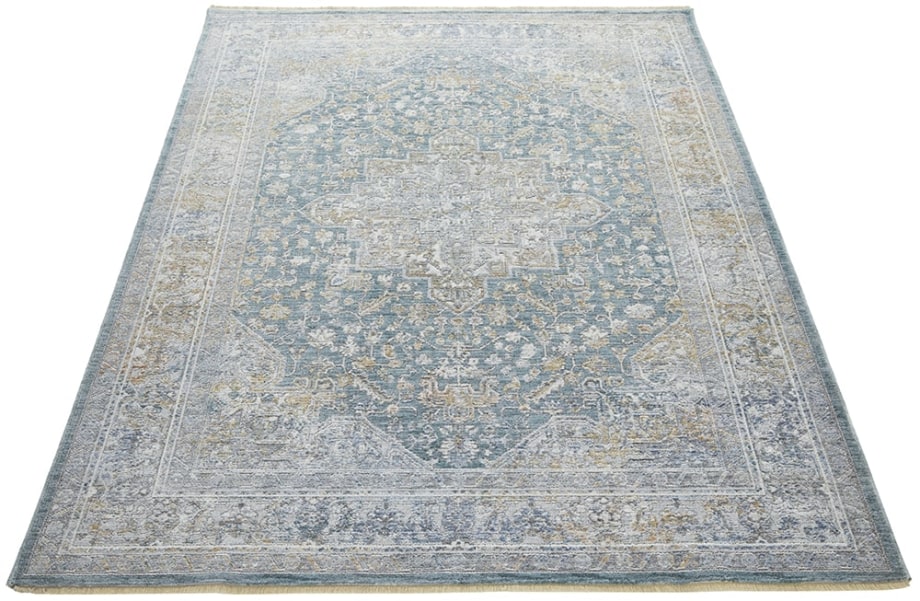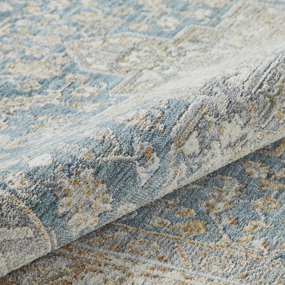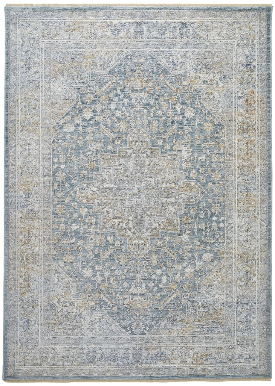 Bring a storied look to your home with this Persian rug from the Elegant Heirlooms Collection. The ornate floral medallion pattern is enhanced with a space-dyed effect that channels the unique tonal imperfections of a handmade heirloom. This vintage-style rug, presented in blue/green, grey, gold, and ivory tones, is made from low-profile polyester yarns that capture and reflect light. Elegant Heirlooms is finished at both ends with a short fringe; runner rugs do not include the fringe.