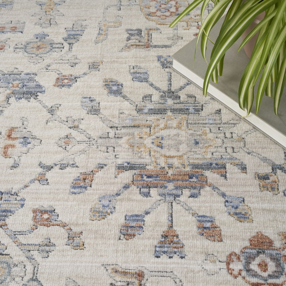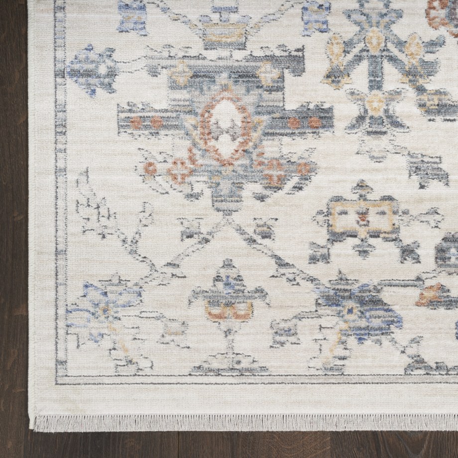 Invite a sense of character to your surroundings with this Persian rug from the Elegant Heirlooms Collection. The classic floral design, presented in shades of ivory, blue, grey, and brick, is finished with a vintage fade that adds an instant touch of coziness and warmth. Space-dyed yarns mimic the tonal imperfections of a treasured heirloom, which is completed at both ends with a short fringe. Made from polyester yarns enhanced with a soft sheen that shifts in tone with changes in light. Runner rugs do not include the fringe.